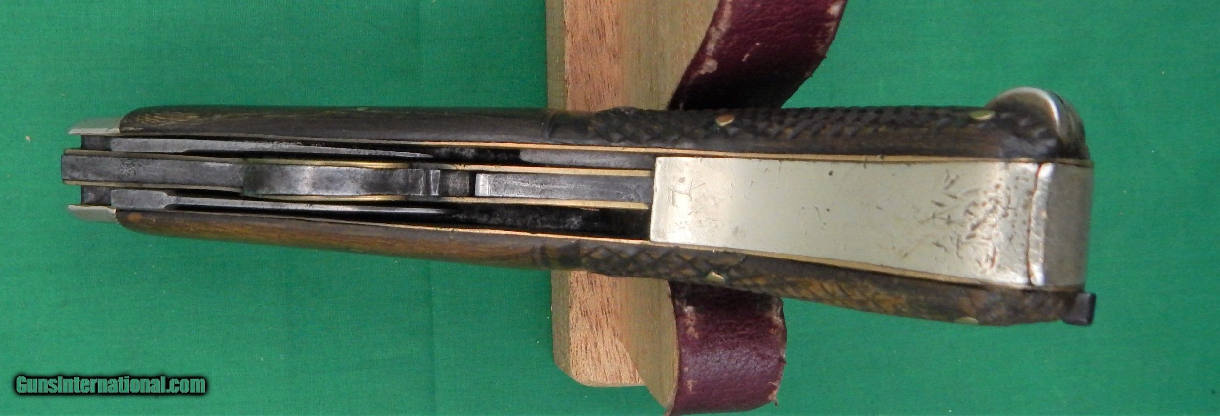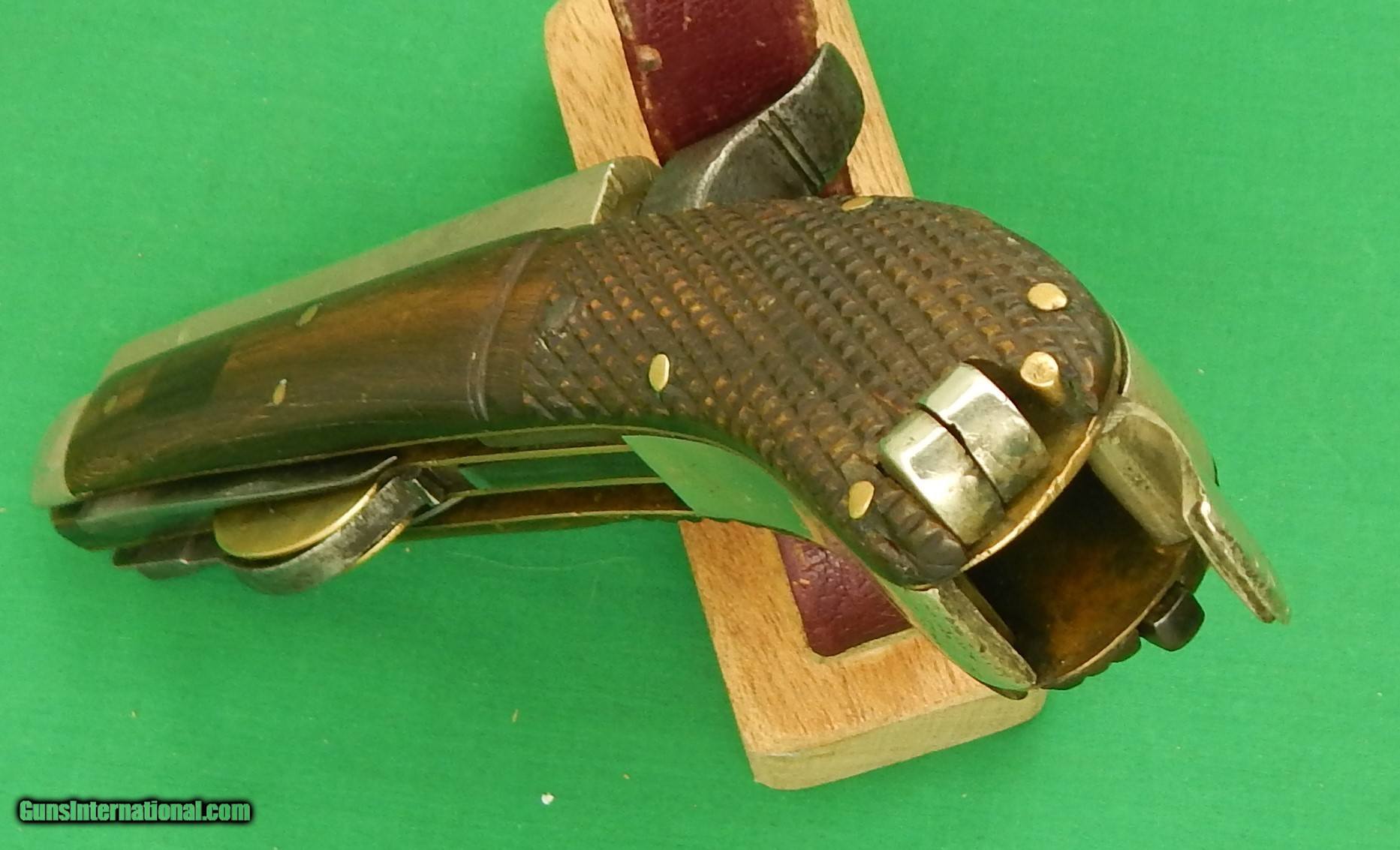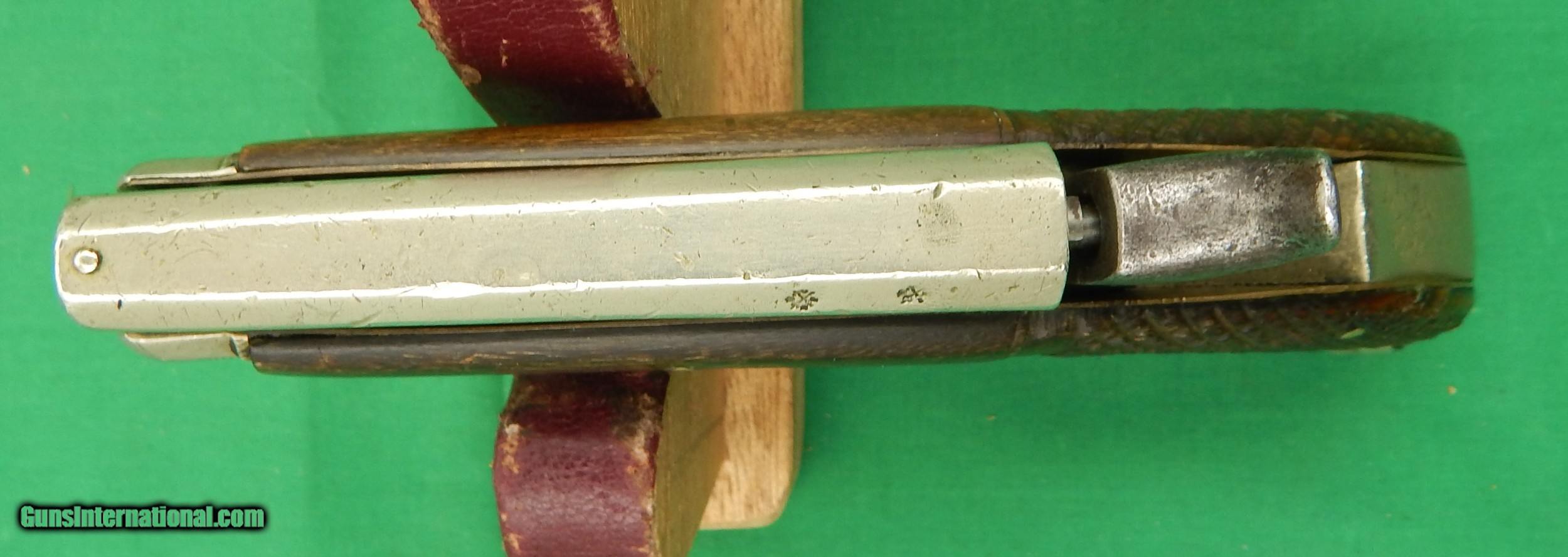 Description: Unique UNWIN & ROGERS Combination Percussion Knife Pistol, Circa 1850, .28 Caliber single shot, 3" barrel, Two knife blades fold out marked UNWIN & ROGERS NON XLL, folding trigger, Very good checkered Horn grips, comes with the two original tools, Bullet Mold and Tweers, Rear cap box, Heavy, rugged little item. Blades are in fair condition, one has been narrowed down. Overall very good condition. MO plus $16.50 Shipping SOLD Antique: Yes |