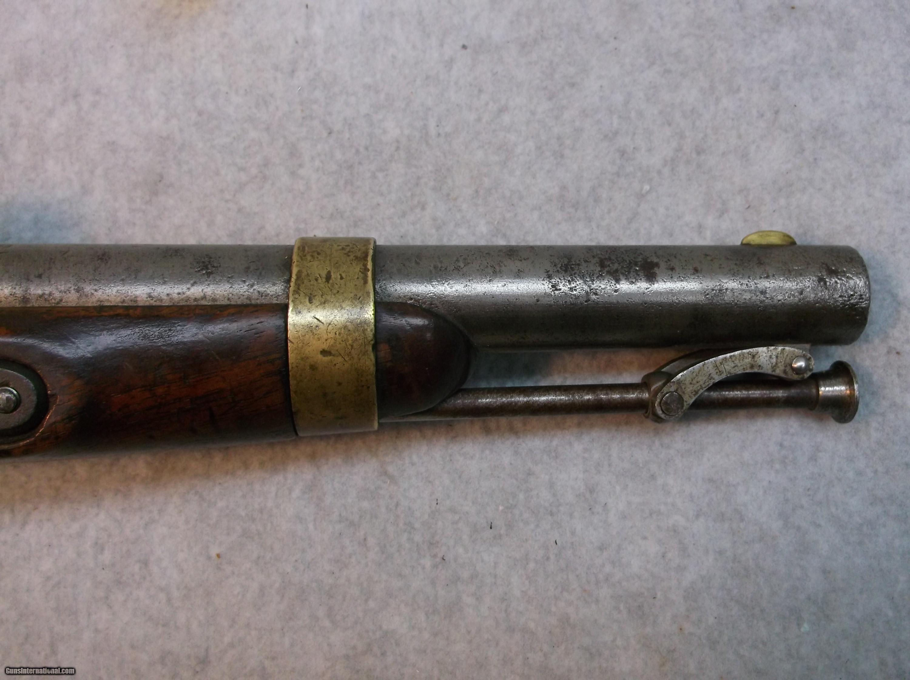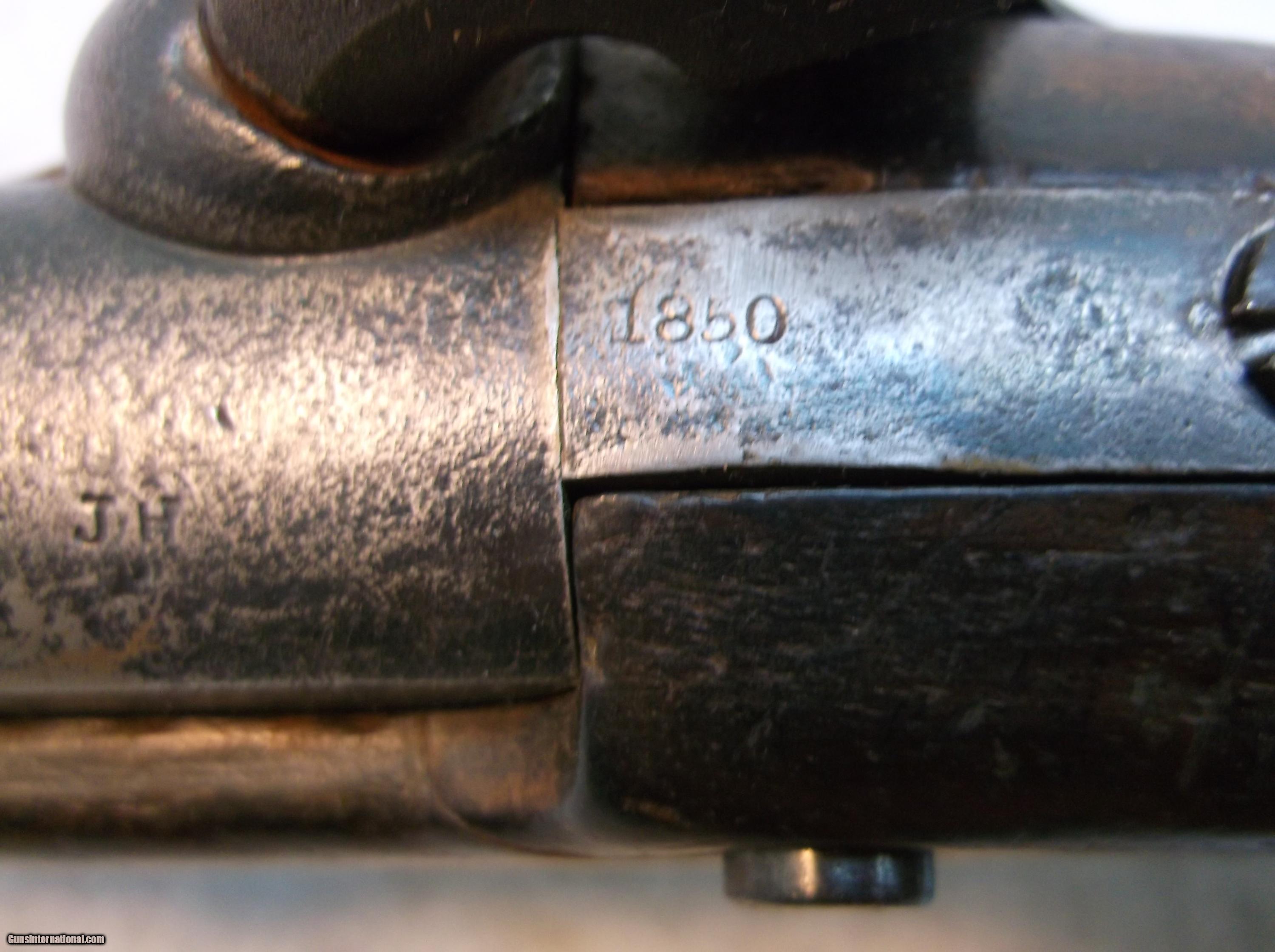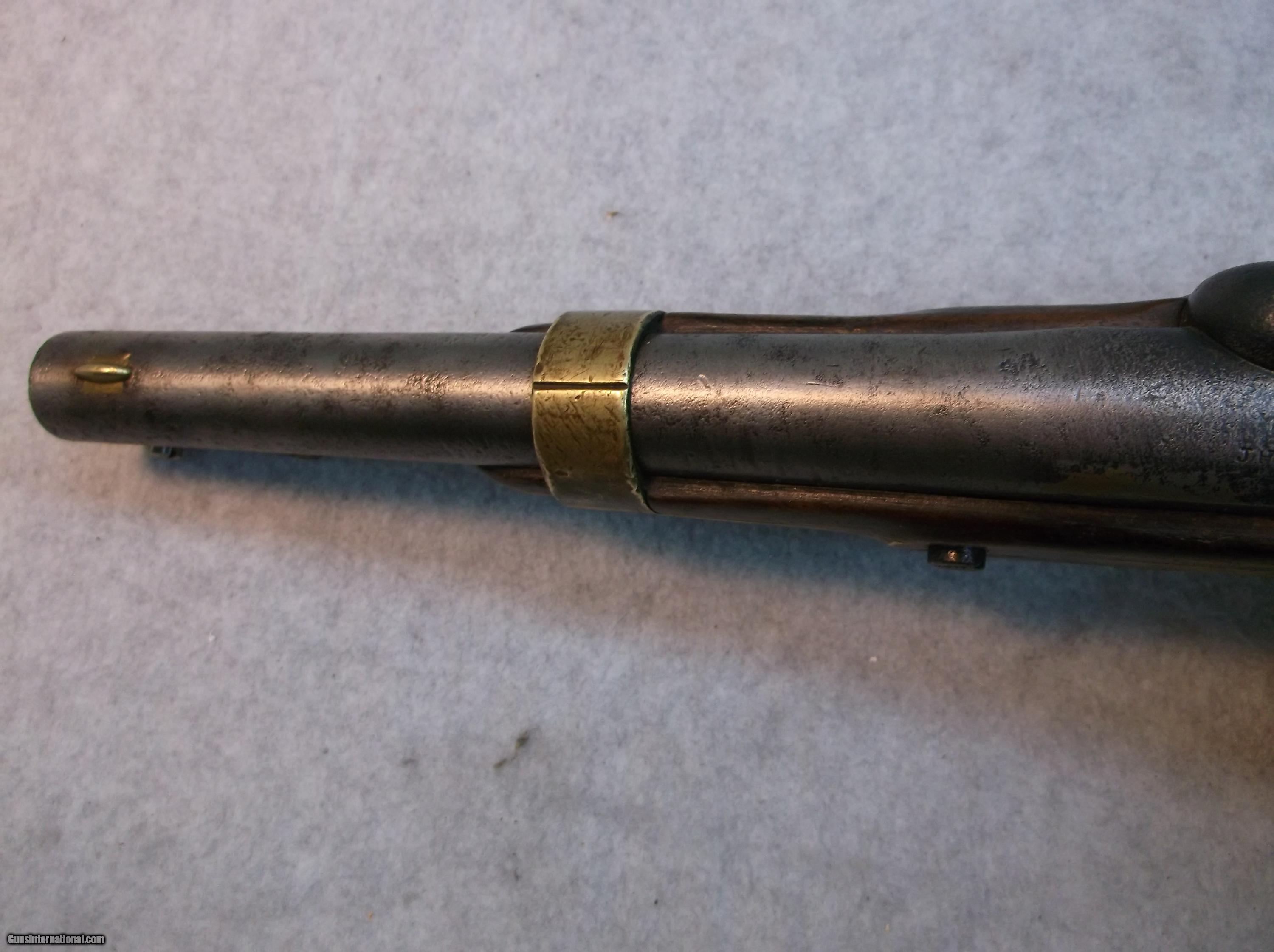 Description: The Model 1842 was the last single shot smoothbore pistol issued by the U.S. Army. It remained in service through the first years of the Civil War. Manufactured by Henry Aston of Middleton, Connecticut. This one is in fair condition and bears a date stamp of 1850. The lock plate has a beveled edge and is marked: "MIDDtn/CONN/1850" vertically in three lines behind the hammer and "U.S./H. ASTON & CO" in two lines in front of the hammer, the markings are hard to see with the naked eye. The top of the barrel is stamped: "JH" perpendicular to the bore and has the small sub-inspector's initials "JH" also stamped on the left barrel flat. The left stock flat is also stamped, but all that remains visible is the oval border. The stock has dings, dents, and scratches consistent with a 150+ year lifespan. Brass shows a nice patina. The Barrel is 8 ½ inches long with a brass blade front sight brazed to the barrel. It has substantial pitting inside and out and the bore is quite dark. Original hinged ramrod still in place and fuctional. The Hammer works correctly at half and full cock, and the trigger release is still crisp, although the pull is very heavy(factory design). Will ship anywhere in the USA, buyer pays freight. SOLD Antique: Yes Manufacturer: H. Aston Model: 1842 Caliber Info: 54 Black Powder Action: Percission Manufacture Date: 1850 Item Location: Eugene, Oregon |