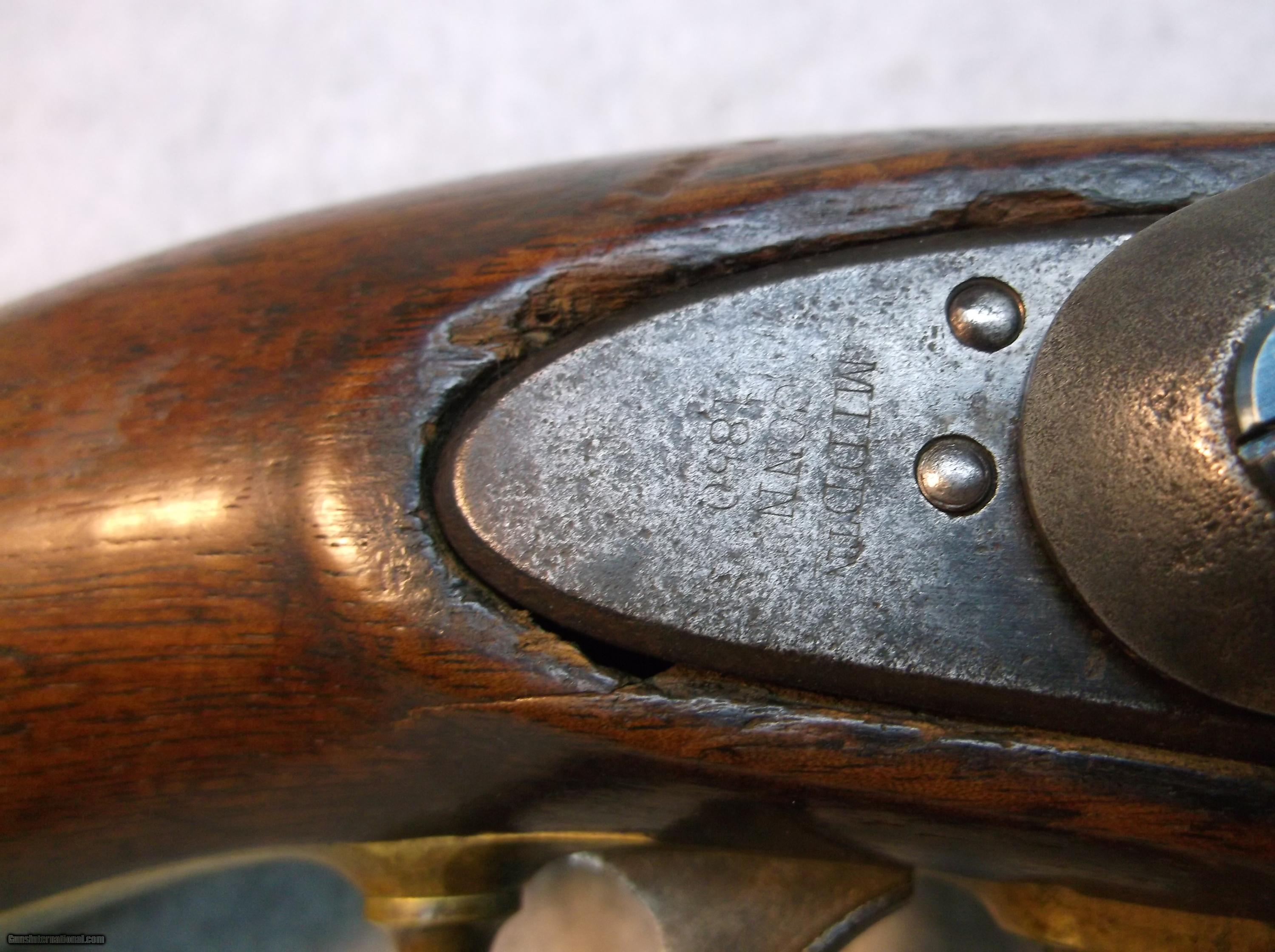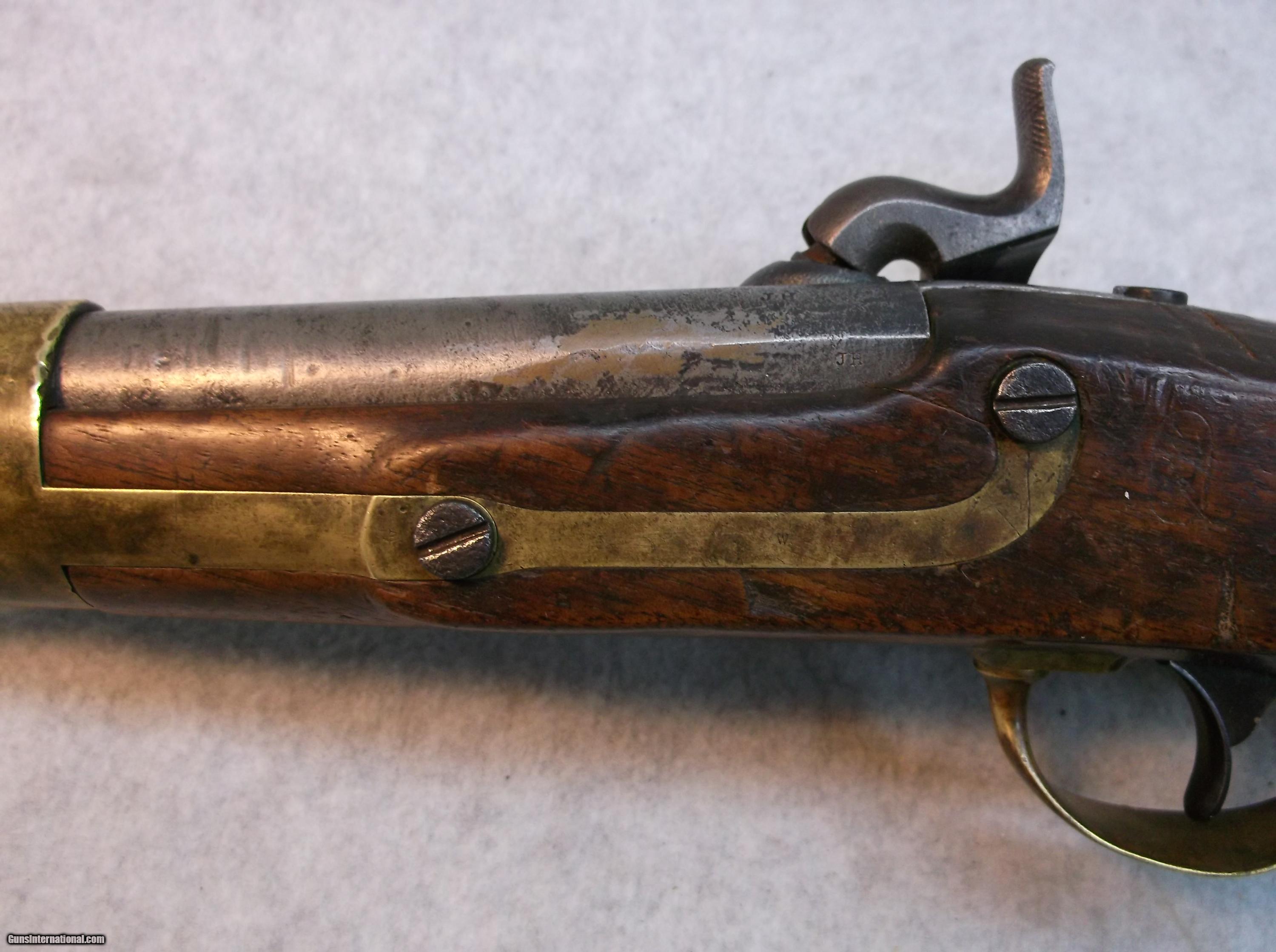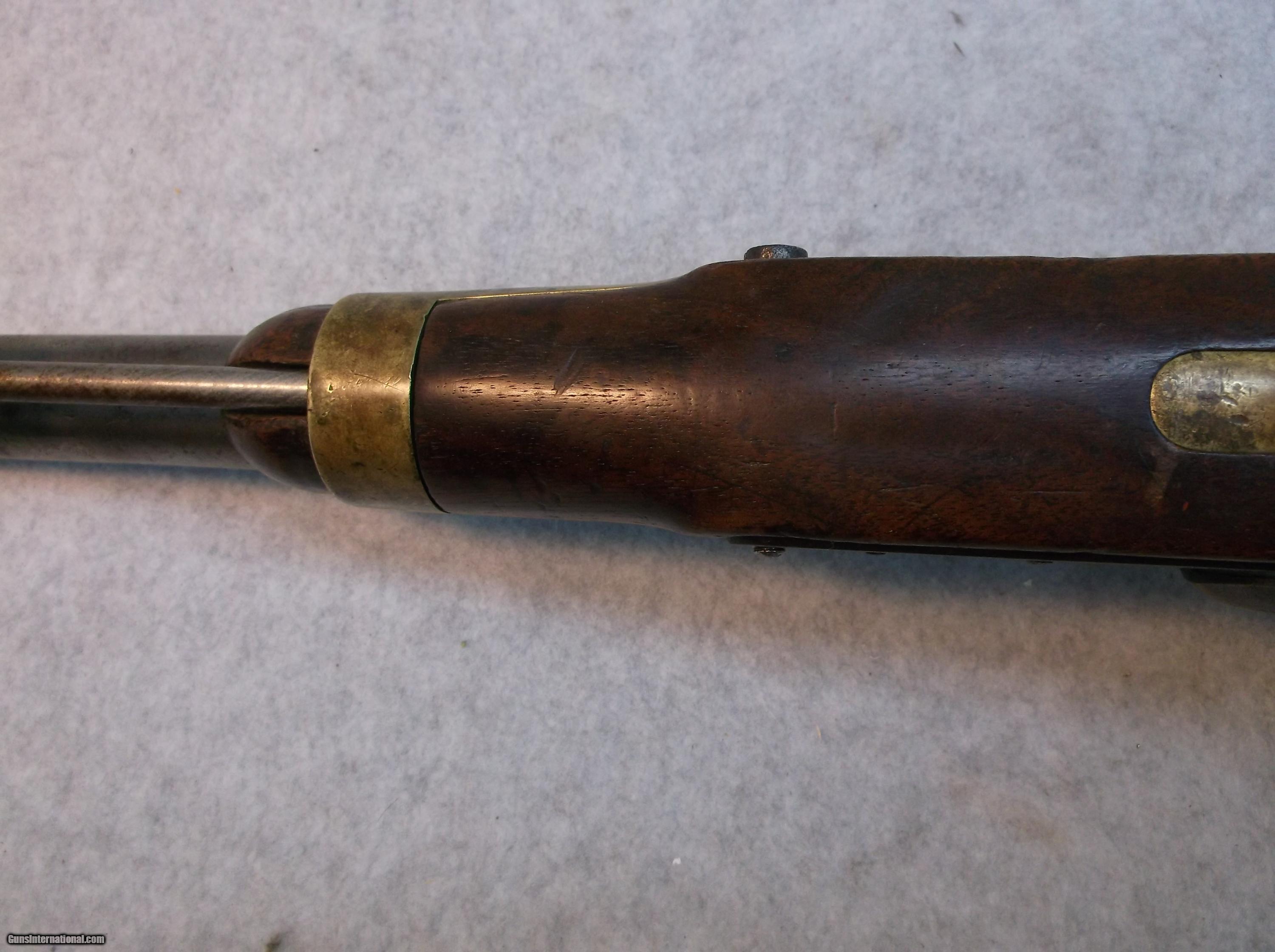 Description: The Model 1842 was the last single shot smoothbore pistol issued by the U.S. Army. It remained in service through the first years of the Civil War. Manufactured by Henry Aston of Middleton, Connecticut. This one is in fair condition and bears a date stamp of 1850. The lock plate has a beveled edge and is marked: "MIDDtn/CONN/1850" vertically in three lines behind the hammer and "U.S./H. ASTON & CO" in two lines in front of the hammer, the markings are hard to see with the naked eye. The top of the barrel is stamped: "JH" perpendicular to the bore and has the small sub-inspector's initials "JH" also stamped on the left barrel flat. The left stock flat is also stamped, but all that remains visible is the oval border. The stock has dings, dents, and scratches consistent with a 150+ year lifespan. Brass shows a nice patina. The Barrel is 8 ½ inches long with a brass blade front sight brazed to the barrel. It has substantial pitting inside and out and the bore is quite dark. Original hinged ramrod still in place and fuctional. The Hammer works correctly at half and full cock, and the trigger release is still crisp, although the pull is very heavy(factory design). Will ship anywhere in the USA, buyer pays freight. SOLD Antique: Yes Manufacturer: H. Aston Model: 1842 Caliber Info: 54 Black Powder Action: Percission Manufacture Date: 1850 Item Location: Eugene, Oregon |