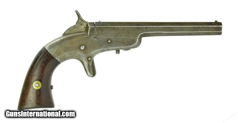 Description: " Bacon Single Shot .32 Rimfire caliber pistol. 4 7/8” Barrel in .32 Rimfire. Made in 1864. Smooth gray patina. Markings are all clear. Grips are very good.
