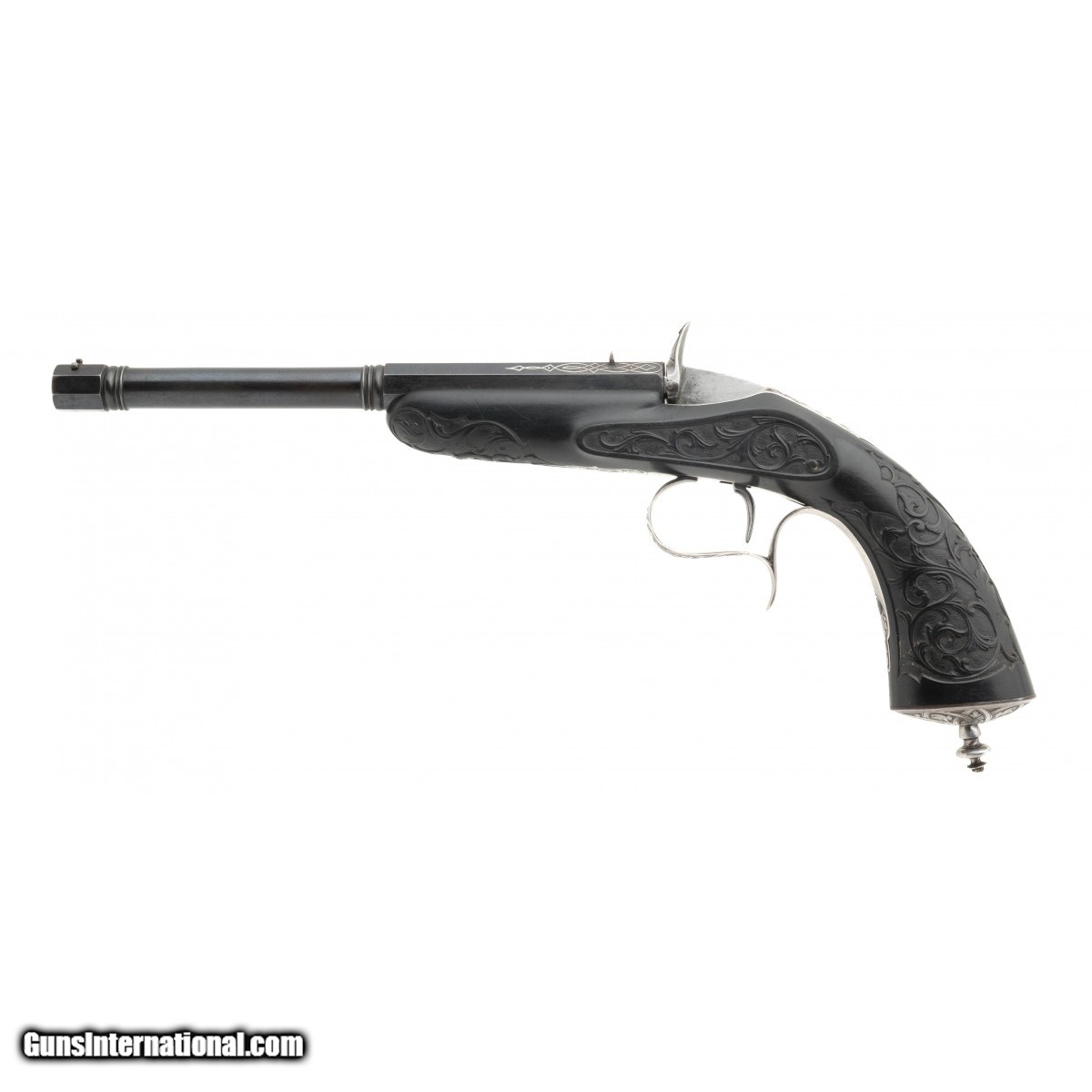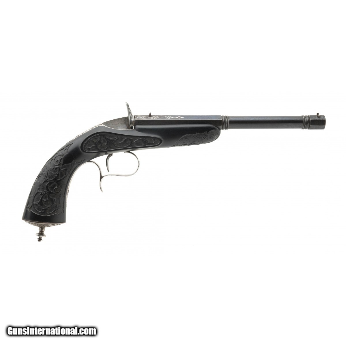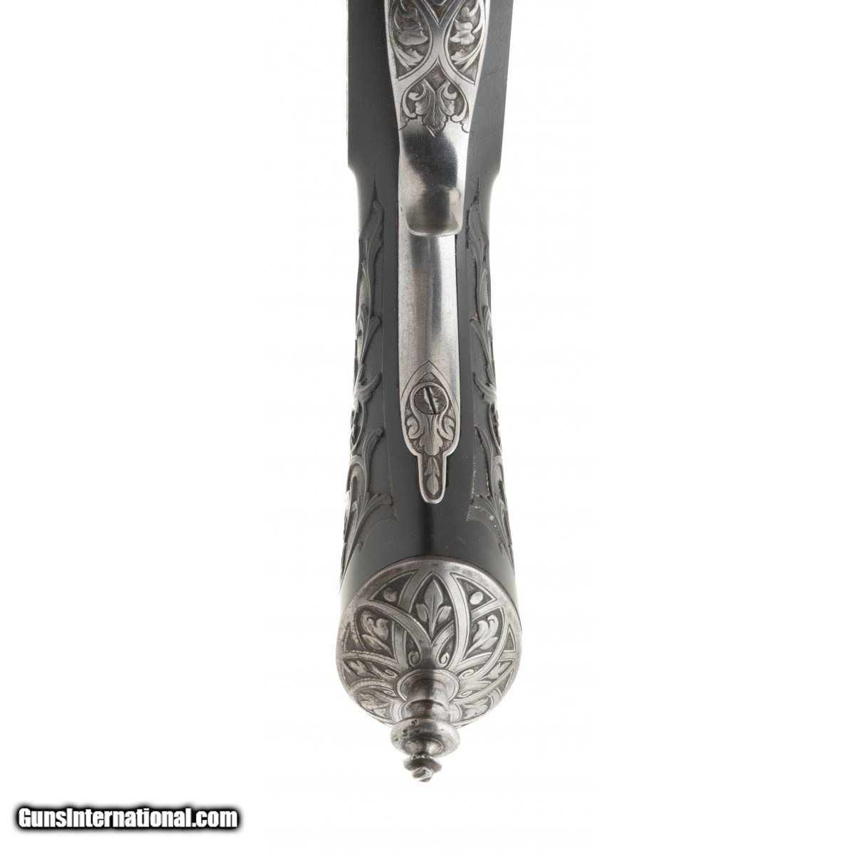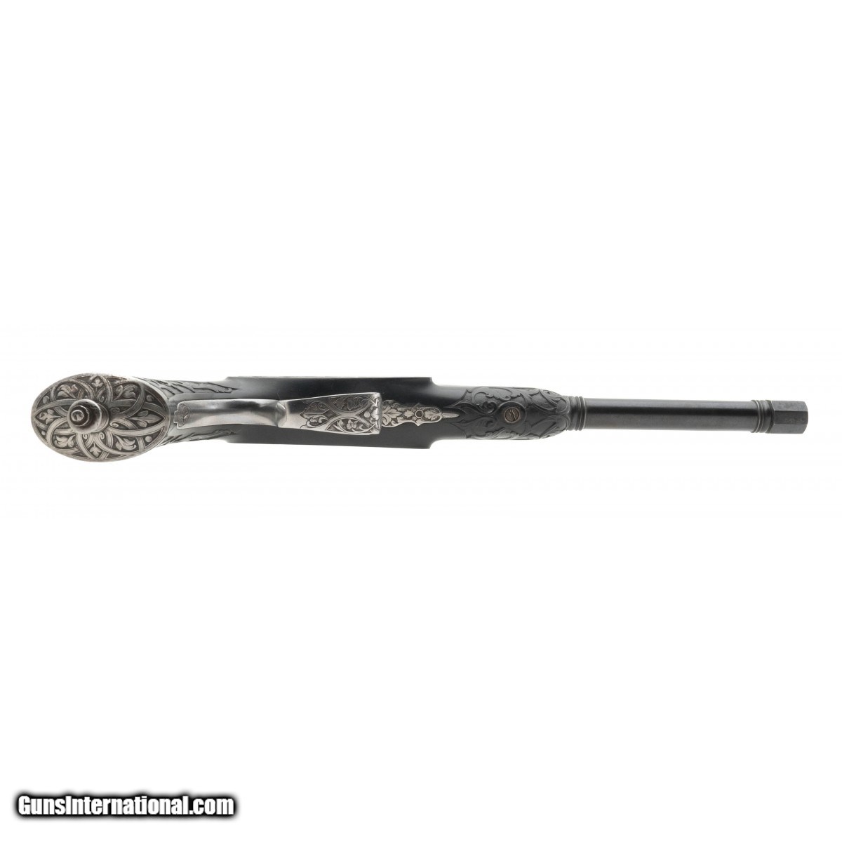Description: " This very fine cased 22 caliber parlor pistol was made by Faure-Lepage of Paris. The overall length is approx 15"". The 9 1/8"" barrel has a good smooth bore with areas of erosion caused by firing black powder rounds. The first 4 1/8"" of the barrel are octagon followed by two groove transition wedding band followed by an approx. 3.5"" round section transitioning to another wedding band to the final .75"" octagon section. The top of the round section is marked in script H Faure-Le Page a Paris. The rear octagon section has attractive silver wire inlays on the top three flats with a little missing from the right flat. The barrel tang, buttcap, and trigger guard bow are nicely engraved in a floral motif. The ebony stock is heavily carved on the sides of the grips, right and left flats, and forend. The stock is excellent. The action functions correctly. The 16""X6""X2.25"" oak case is very good. In addition to the gun, the case contains the key and cleaning rod for the gun. The interior lining is original but faded as should be expected. This nice looking cased parlor pistol by a well-known maker is attractively priced. SOLD Antique: Yes |