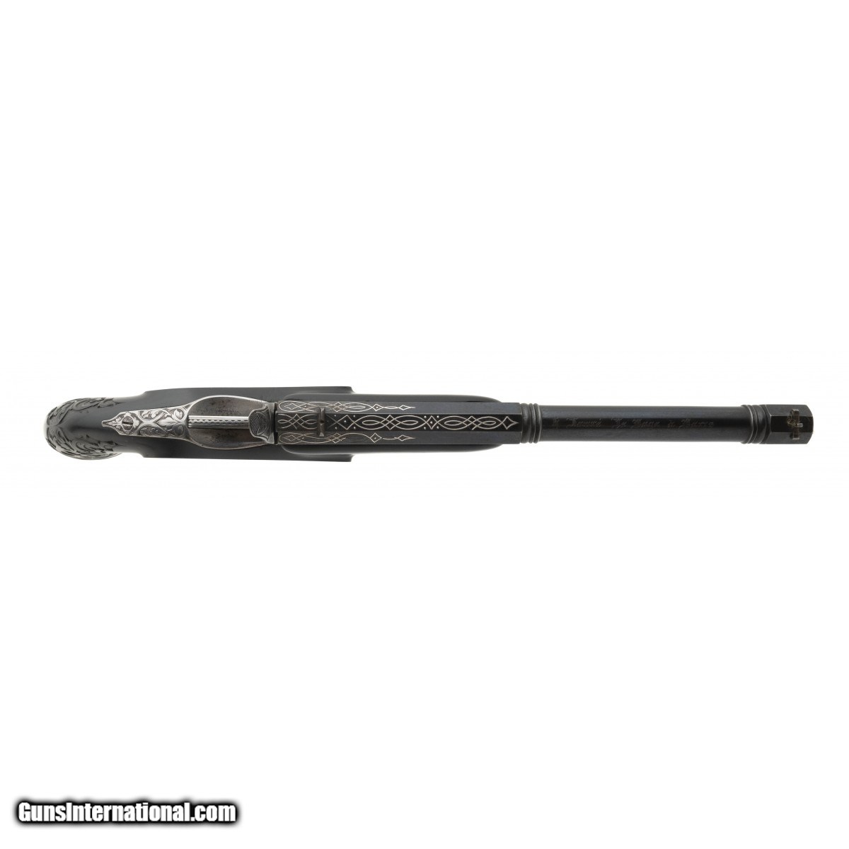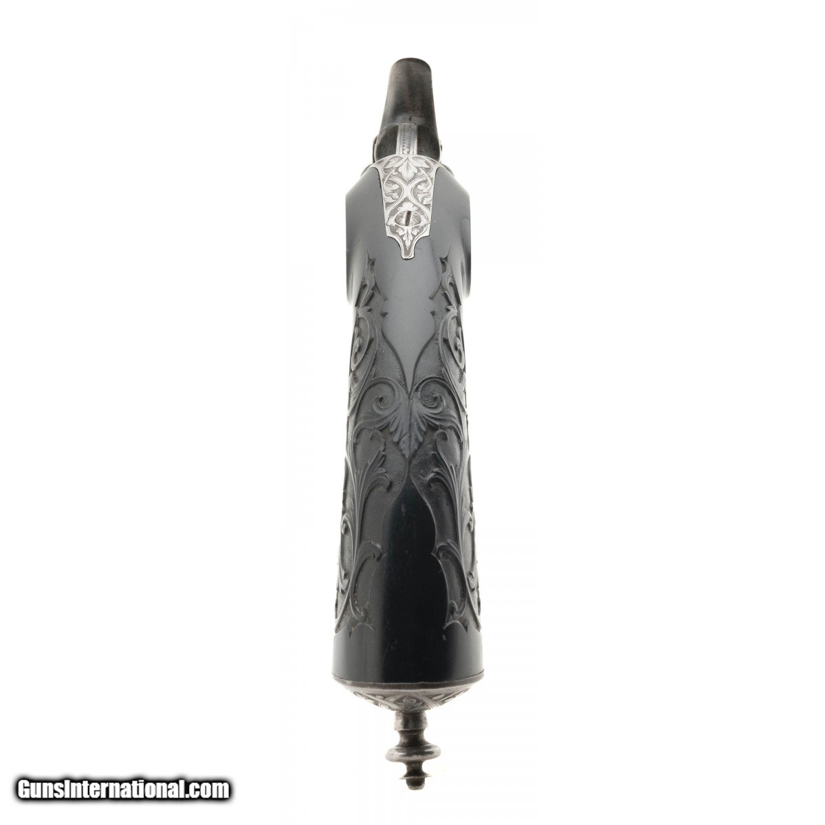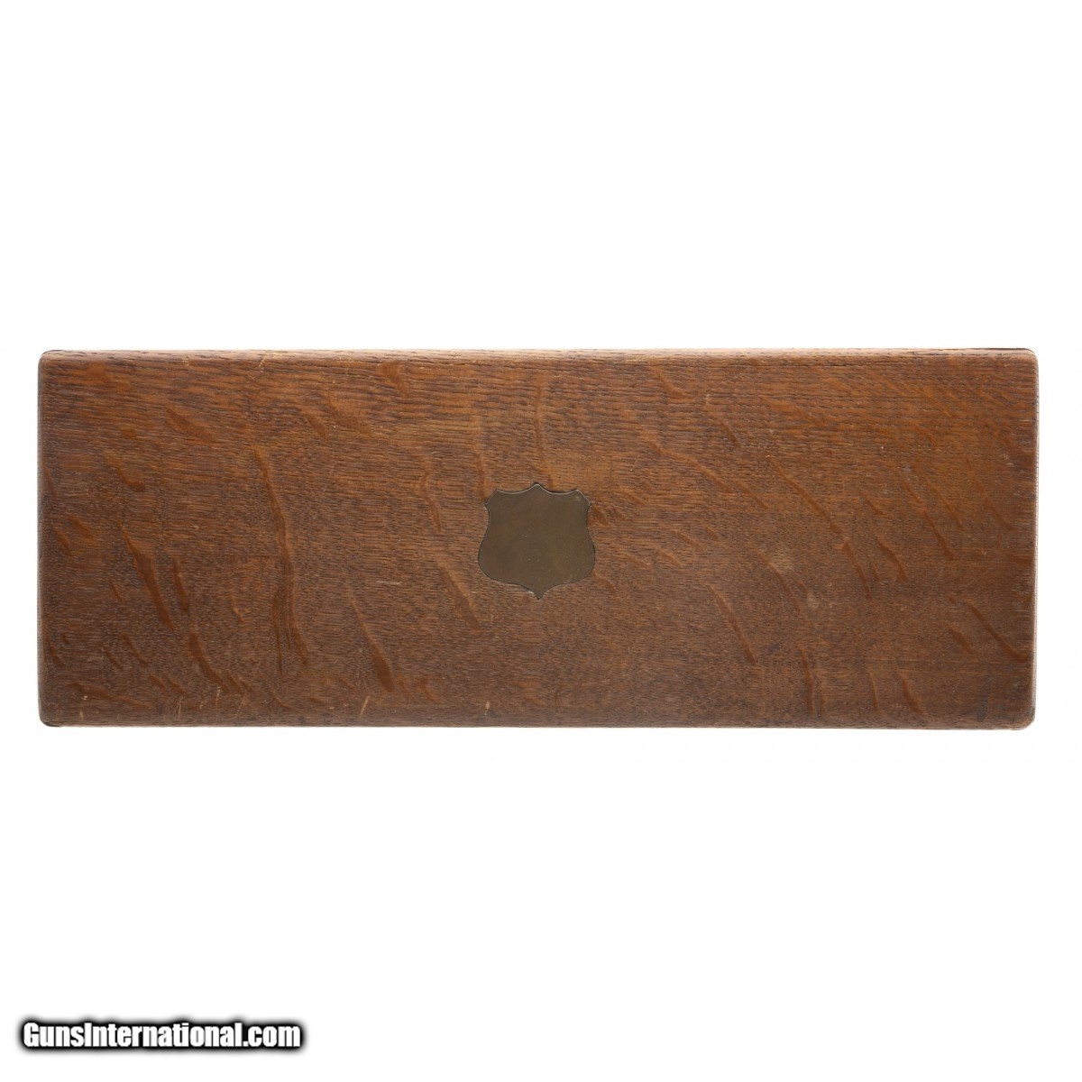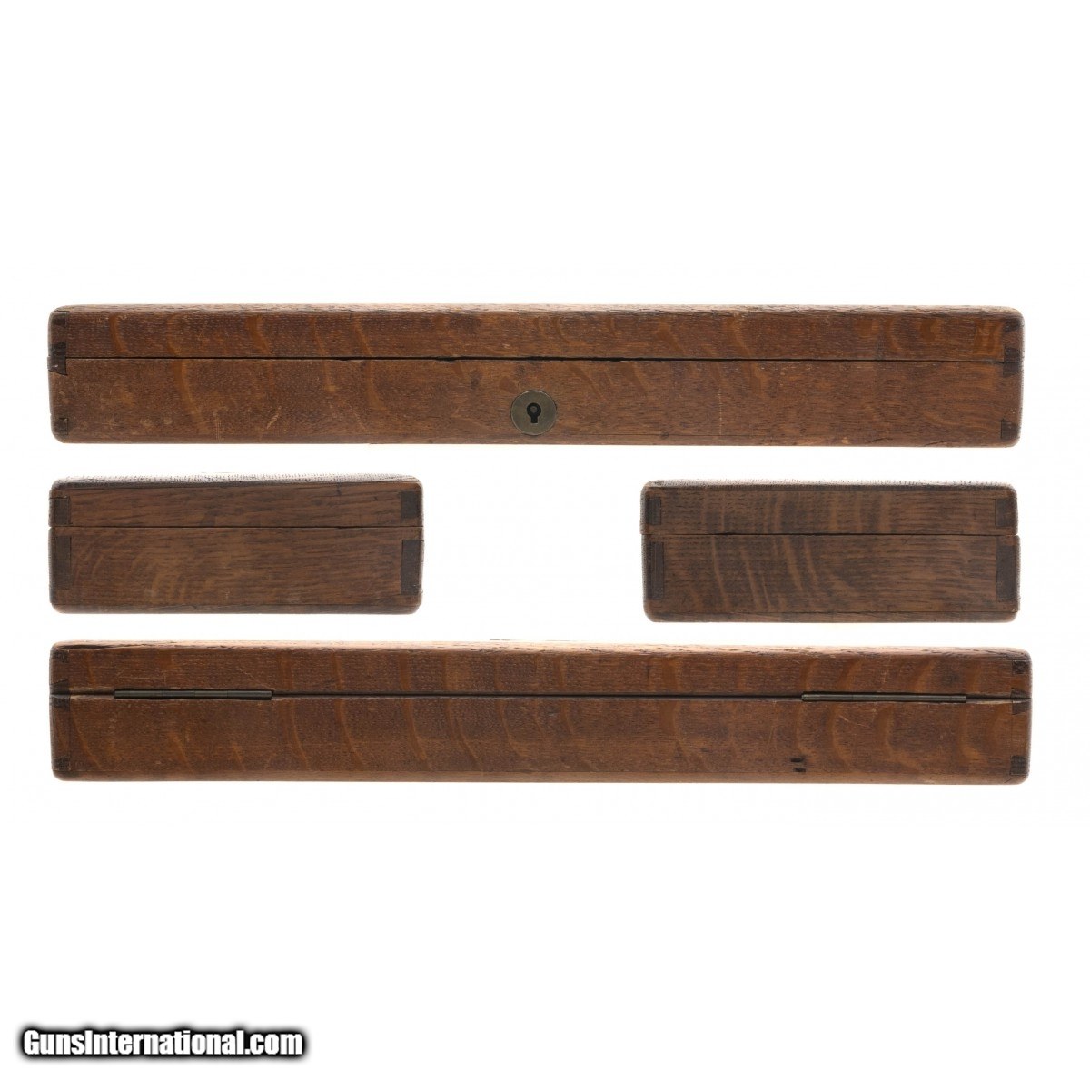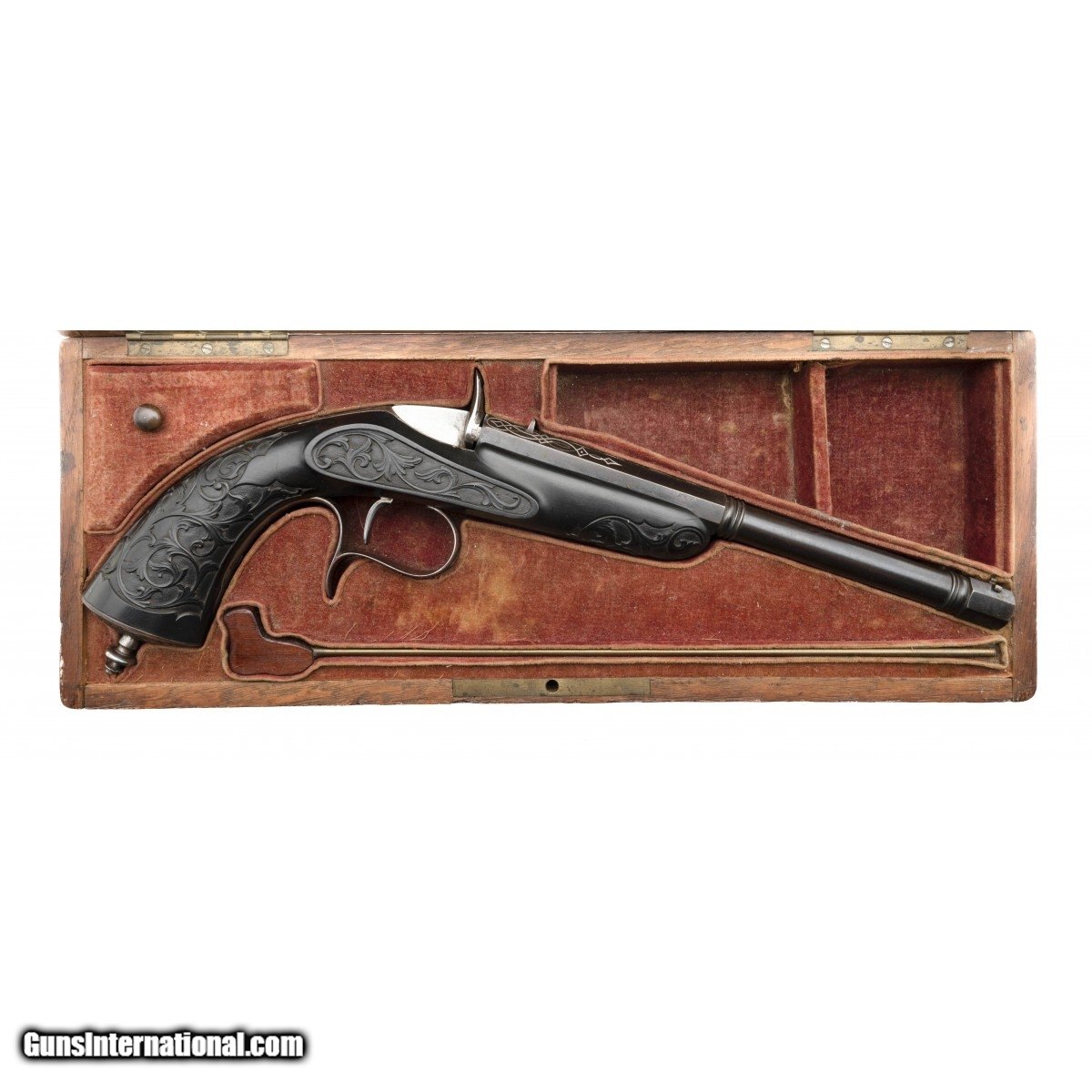 Description: " This very fine cased 22 caliber parlor pistol was made by Faure-Lepage of Paris. The overall length is approx 15"". The 9 1/8"" barrel has a good smooth bore with areas of erosion caused by firing black powder rounds. The first 4 1/8"" of the barrel are octagon followed by two groove transition wedding band followed by an approx. 3.5"" round section transitioning to another wedding band to the final .75"" octagon section. The top of the round section is marked in script H Faure-Le Page a Paris. The rear octagon section has attractive silver wire inlays on the top three flats with a little missing from the right flat. The barrel tang, buttcap, and trigger guard bow are nicely engraved in a floral motif. The ebony stock is heavily carved on the sides of the grips, right and left flats, and forend. The stock is excellent. The action functions correctly. The 16""X6""X2.25"" oak case is very good. In addition to the gun, the case contains the key and cleaning rod for the gun. The interior lining is original but faded as should be expected. This nice looking cased parlor pistol by a well-known maker is attractively priced. SOLD Antique: Yes |