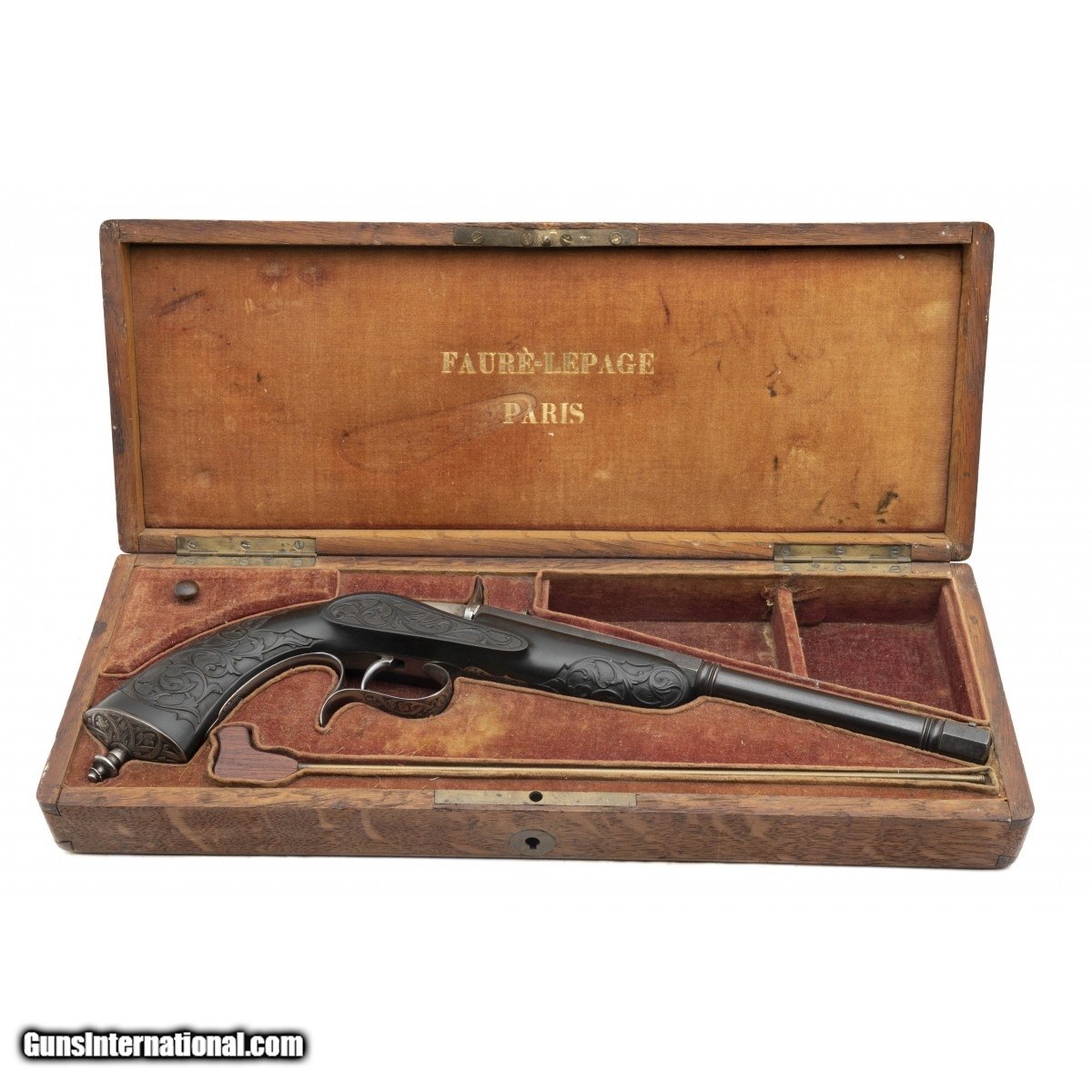 This very fine cased 22 caliber parlor pistol was made by Faure-Lepage of Paris. The overall length is approx 15"". The 9 1/8"" barrel has a good smooth bore with areas of erosion caused by firing black powder rounds. The first 4 1/8"" of the barrel are octagon followed by two groove transition wedding band followed by an approx. 3.5"" round section transitioning to another wedding band to the final .75"" octagon section. The top of the round section is marked in script H Faure-Le Page a Paris. The rear octagon section has attractive silver wire inlays on the top three flats with a little missing from the right flat. The barrel tang, buttcap, and trigger guard bow are nicely engraved in a floral motif. The ebony stock is heavily carved on the sides of the grips, right and left flats, and forend. The stock is excellent. The action functions correctly. The 16""X6""X2.25"" oak case is very good. In addition to the gun, the case contains the key and cleaning rod for the gun. The interior lining is original but faded as should be expected. This nice looking cased parlor pistol by a well-known maker is attractively priced.