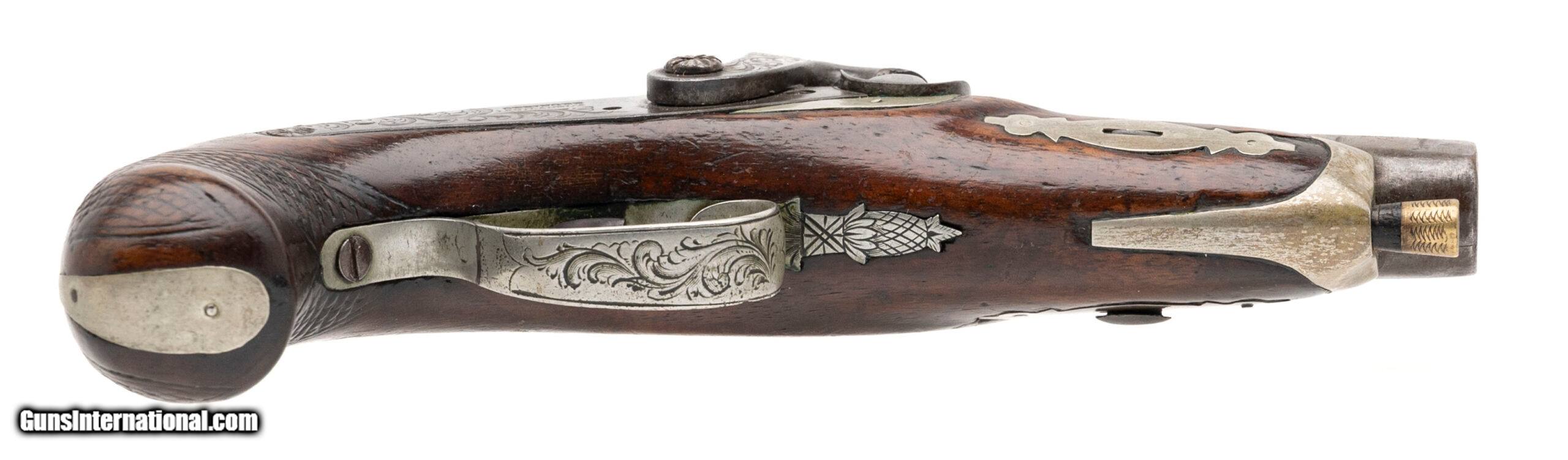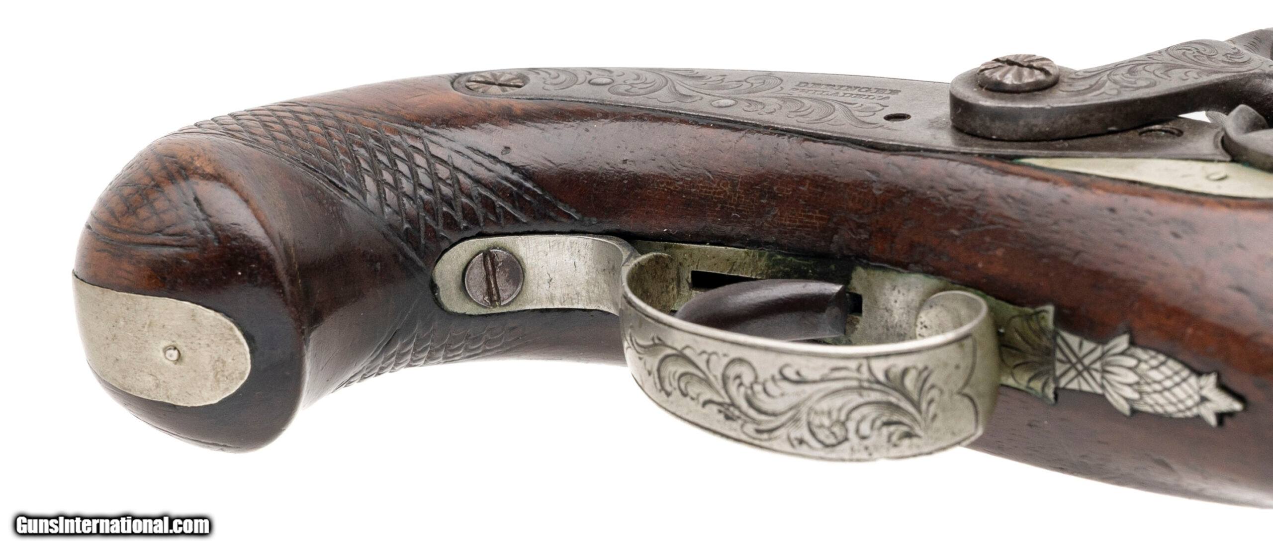 Description: "NSN. Made circa 1850s. 41 caliber with a 3" barrel. The barrel has a light gray [patina throughout, but remains sharp with all the markings visible. The top of the barrel is marked is marked “Made For/ Hyde & Goodrich/ AGENTS N. Orleans" The stock is very good with the checkering present showing normal handling use. The lock, upper tang and trigger guard are all engraved. There is a silver escutcheon with initials nicely engraved. Hyde and Goodrich was a dealer for Henry Derringer in New Orleans. They sold many things in addition to firearms. Very neat Southern marked Derringer.! Antique: Yes Price: $2,895.00 Contact Seller |