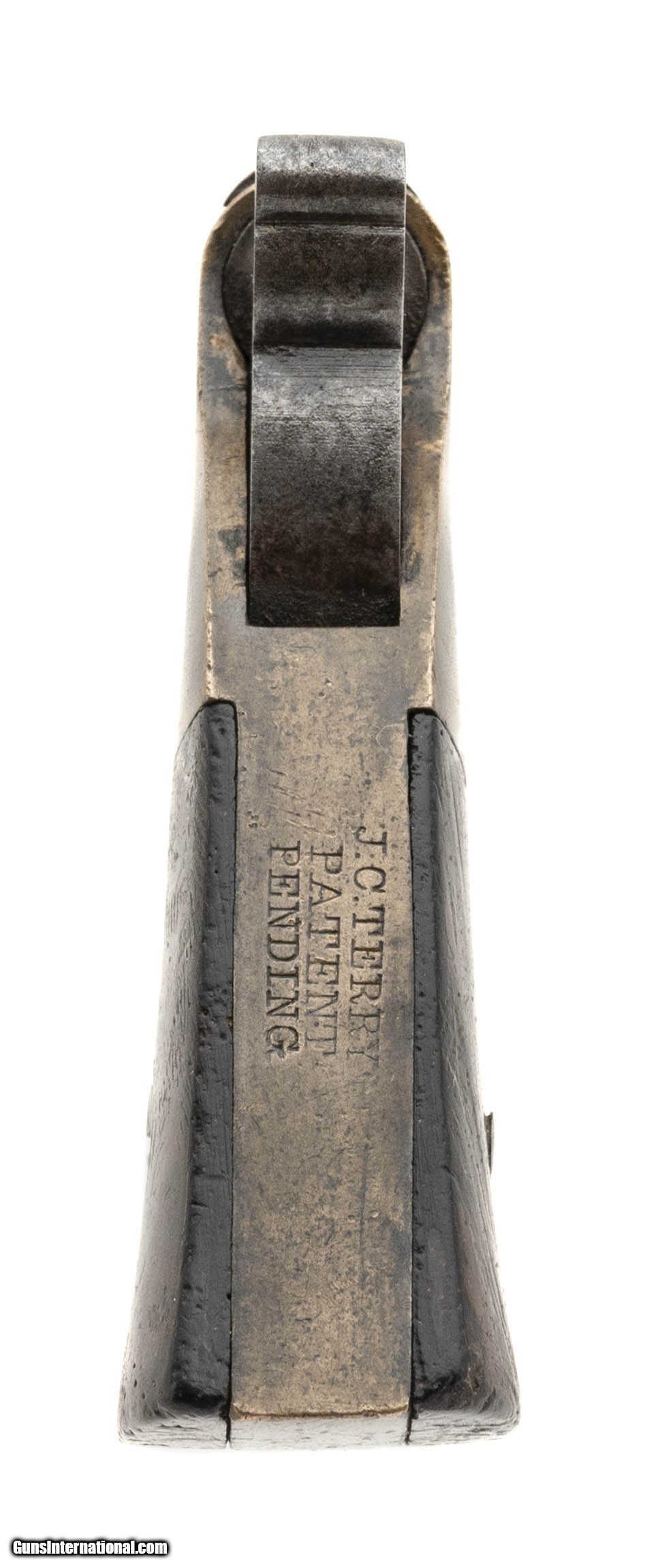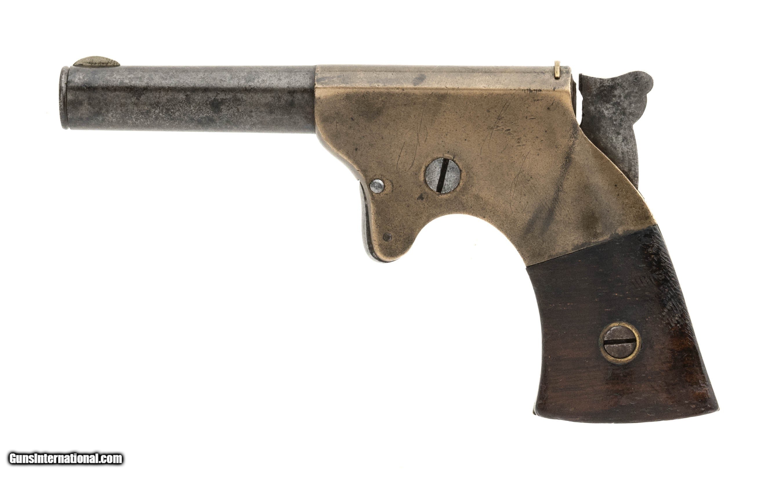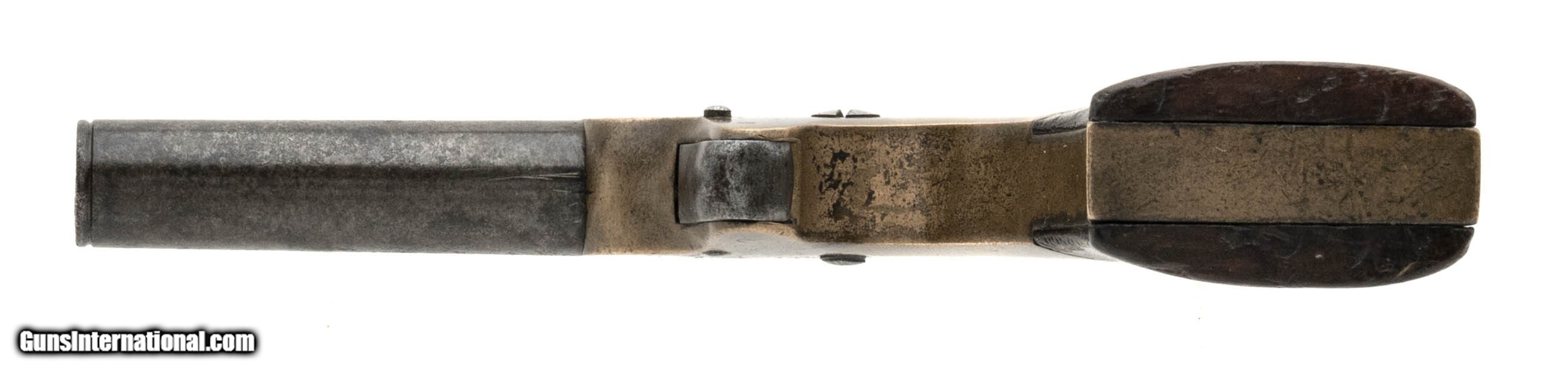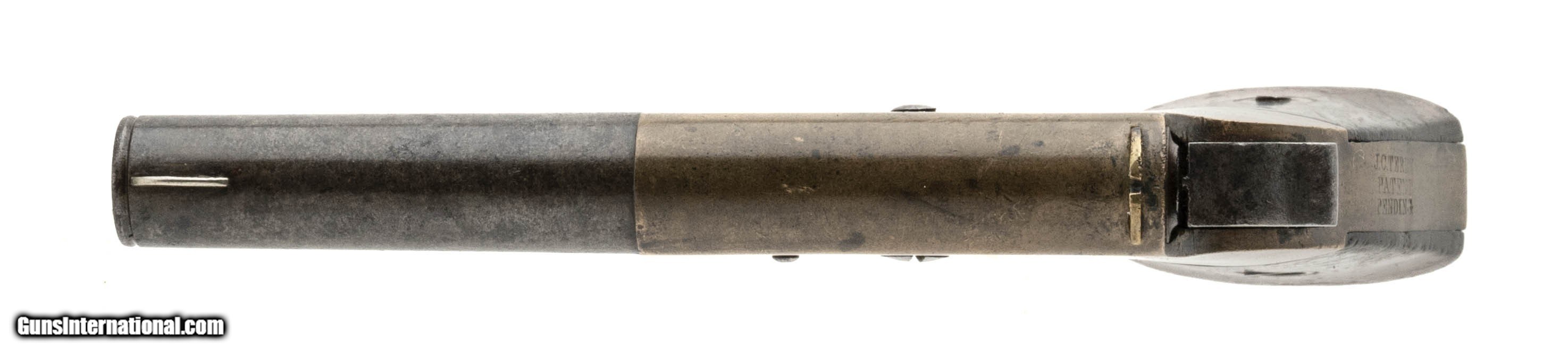 Description: "J. C. Terry Single Shot .22 Rimfire Derringer. Less than 700 manufactured. Brass frame is excellent with mustard color patina. Grips are rosewood with very good varnish. Barrel has some light pits on the exterior and has a blue-brown patina. Bore fair rifling and some pitting. Scarce! Antique: Yes Price: $1,850.00 Contact Seller |
