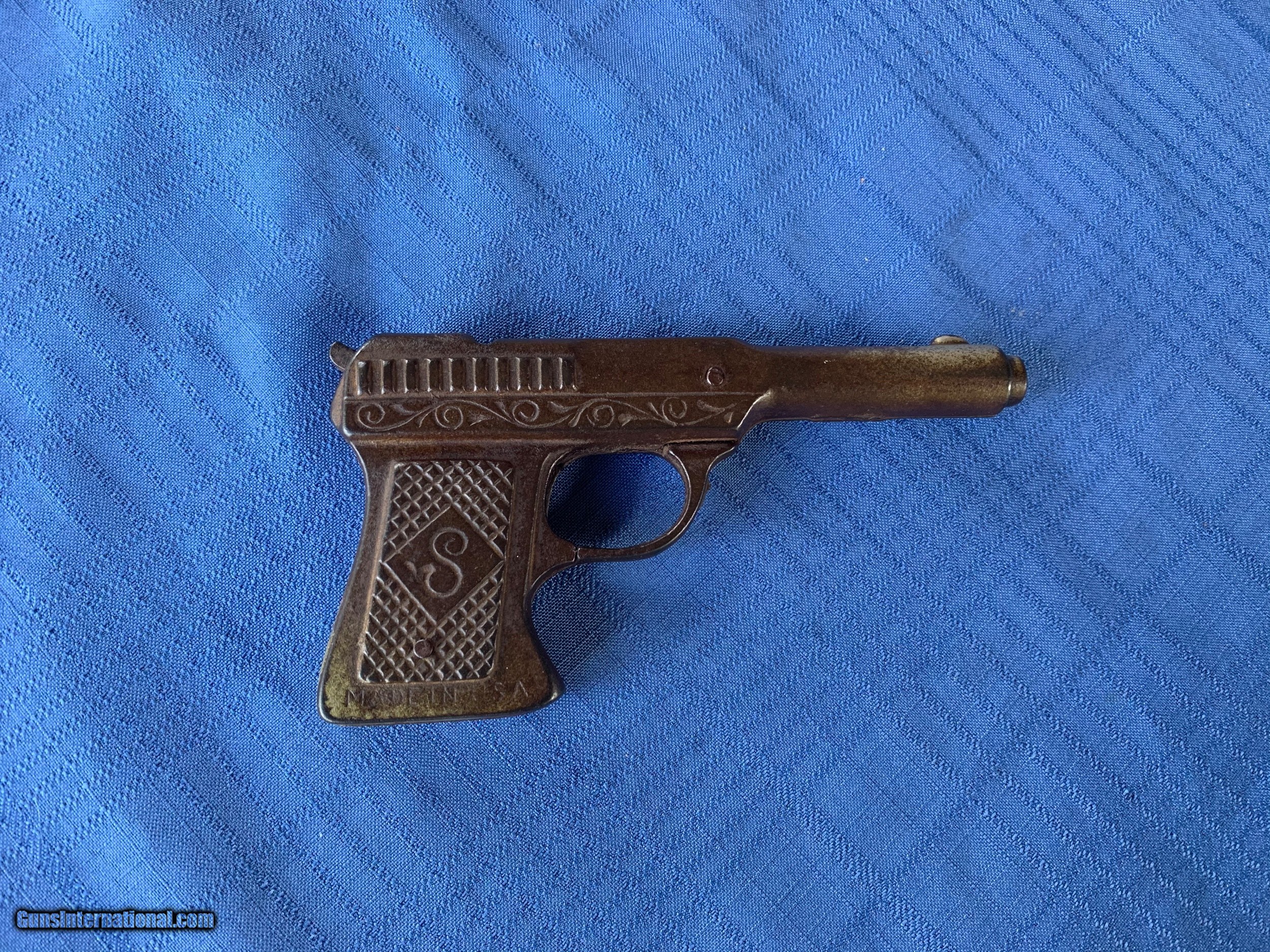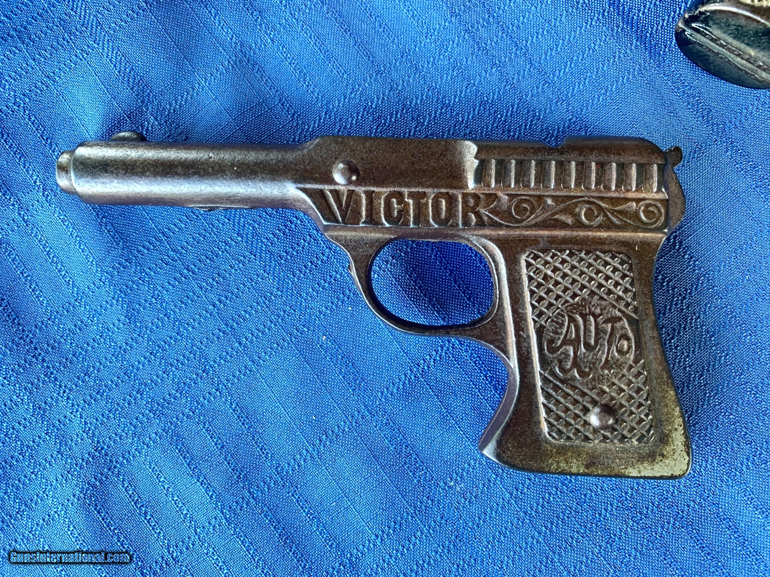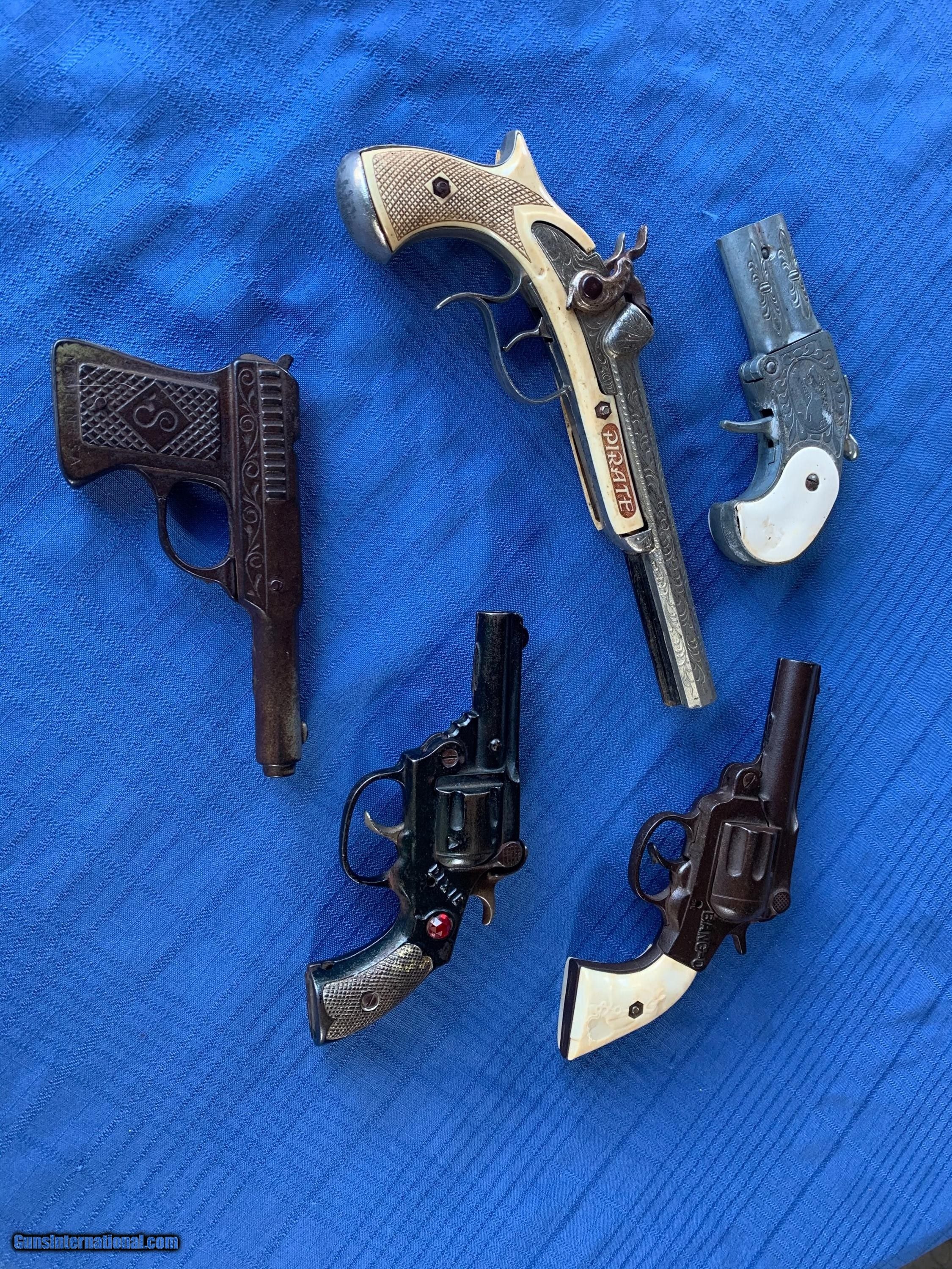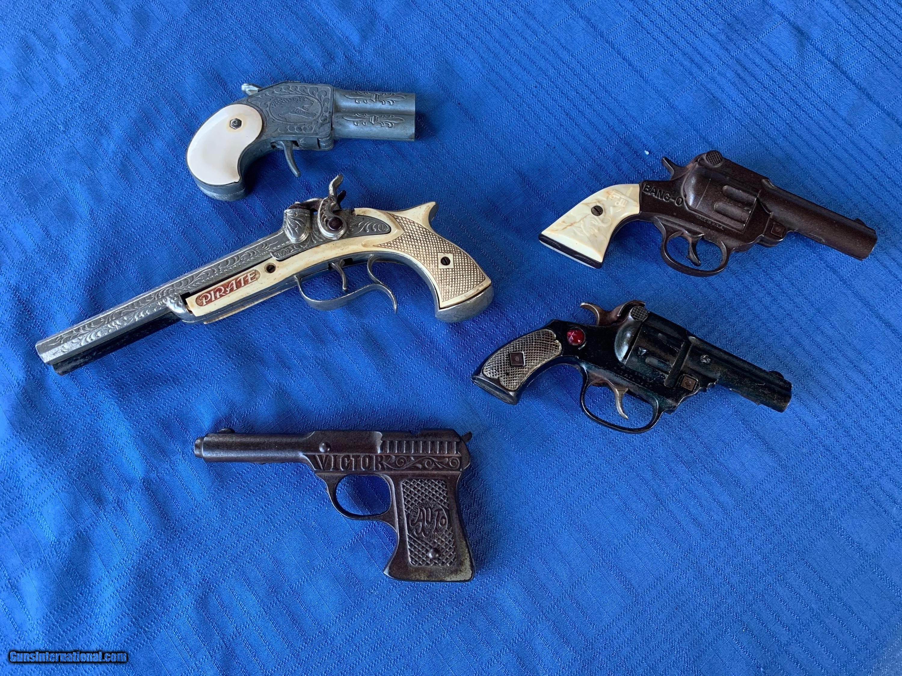 Description: Heres a small Collection of some very Rare Iron Gap Guns as Early as 1930 . All American Made ! All 5 Cap Guns are in Excellent working order. 100 percent original condition . Buy all 5 for one price . Please review my photos and email me with any questions ? 3 day inspection as allways . Thank you for looking Little Jo SOLD Antique: Yes Manufacturer: American Made Model: Early Iron Cap guns |