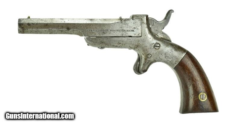 Description: Allen & Wheelock Single Shot .32 Caliber Pistol. Made in 1860s. .32 Caliber Center Fire. 4” Octagon barrel. Sharp gun with a light gray patina. Action works well. Grips have original varnish. All markings are visible and sharp.