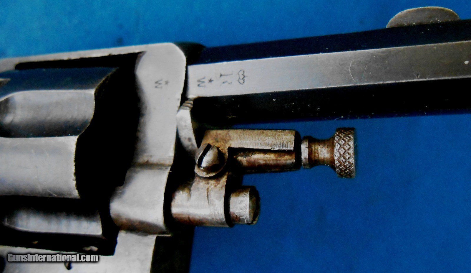 Description: GREAT LITTLE 6 SHOT BULL DOG DOUBLE ACTION .320 CAL. MATCHING NUMBERS #8 ON VARIOUS PARTS. BELGIUM & GERMAN PROOF MARKS. ABOUT 5 1/2" OVERALL WITH OCTAGON 2 1/8" BARREL. STRONG BORE SOME SCATTERED PITTING. METAL SURFACES RETAIN EXCELLENT ORIGINAL FINISH. BLUE PARTS ABOUT 95% WITH SOME HIGH EDGE WEAR. FRAME SHOWS GENEROUS AMOUNT OF ORIGINAL CASE COLORS. FACTORY LOGO GRIPS IN EXCELLENT CONDITION SHOWING MINOR LIGHT WEAR & HANDLING. ACTION FUNCTIONS PERFECT BOTH SINGLE & DOUBLE ACTION WITH SOLID LOCK-UP & TIMING SIDE LOCK HAMMER SAFETY. CHAMBERS .32 COLT SHORT BUT RIM IS TOO THICK TO CLEAR THE FIRING PIN (ALL IS FINE IF 1 CHAMBER IS LEFT UNLOADED or ADJUST THE FIRING PIN). VERY NICE BULLDOG OVERALL, AS PICTURED & FOUND IN COLLECTION. MORE INFO JUST ASK ! $15.00 S&H DIRECT TO BUYER ANYWHERE THAT'S OK NO LICENSE NEEDED INCLUDING CALIFORNIA. SOLD Antique: Yes Handgun Caliber: .320 Revolver Manufacturer: CC Model: BULL DOG Serial Number: 8 MATCHING Barrel Length: 2 1/8 Bore: STRONG RIFLING Chambers: CLEAR Ejectors: WORKING Condition: FINE Metal Condition: FINE Bore Condition: VERY GOOD Barrel Type: OCTAGON Action: EXCELLENT Finish: ORIGINAL Weight: 11 oz Manufacture Date: 1880 - 1890s |