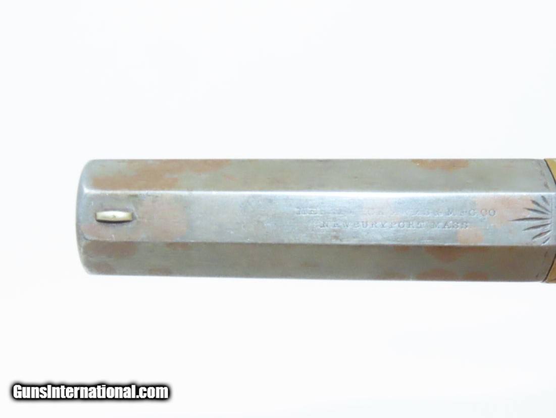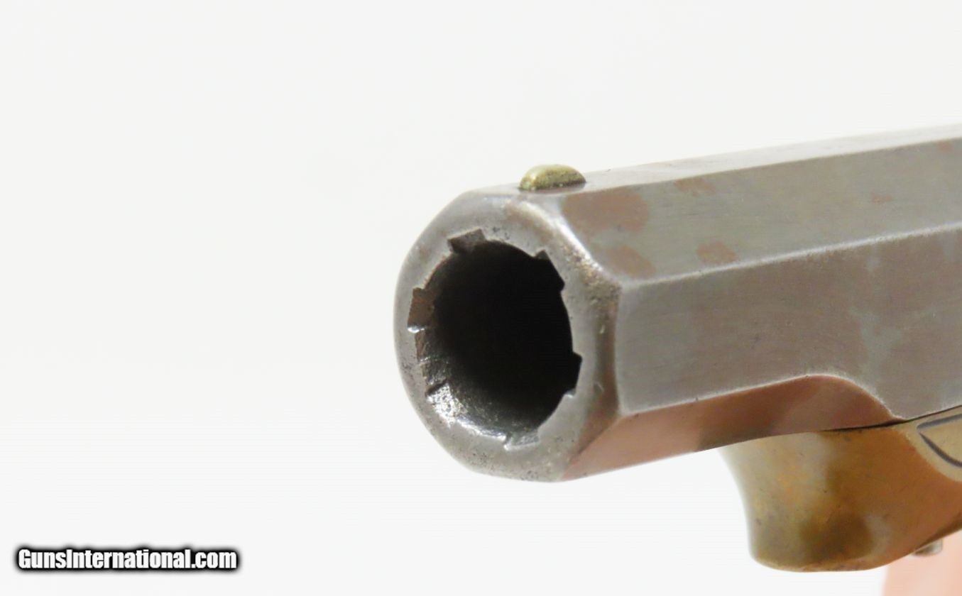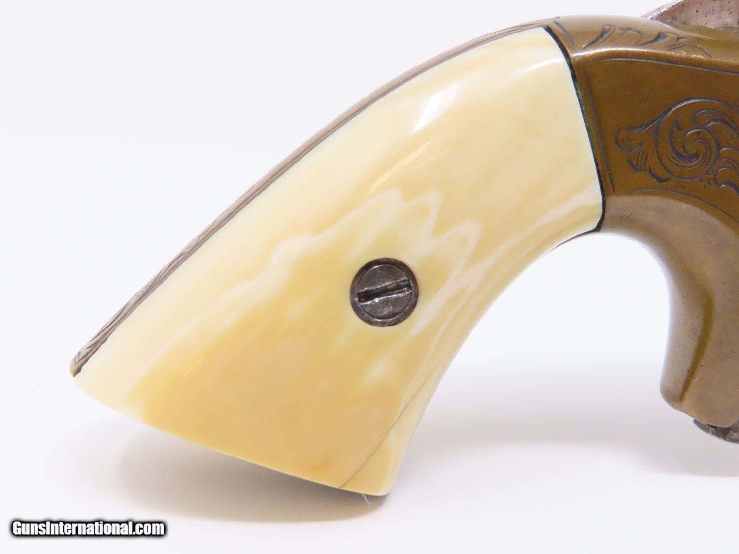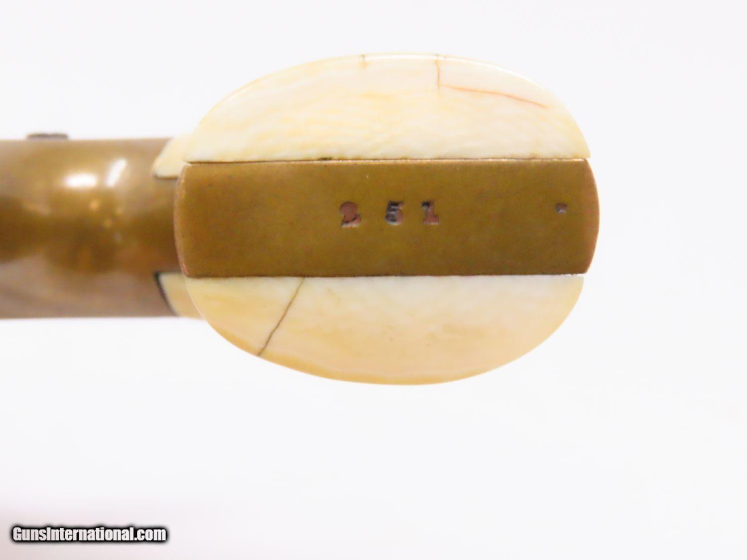 Description: Antique BRASS FRAME Merrimack Arms Spur Trigger “SOUTHERNER” .41 Deringer Engraved Single Shot Hideout with Ivories! Here we present an antique Merrimack Arms Co. “SOUTHERNER” Deringer with an Engraved Brass Frame in .41 Rimfire, made circa 1869-73 in Newburyport, Massachusetts. There were approximately 16,000 of these little single shots built following the Civil War from 1866 to 1873. The first three years of production were made under the name Brown. From 1869 to 1873, they were built under the name Merrimack in their own serial range of 1 through approximately 10,000. This one has a low number itself. The iron frames are found in serial number range 1950-4500 and made up less than 30% of the production while the rest were brass frames. Brown and Merrimack also produced Ballard Rifles before being sold off to Marlin in the early 1870's. The overall condition is very good. The action is as strong as ever. The bore is dim and a bit dusty from age. This is a handsome pistol with the engraved frame and ivory grips. A piece of tangible history! Own the original! This is a legitimate antique and not a reproduction. Barrel is 2-1/2 inches. Caliber: .41 Rimfire Overall condition as seen in photos. Very Fast. Very Safe. FREE SHIPPING WORLDWIDE. Delivered directly to your door by express mail! Guaranteed AUTHENTIC & Includes CERTIFICATE OF AUTHENTICITY. ancestryguns $1475 #20286 SOLD Antique: Yes |