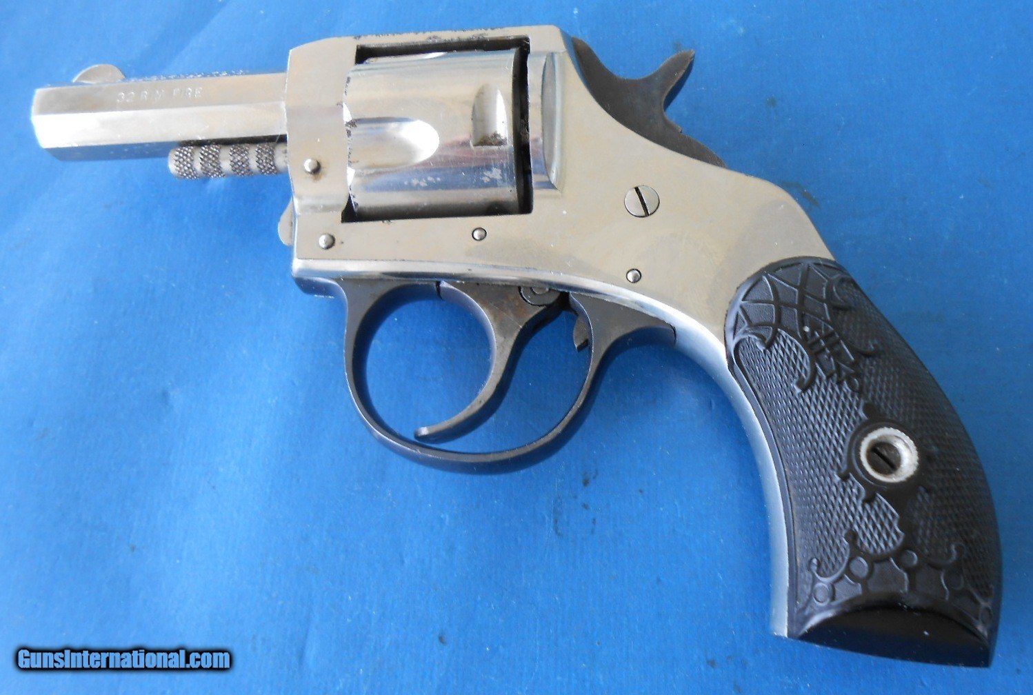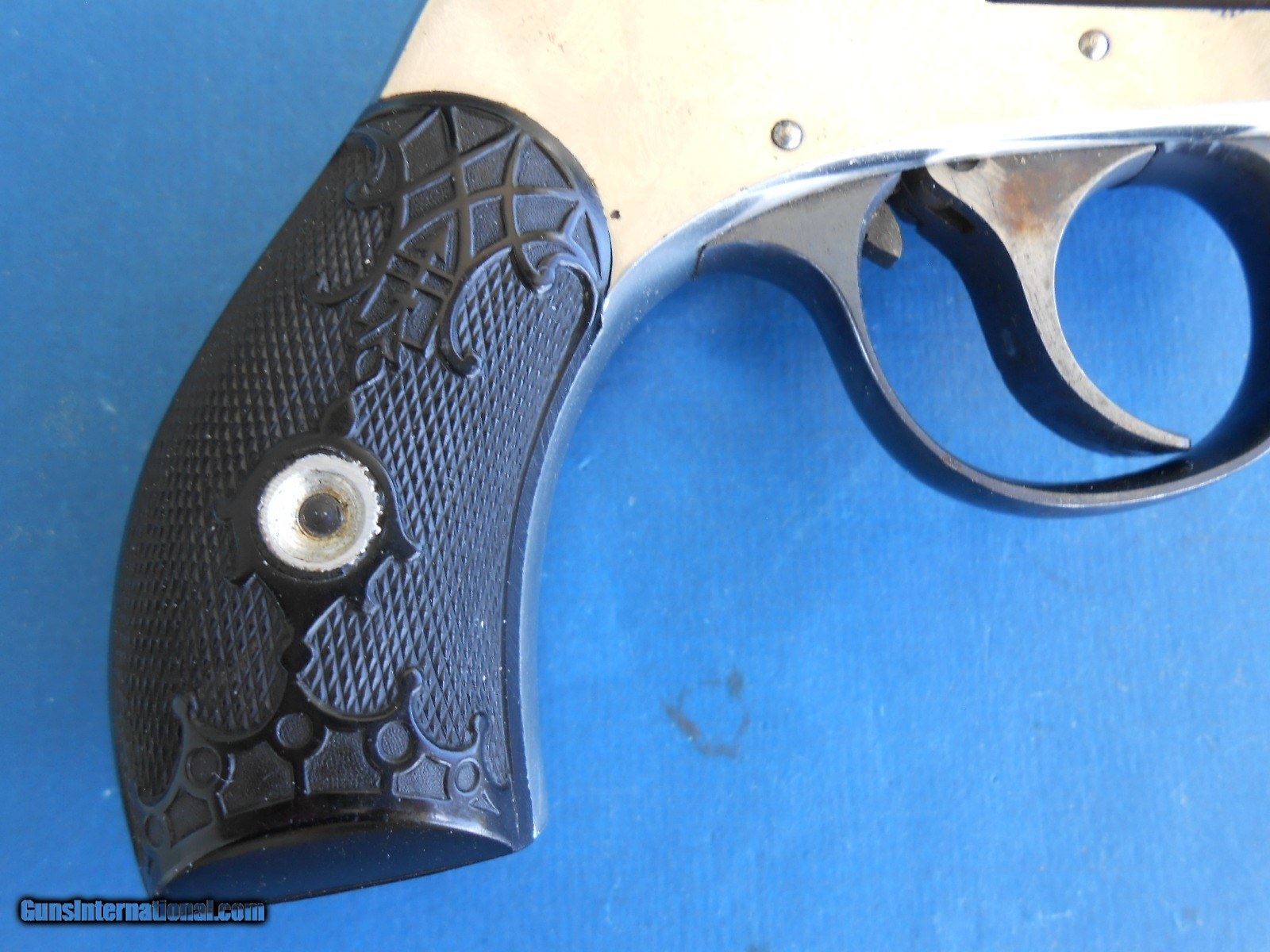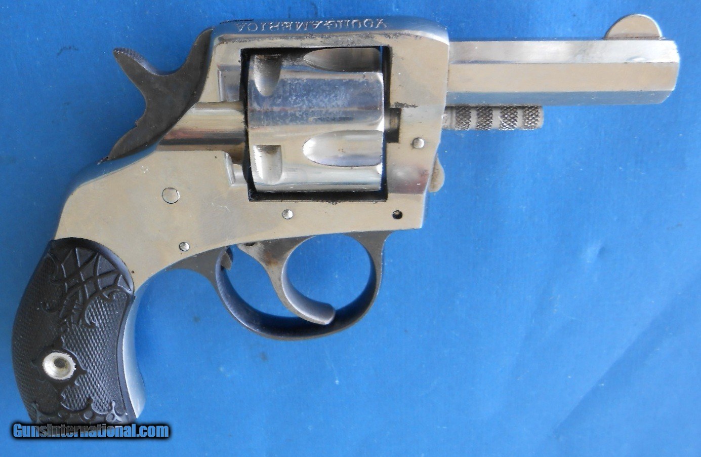 Description: ANTIQUE HARRINGTON & RICHARDSON SOLID FRAME YOUNG AMERICA BULL DOG .32 RF DOUBLE ACTION REVOLVER. 2" OCTAGON BARREL VERY FINE TO EXCELLENT BRIGHT BORE, STRONG RIFLING. ABOUT 98% ORIGINAL BRIGHT NICKLE & BLUE FINISH. HAMMER & TRIGGER HAVE ALMOST ALL OF THE ORIGINAL CASE - HARDENED FINISH. FACTORY HARD RUBER GRIPS WITH CROWN MOTIF RATE EXCELLENT WITH CORRECT MATCHING NUMBER GRIP. TIMING AND CYLINDER LOCK-UP ARE EXCELLENT. ACTION IS CRISP BOTH SINGLE AND DOUBLE ACTION. THESE LITTLE REVOLVERS ARE GETTING SCARCE AND DIFFICULT TO FIND IN THIS CONDITIOPN, AS PICTURED & FOUND RECENTLY IN ESTATE COLLECTION. $15.00 S&H DIRECT TO BUYER ANYEWHERE THAT'S OK NO LICENSE NEEDED INCLUDING CALIFORNIA. SOLD Antique: Yes Handgun Caliber: .32 Rimfire Manufacturer: HARRINGTON & RICHARDSON Model: YOUNG AMERICA BULL DOG Barrel Length: 2 Bore: STRONG & BRIGHT Chambers: CLEAR Condition: NEAR EXCELLENT Metal Condition: 98 % ORIGINAL FINISH Bore Condition: VERY FINE Barrel Type: OCTAGON Action: EXCELLENT Finish: ORIGINAL |