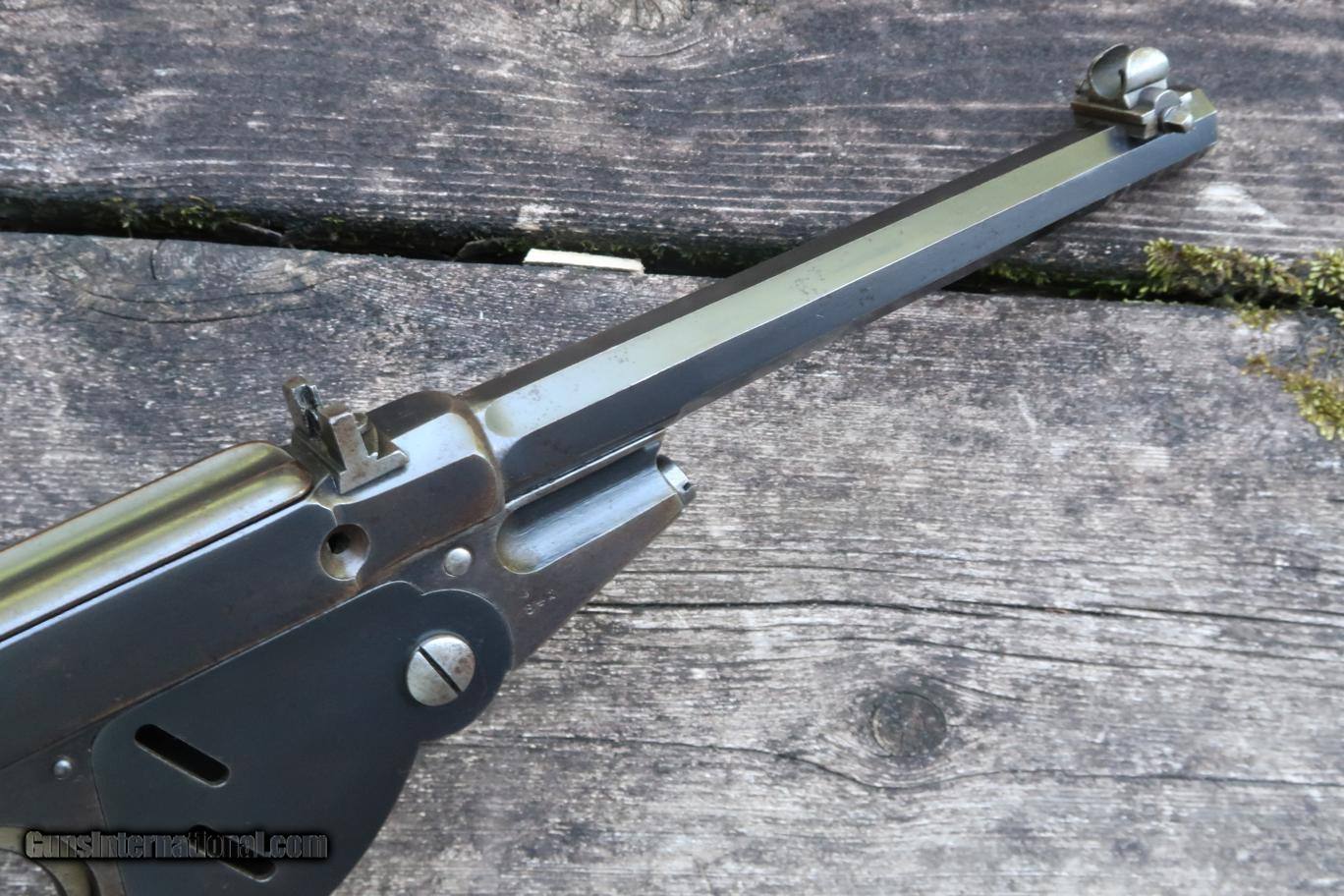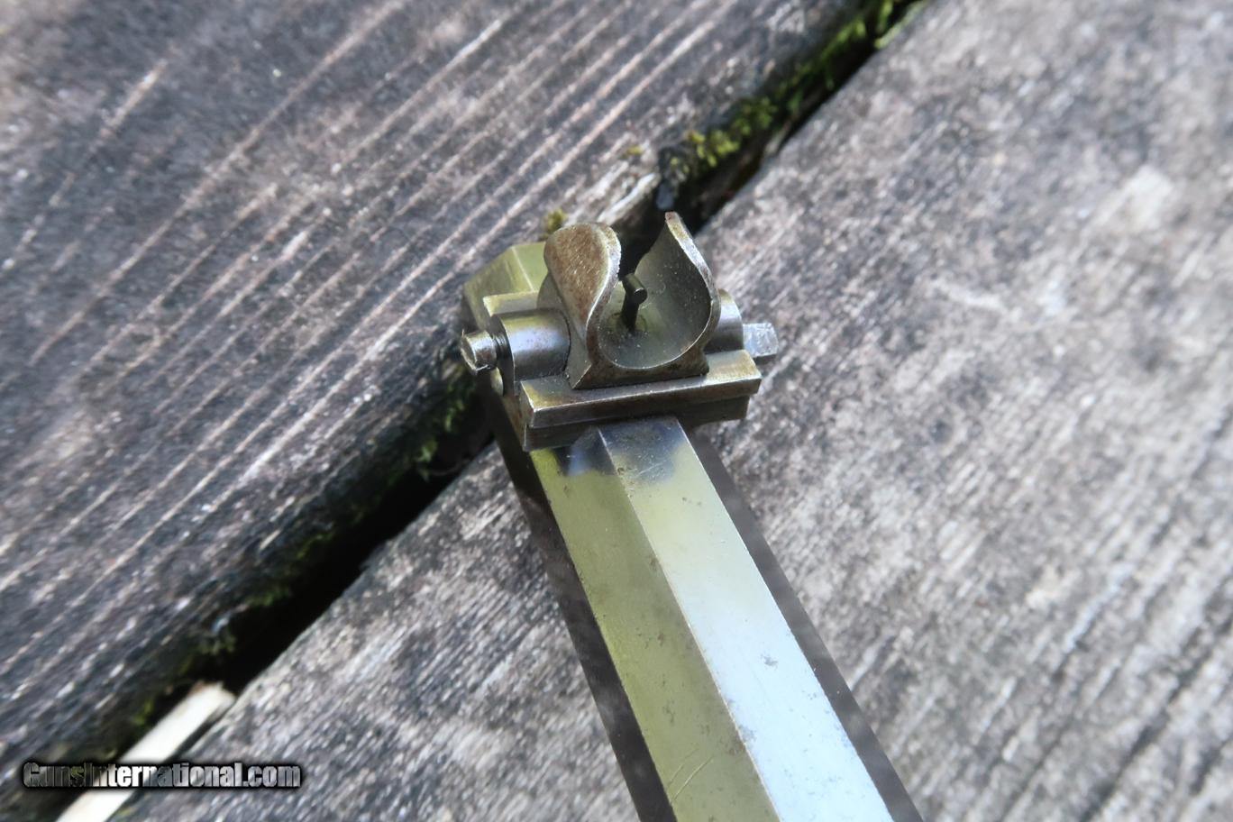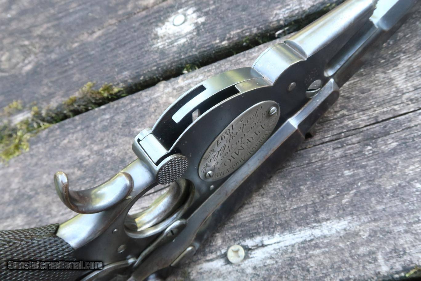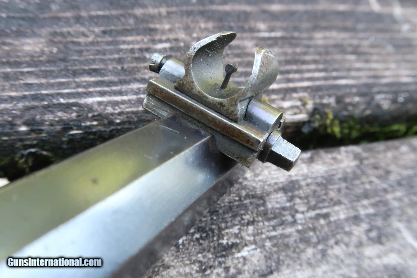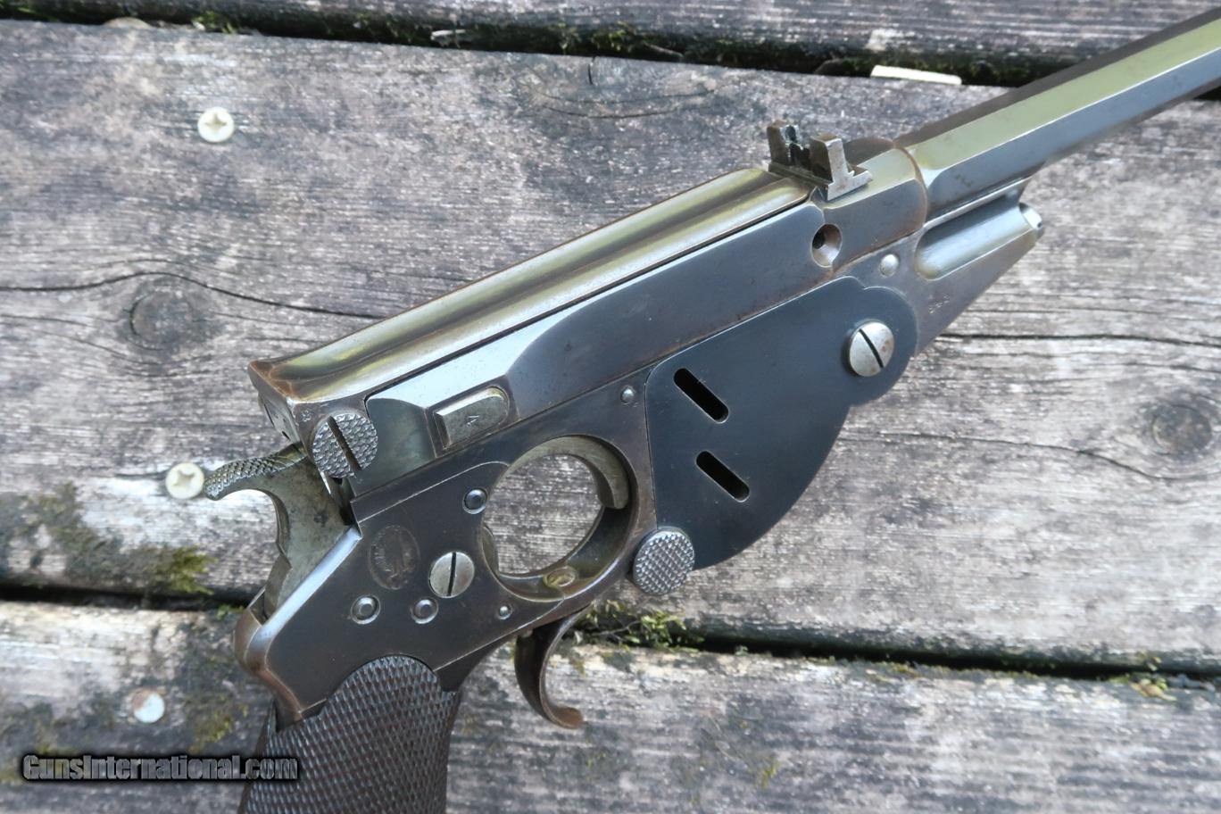 Description: Description: Standard configuration Bergmann 1896, No. 3, target pistol, 6.5mm, with extended barrel, fully adjustable target sights, spur trigger guard extension, refined set trigger, oversized, wraparound, and fully checkered target grips. A very early gun whose bolt was never cut for an extractor. Standard markings as applied to the usual 1896 pistols, this example having been given as an Argentine shooting prize in 1897 as reflected by the silver plaque mounted on the left side of the frame. Synopsis: Super Scarce Bergmann 1896, No. 3, Target Pistol, 6.5mm, SN: 842, ANTIQUE! Condition: VG+ original rust blue. Comparable condition fire blue and straw with fading and oxidative flecking consistent with the overall condition. No suggestion of enhancement. Near excellent grips. Very bright bore with sharp rifling. Perfect manual mechanics. One of the scarcest Bergmann pistols, instantly recognizable by its special/unique features, sure to please any collector of Bergmann or early design pistols, this 1896 being one of the earliest semiautomatic target pistols ever made! SOLD Manufacturer: Bergmann Serial Number: 842 Caliber Info: 6.5mm |
