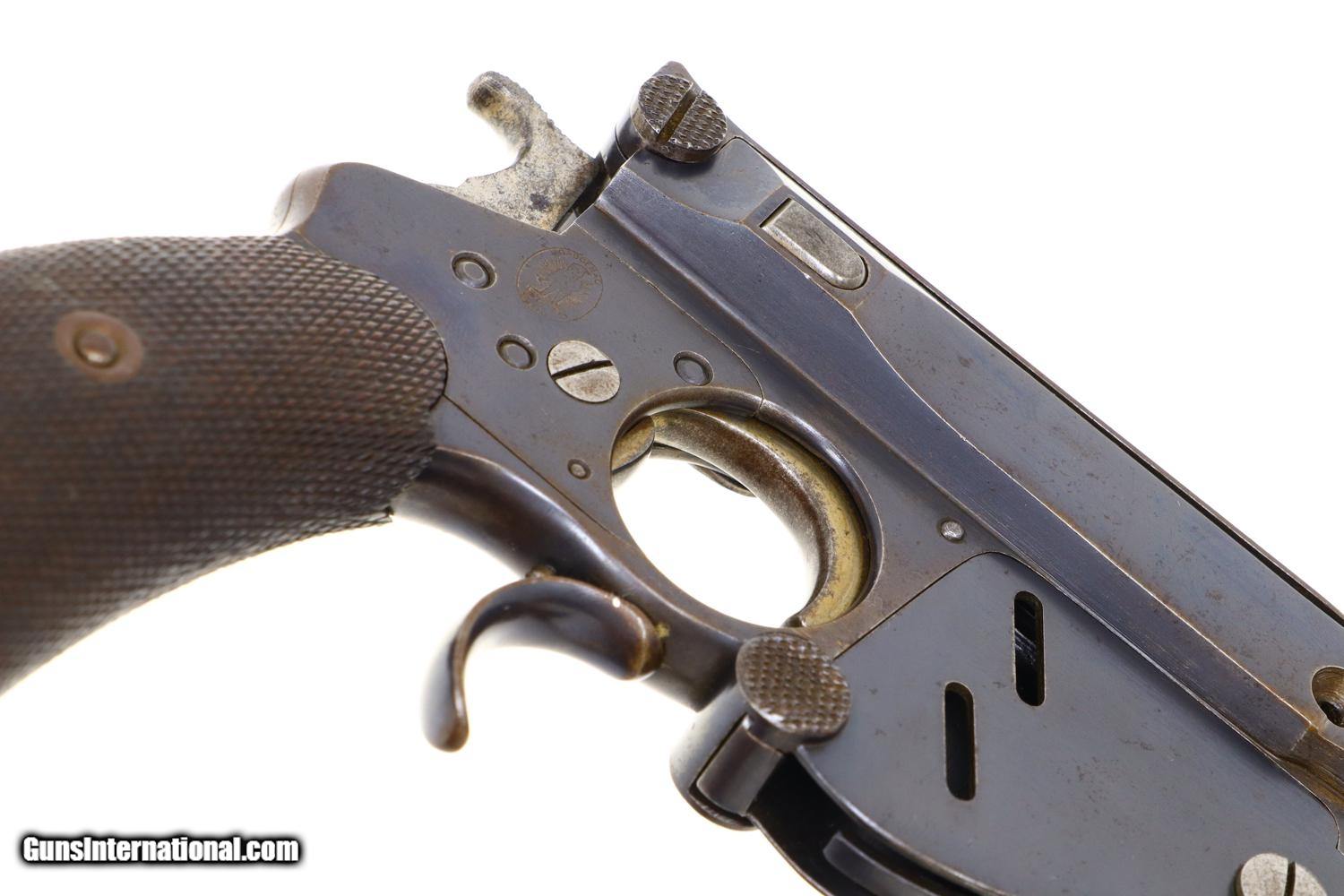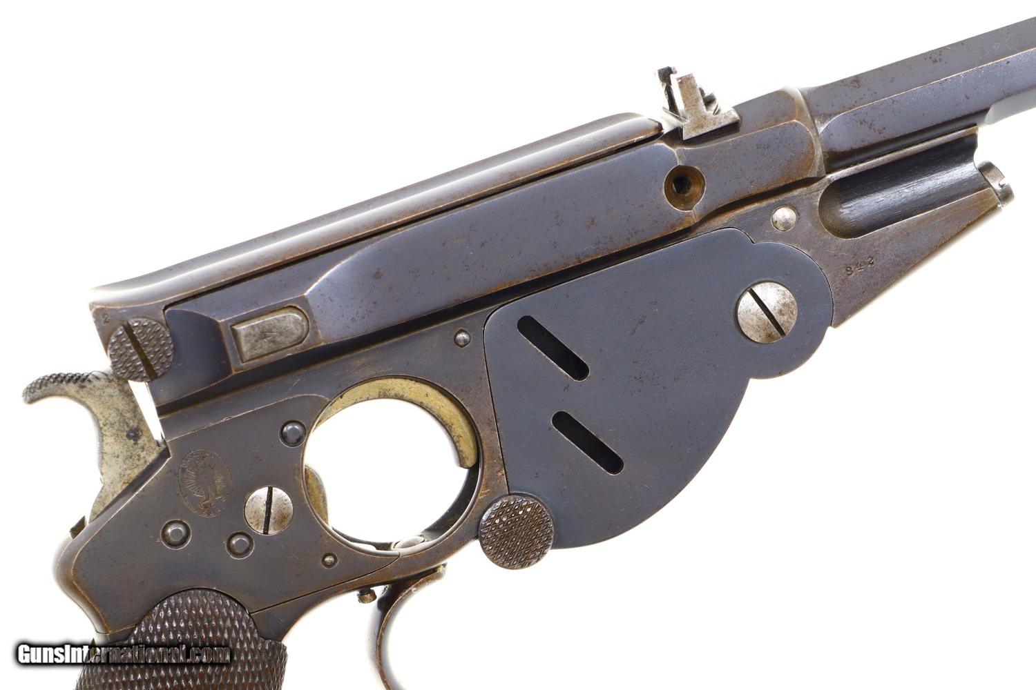 VG+ original rust blue. Comparable condition fire blue and straw with fading and oxidative flecking consistent with the overall condition. No suggestion of enhancement. Near excellent grips. Very bright bore with sharp rifling. Perfect manual mechanics. One of the scarcest Bergmann pistols, instantly recognizable by its special/unique features, sure to please any collector of Bergmann or early design pistols, this 1896 being one of the earliest semiautomatic target pistols ever made!