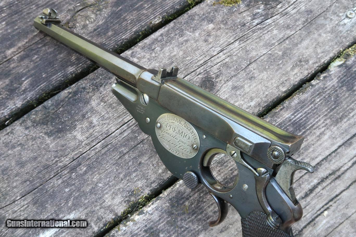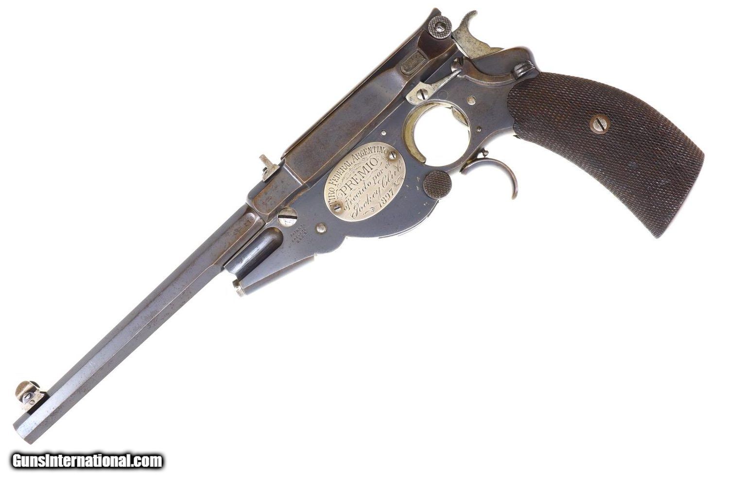 Standard configuration Bergmann 1896, No. 3, target pistol, 6.5mm, with extended barrel, fully adjustable target sights, spur trigger guard extension, refined set trigger, oversized, wraparound, and fully checkered target grips. A very early gun whose bolt was never cut for an extractor. Standard markings as applied to the usual 1896 pistols, this example having been given as an Argentine shooting prize in 1897 as reflected by the silver plaque mounted on the left side of the frame.