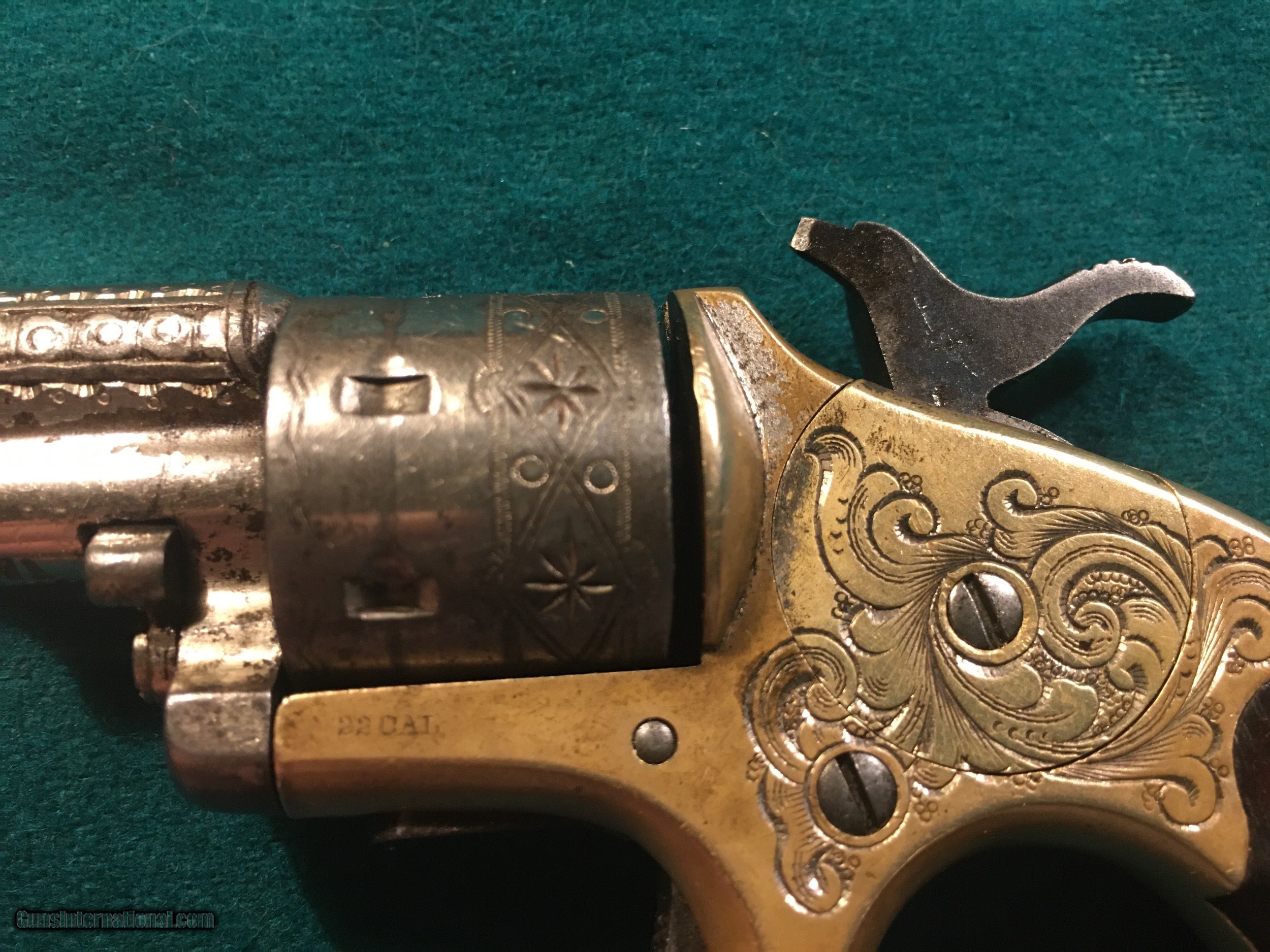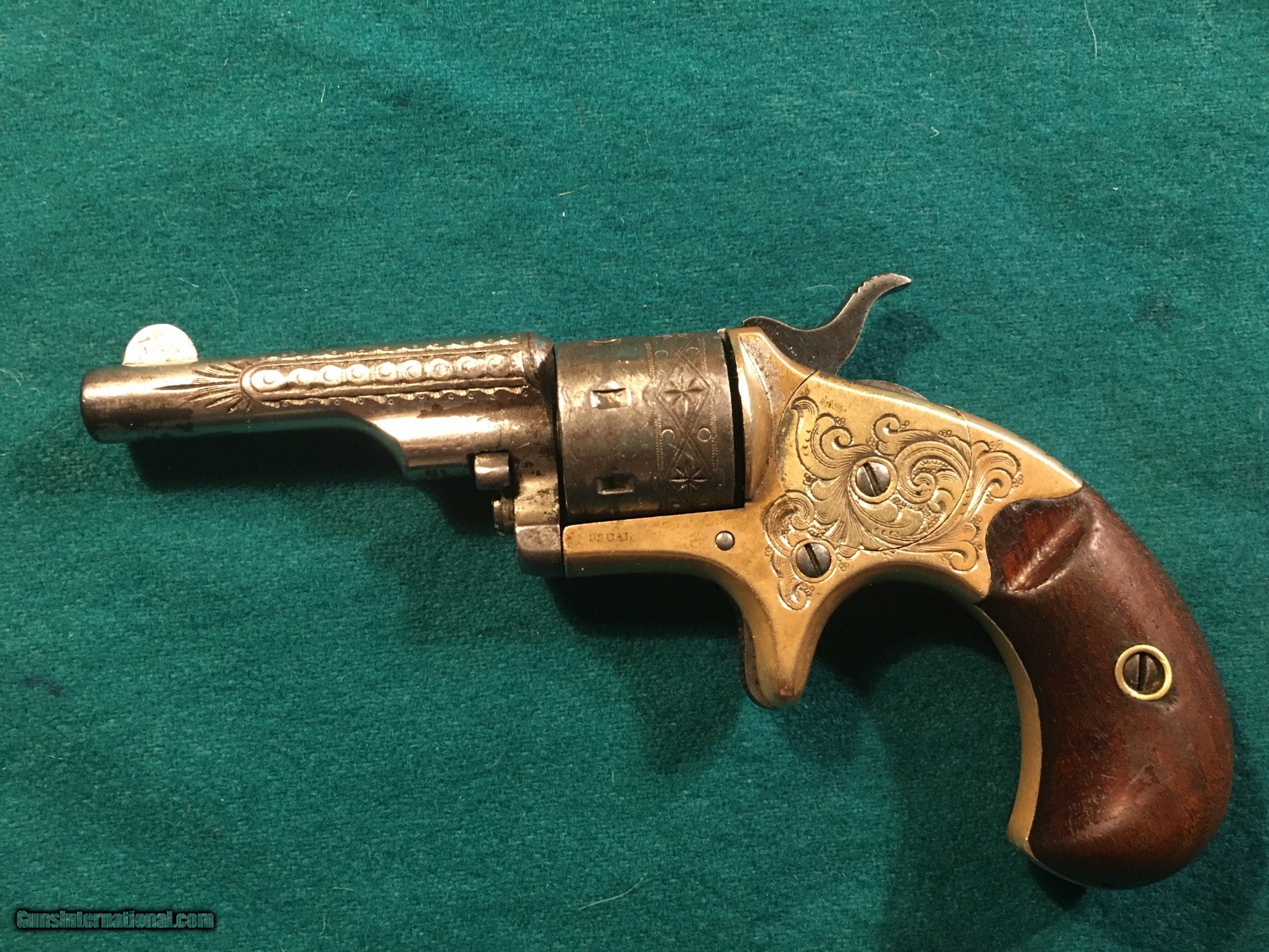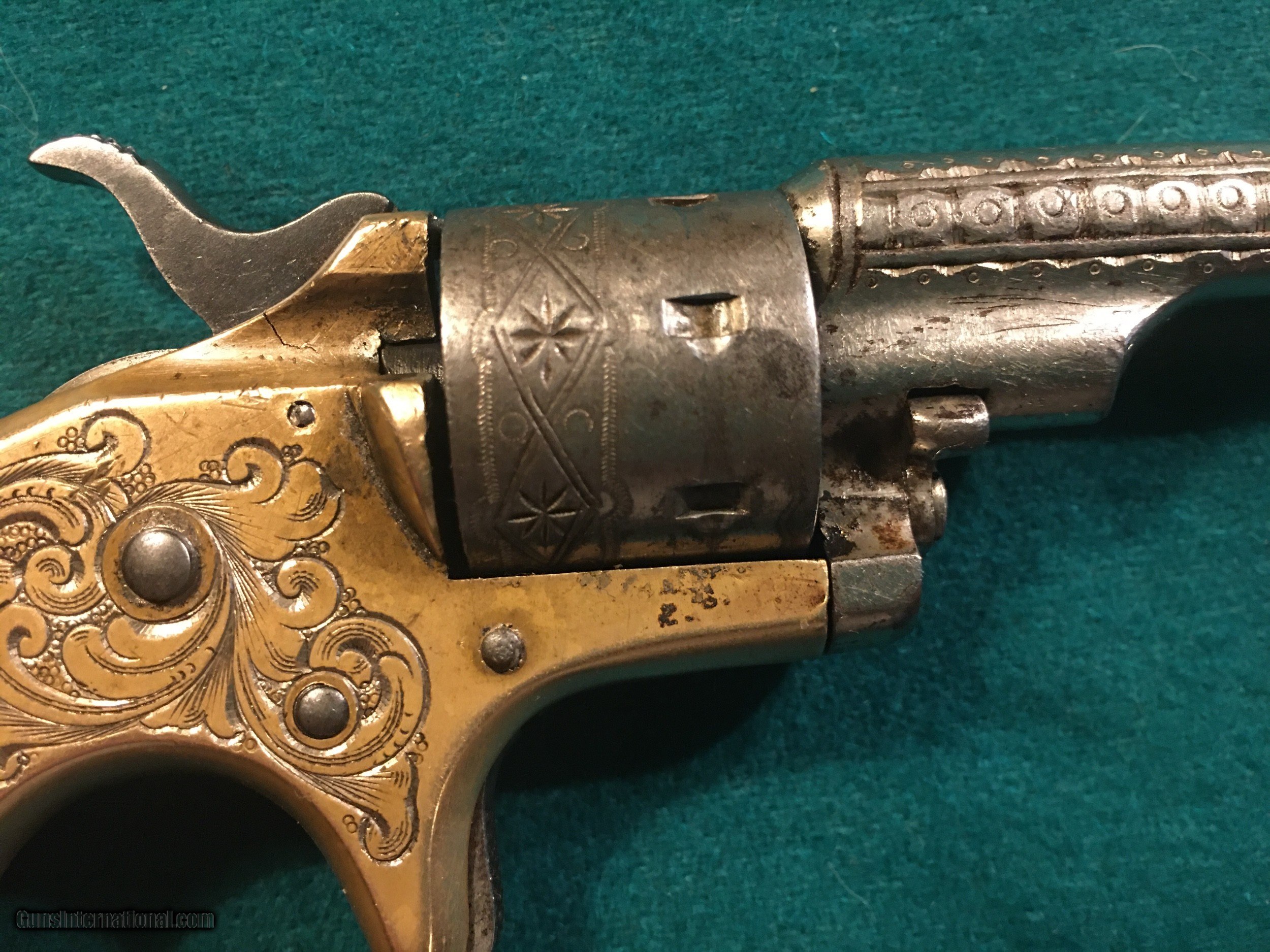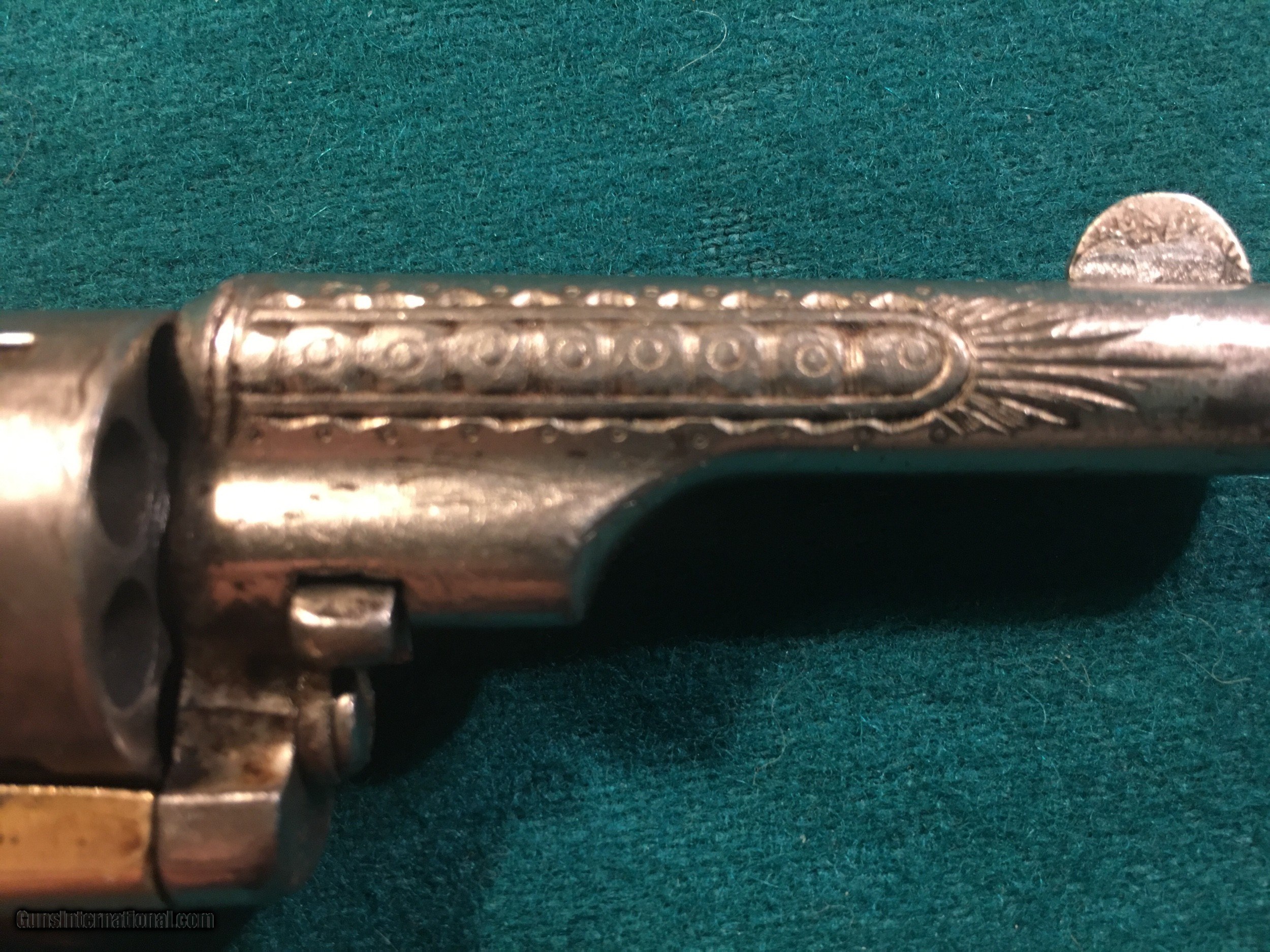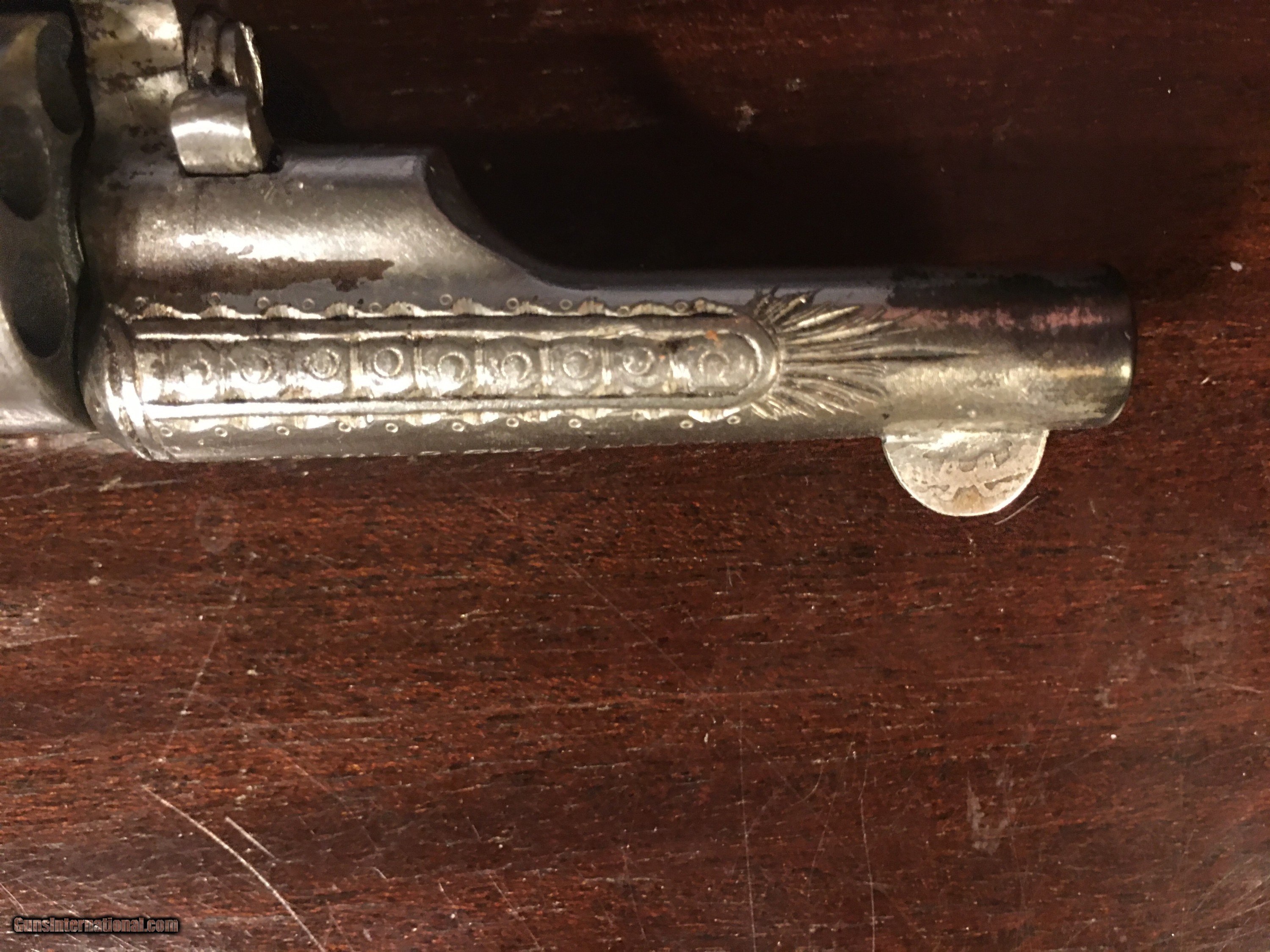Description: This is a fine example of .22 Colt Open Top pistol from the post Civil War era. It is in sound condition and exceptionally attractive. The author of the definitive book on Colt Open Top .22’s, Robert Swartz, and an expert on antiquarian engraving, contacted me after seeing this gun the day it was listed. He indicated that the engraving was done by Nimschke, and he included a descriptive photo of Nimschke’s work as a reference. Mr. Swartz’s book, now in its second printing, is called Colt’s Firearms At The Brink, and is a fascinating and surprising reference work on the Colt Open Top .22, the smallest, yet one of the most important guns Colt ever made. His email is discovercolt. This is a rather excellent black powder Colt 1871 Open Top .22rf short revolver. In the Hartley & Graham Factory engraved order of 1888. Very solid and very clean over all. Serial #71306. Grips in excellent condition. An extremely good looking pistol and an important part of the Colt line up following the Civil War. As nice as ever seen! Please email any questions! Buyer stipulates that he is over 21 and that it is legal to acquire and own this antique weapon in his jurisdiction. Not for sale to California. If you have a collection of engraved pistols or want to start a collection right at the top, this is an excellent candidate. Please send any offers. Possible trades for other early cartridge pistols. SOLD Antique: Yes Handgun Caliber: .17 HMR, 5mm Clement, 5.5mm Velo Dog, .22 CB, .22 Reed Express, .22 Remington Jet (.22 Jet, .22 Centerfire Magnum), 5.56x45mm NATO Manufacturer: Colt Model: 1871 Open Top .22 Chambers: 7 Condition: Excellent Action: Single Manufacture Date: 1870-1888 Engraving: Full Nimschke Engraving |