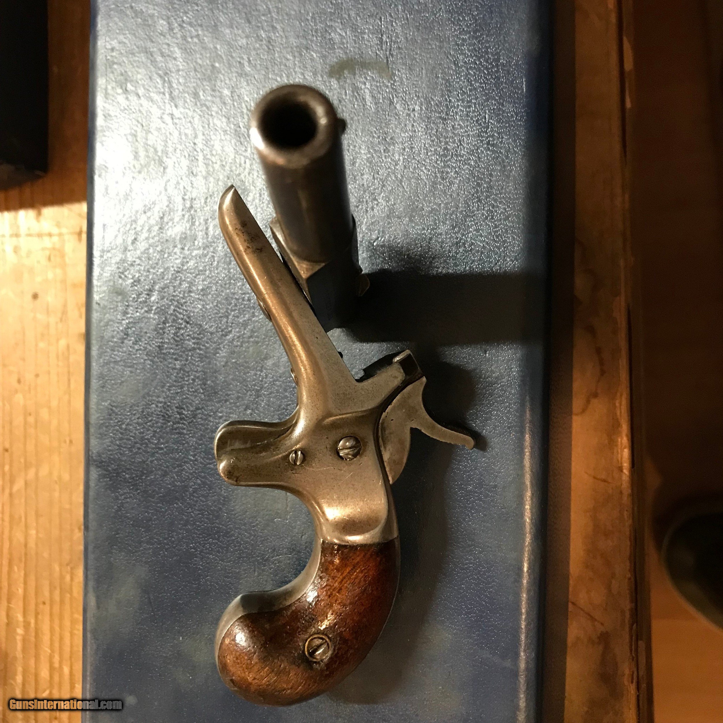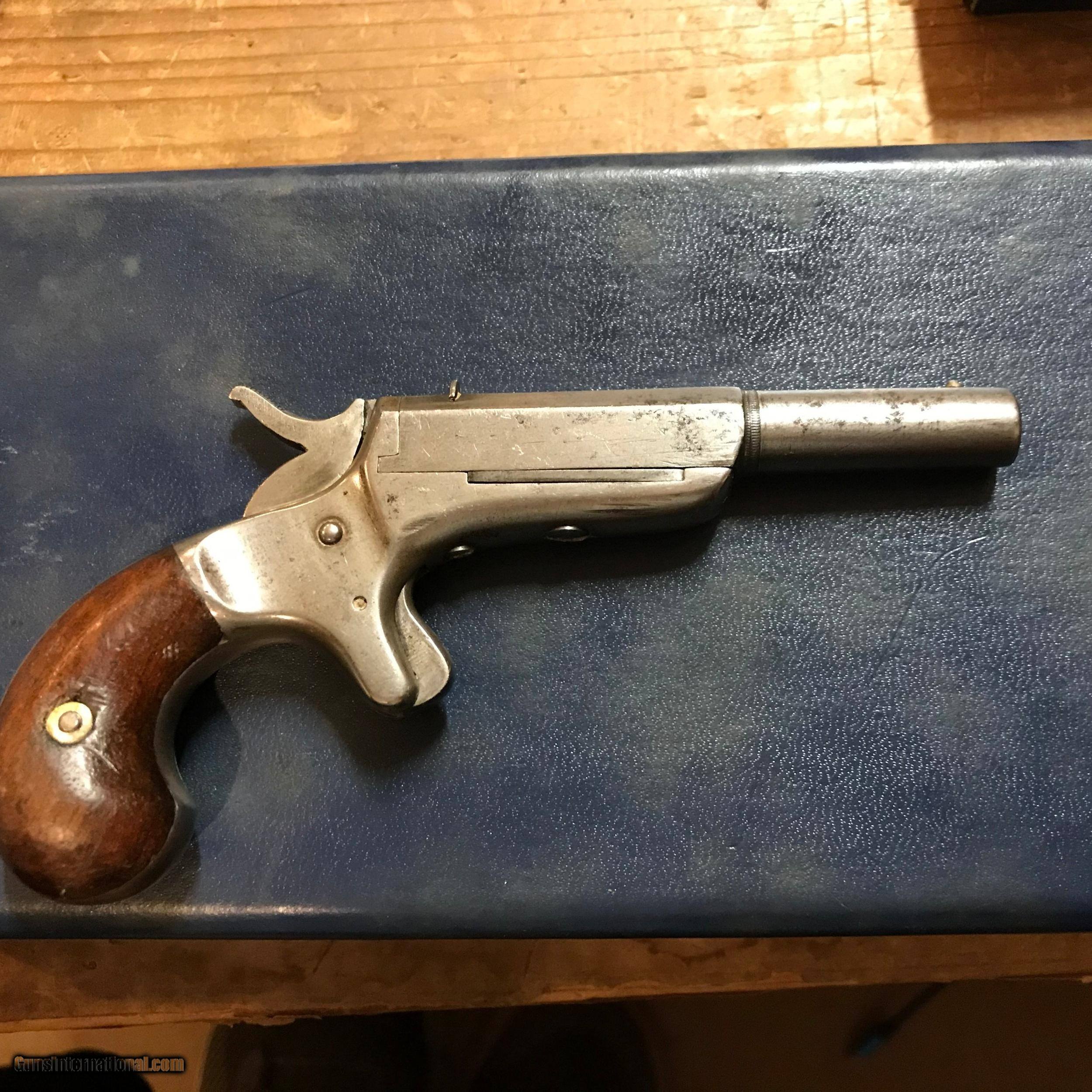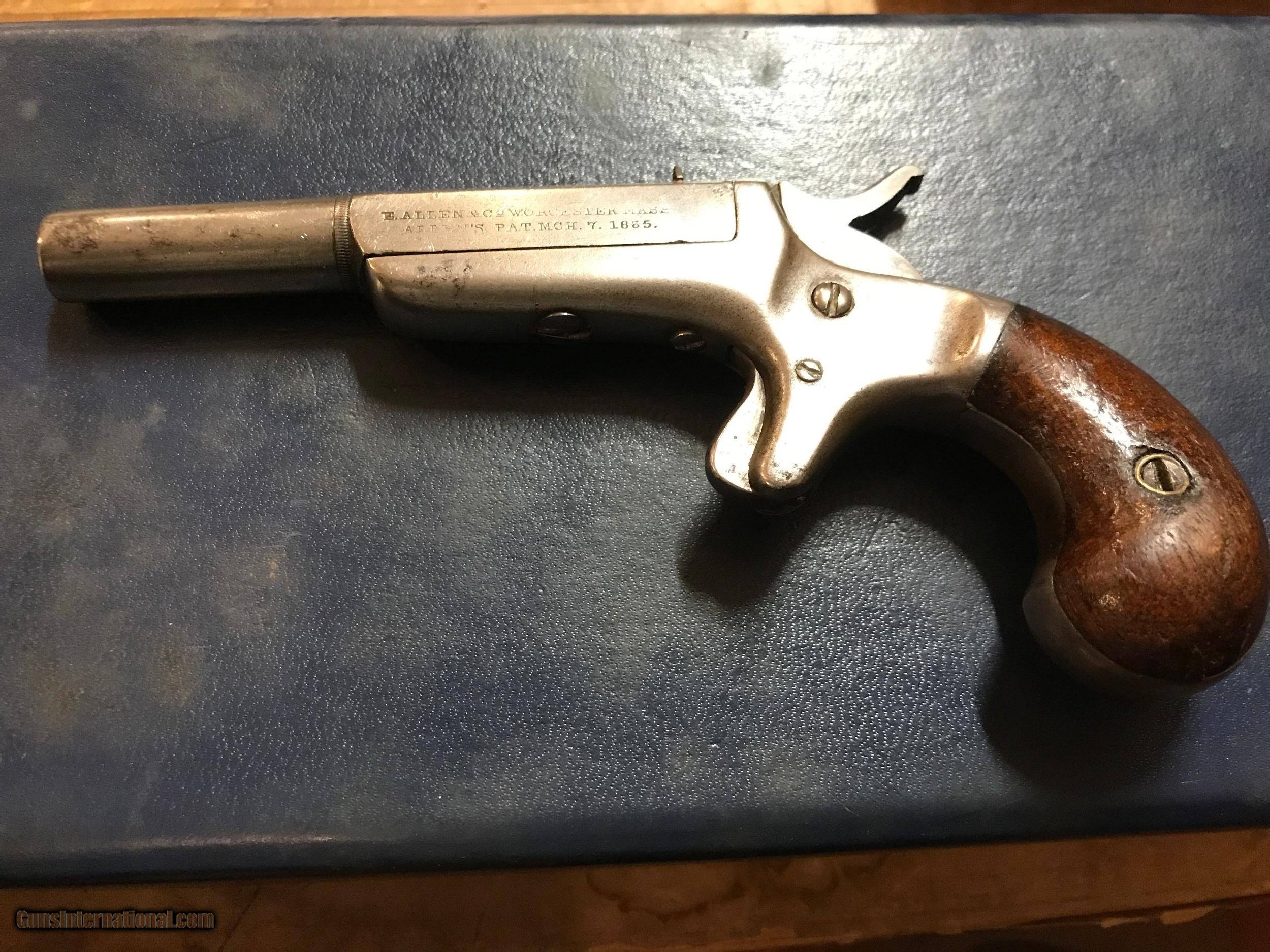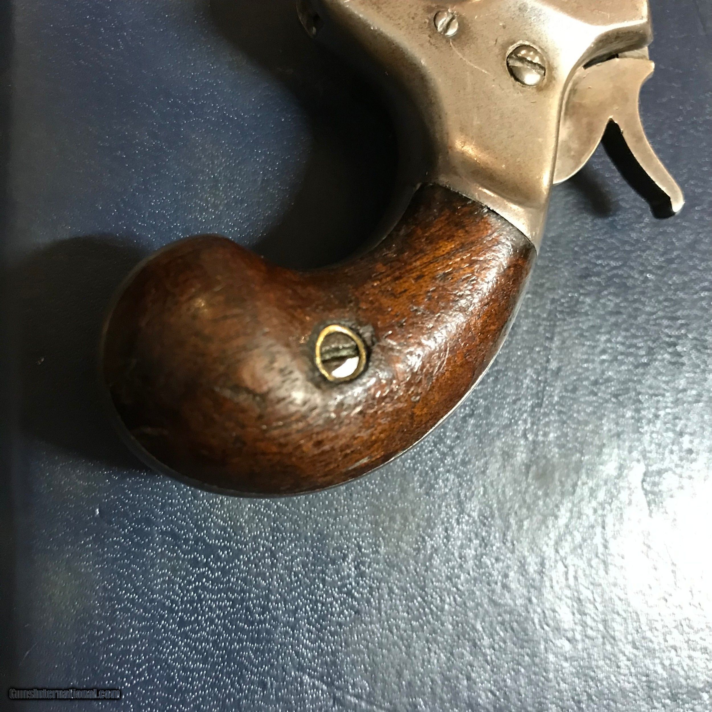 Description: 22 caliber swivel barrel pistol. 3" barrel. Nickel plated. Wood birds head grips. Functions. "Allen's Pat. Mch.7, 1865" ANTIQUE NO FFL SOLD Antique: Yes |