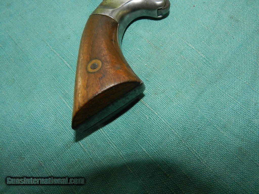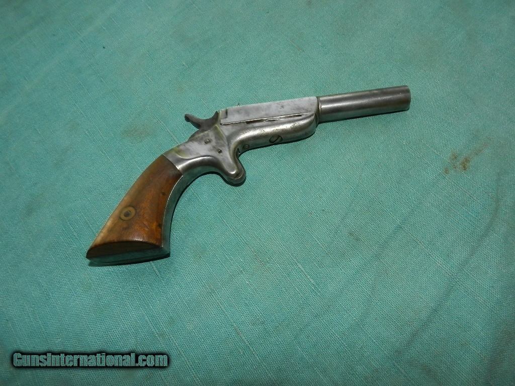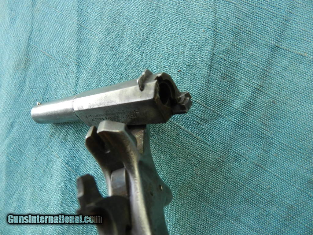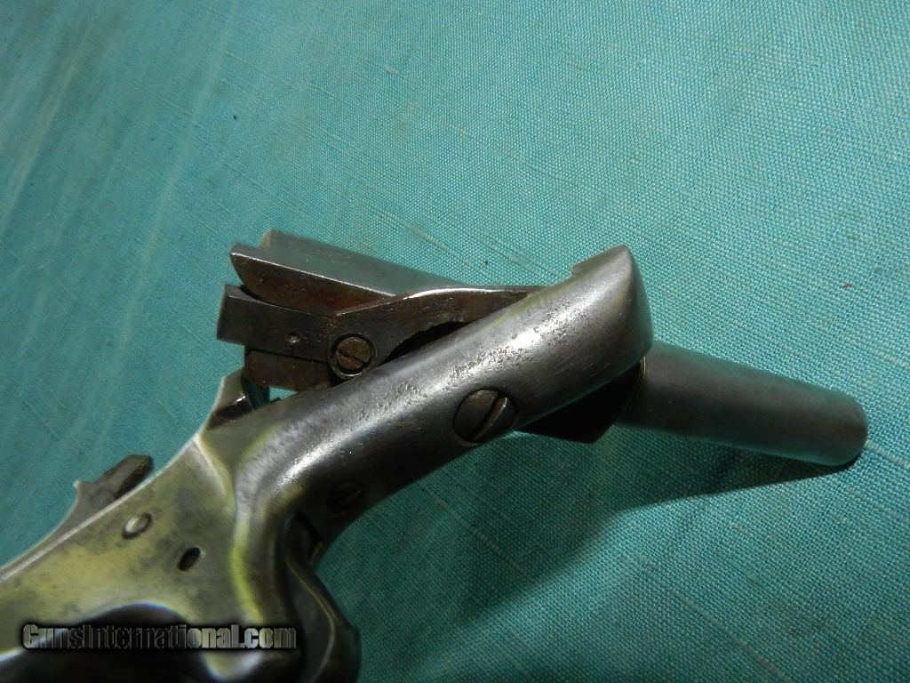 Description: SOLD A very scarce American single shot .32 cal rimfire Derringer manufactured circa 1865-1871. Engraved on the side of barrel "E. Allen & Co. Worcester Mass. Allen's Pat March 7th 1865". Iron frame with side swivel barrel for loading. Spur trigger. The wooden grips showing signs of wear and use, the condition is reasonable, and the action works fine. Overall length approx 7 1/2" inches long. The underside of barrel is fitted with a sliding ejector. This is an interesting and unusual early model derringer, total production acording to Flaydermman's guide is estimated at less than two thousand guns, making this a scarce model with a 3 7/8" long with sharp rifling and few patches of surface corrosion.When buying a gun always have it examined by a competent gunsmith before shooting. To buy a gun from me you must get a direct email for me, with details, and shipping cost. We don’t have a web site .I prefer money orders or a check. Item ships when funds come in. I try to keep guns affordable, which means I make less money than most dealers. You won’t get altitude sickness, or nose bleed, with my prices! I consistently have the best selection of older guns If you attempt to buy, you must still contact us for details . Best to email to buy. Sometimes a local person can stop buy and purchase before the gun is removed. Sometimes not home to get calls. Some guns are required shipment to a gun dealer near you for a transfer to you when it arrives. Otherwise many older or black powder guns ship to your door. With the widest selection of older guns at great prices, We don’t have a store, and sell on the internet only. I’m easy to get along with. Thank You[JB1] [JB1] SOLD Antique: Yes |