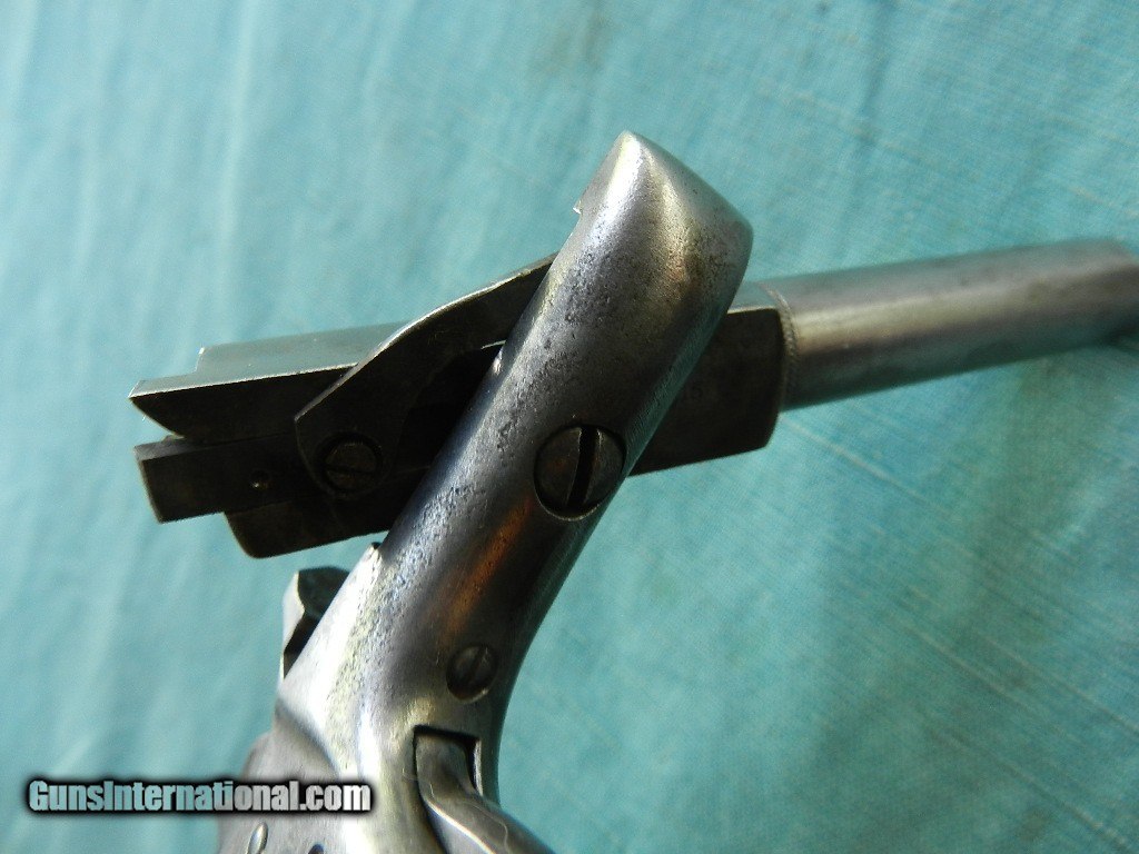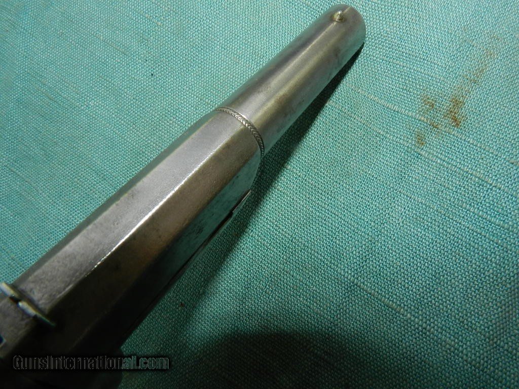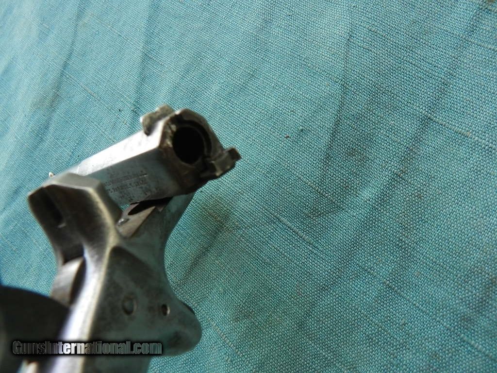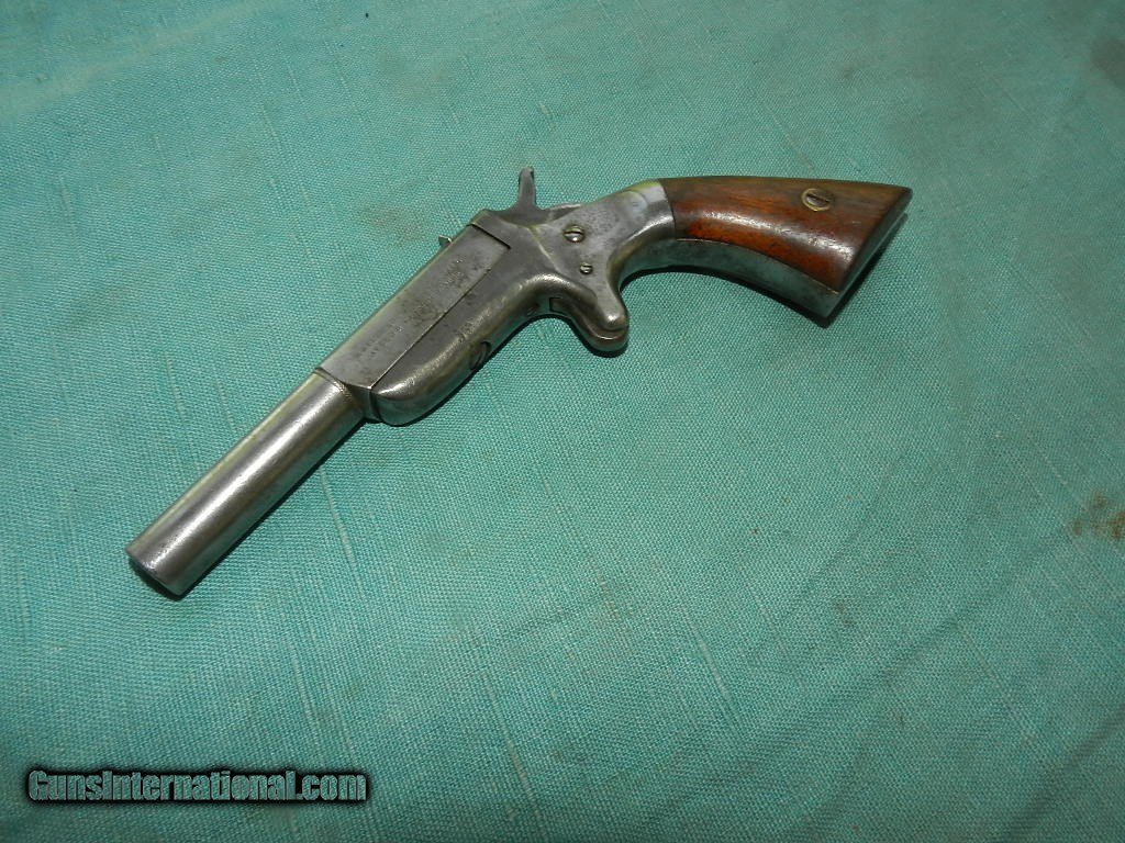 Description: SOLD A very scarce American single shot .32 cal rimfire Derringer manufactured circa 1865-1871. Engraved on the side of barrel "E. Allen & Co. Worcester Mass. Allen's Pat March 7th 1865". Iron frame with side swivel barrel for loading. Spur trigger. The wooden grips showing signs of wear and use, the condition is reasonable, and the action works fine. Overall length approx 7 1/2" inches long. The underside of barrel is fitted with a sliding ejector. This is an interesting and unusual early model derringer, total production acording to Flaydermman's guide is estimated at less than two thousand guns, making this a scarce model with a 3 7/8" long with sharp rifling and few patches of surface corrosion.When buying a gun always have it examined by a competent gunsmith before shooting. To buy a gun from me you must get a direct email for me, with details, and shipping cost. We don’t have a web site .I prefer money orders or a check. Item ships when funds come in. I try to keep guns affordable, which means I make less money than most dealers. You won’t get altitude sickness, or nose bleed, with my prices! I consistently have the best selection of older guns If you attempt to buy, you must still contact us for details . Best to email to buy. Sometimes a local person can stop buy and purchase before the gun is removed. Sometimes not home to get calls. Some guns are required shipment to a gun dealer near you for a transfer to you when it arrives. Otherwise many older or black powder guns ship to your door. With the widest selection of older guns at great prices, We don’t have a store, and sell on the internet only. I’m easy to get along with. Thank You[JB1] [JB1] SOLD Antique: Yes |