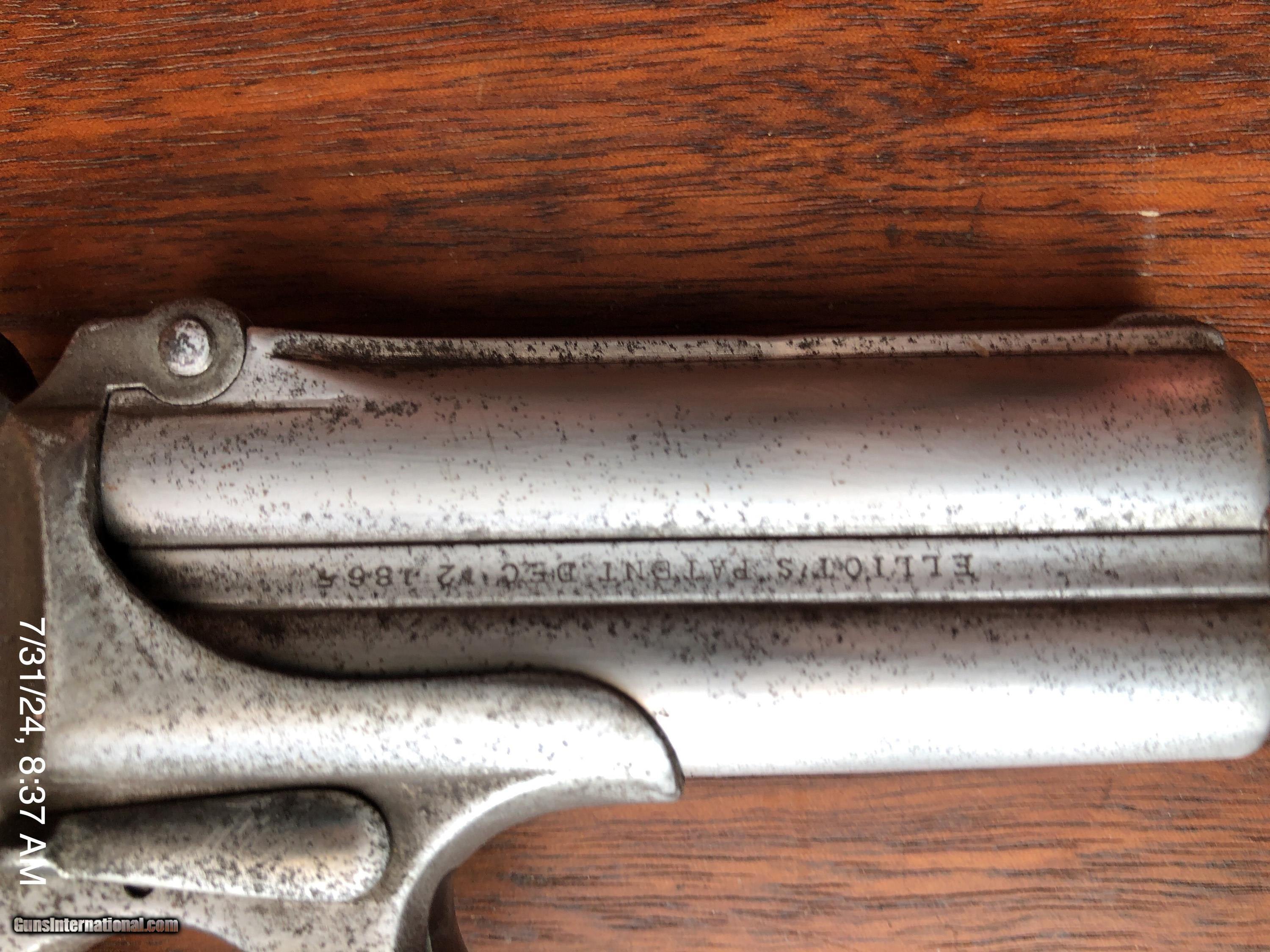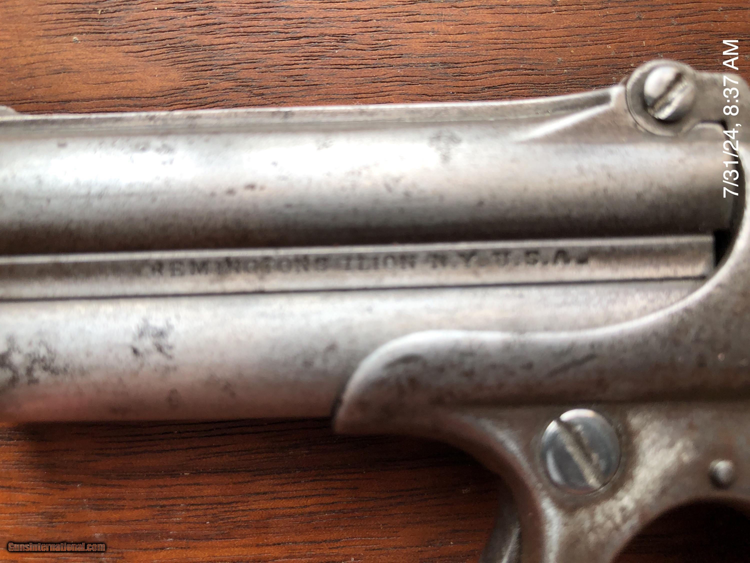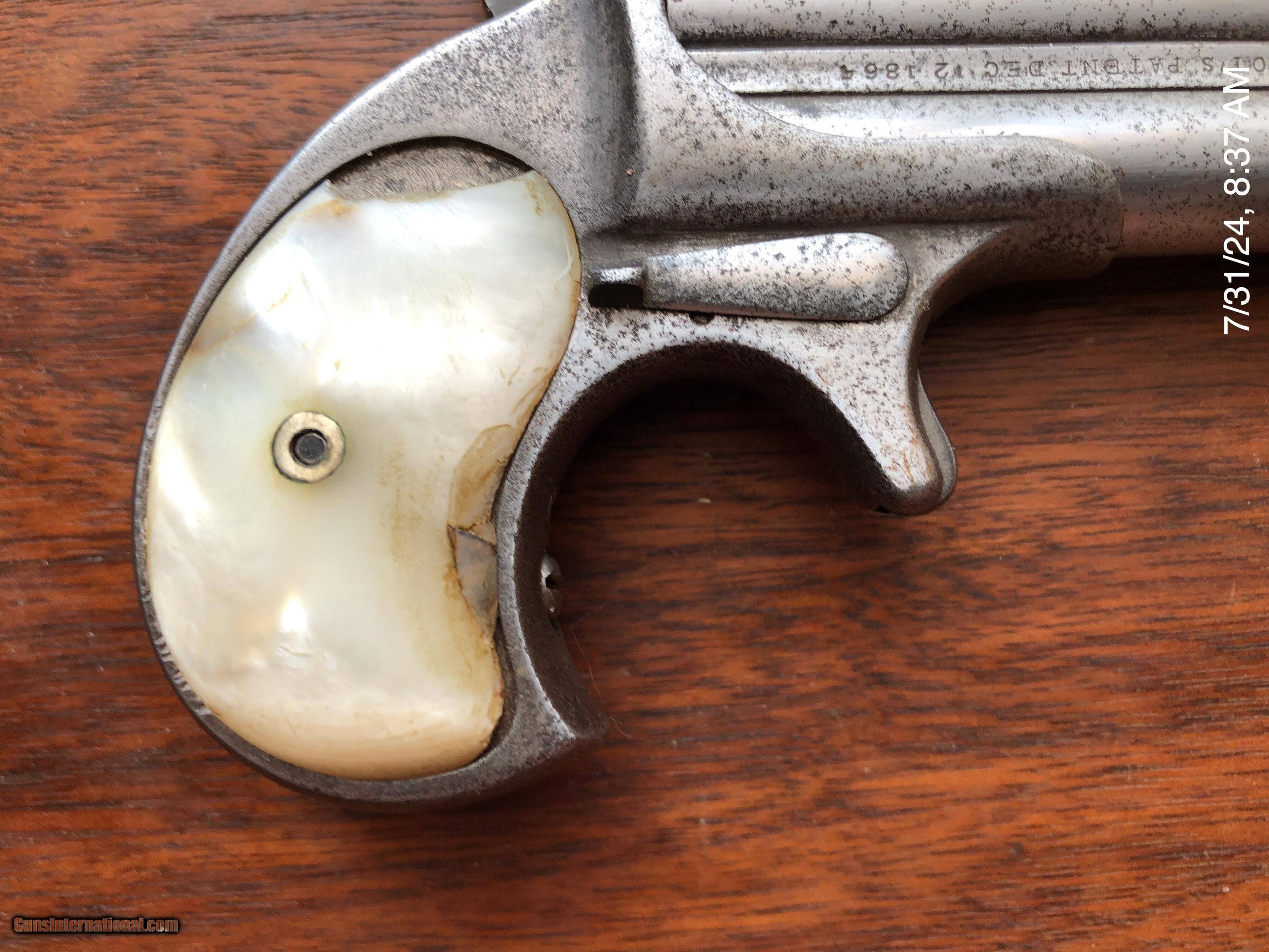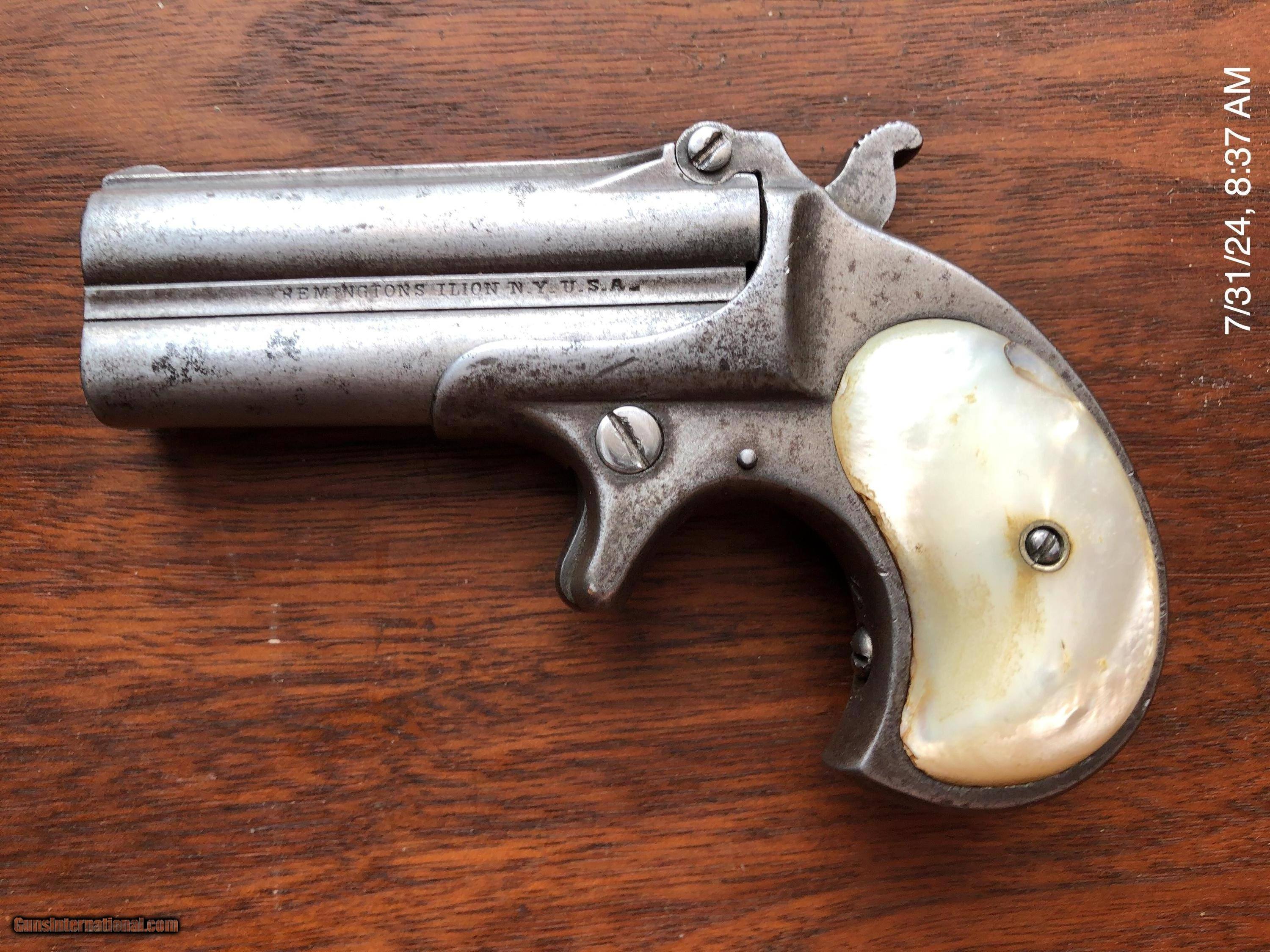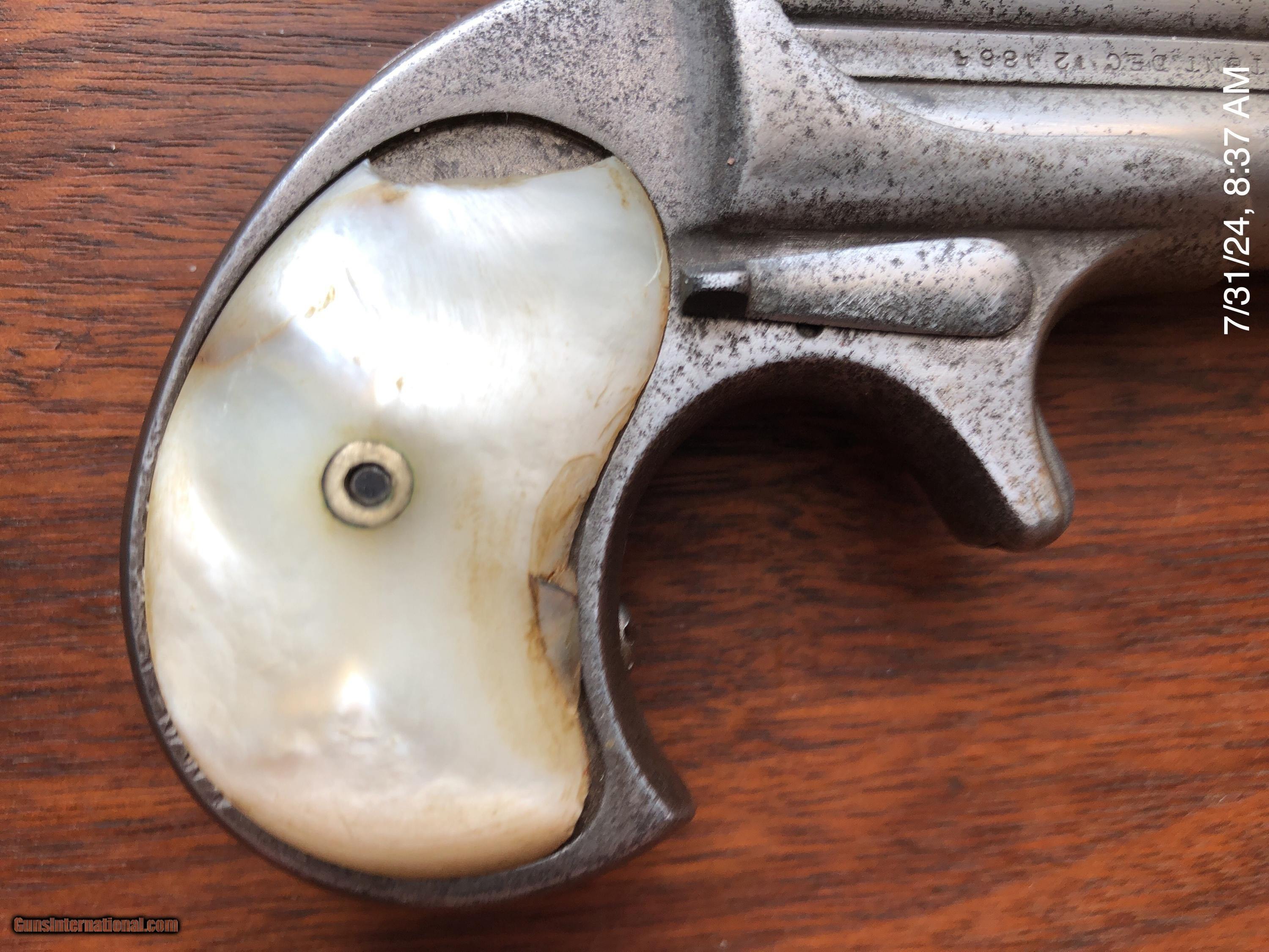 Description: This is the never seen original Remington Double Barrel Derringer that was made for a short period of months with no extractor and with barrel dates and addresses on the sides. There were only a few of these made out of the eventual 135,000 production. This pistol has been cleaned during its life, but it is solid and all stampings are easily read. The mechanics are crisp and the firing pin indexes properly. Bores are dirty but may clean up better. Hinges are perfect. I have been involved with antique guns for sixty years and have only seen photos of this scarce model. I have never seen one in person before. The Pearl grips have some cracking and a chip at the top of one, but they are 160 years old...it's the Holy Grail of all Remington derringers. No FFL required. Buyer stipulates it is legal for him to own this gun. Please, no shipments to California, New Jersey, New York or other areas where prohibited or regulated. This is an antique colllector's gun and is not for actual use. Please send any questions. Thank you. SOLD Antique: Yes |