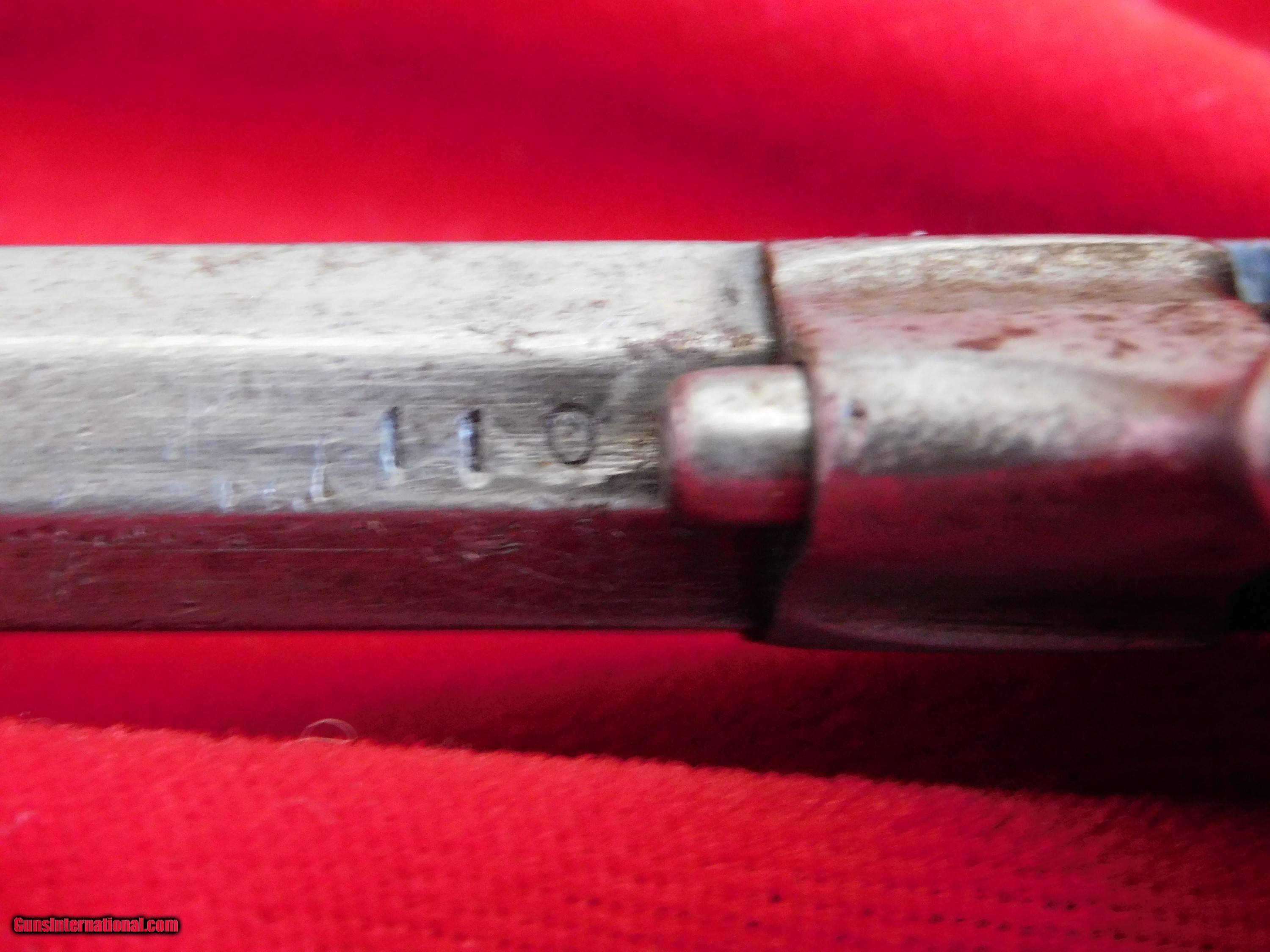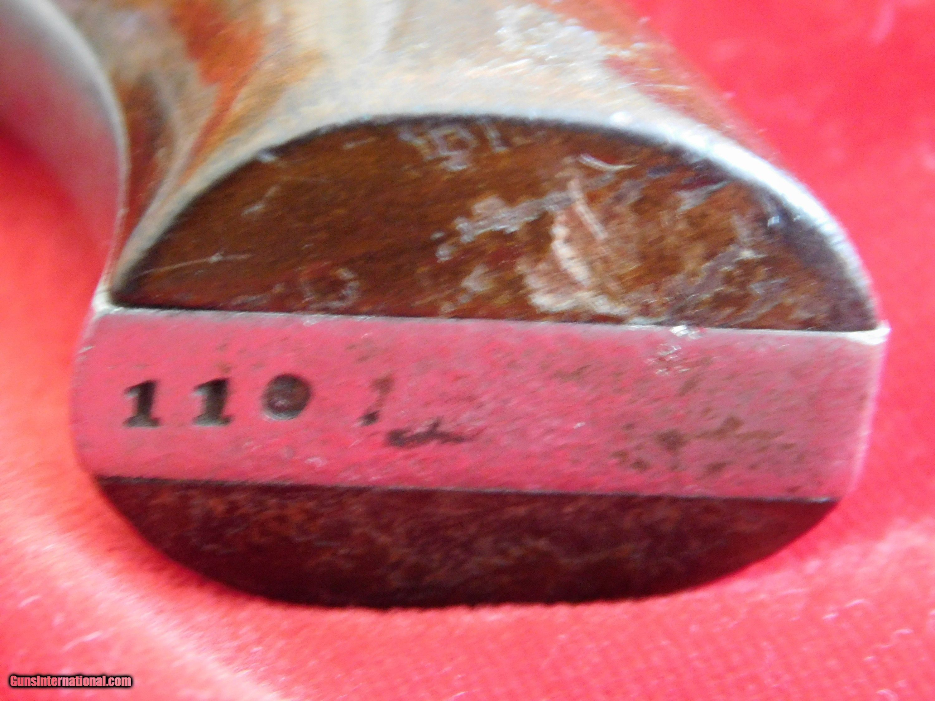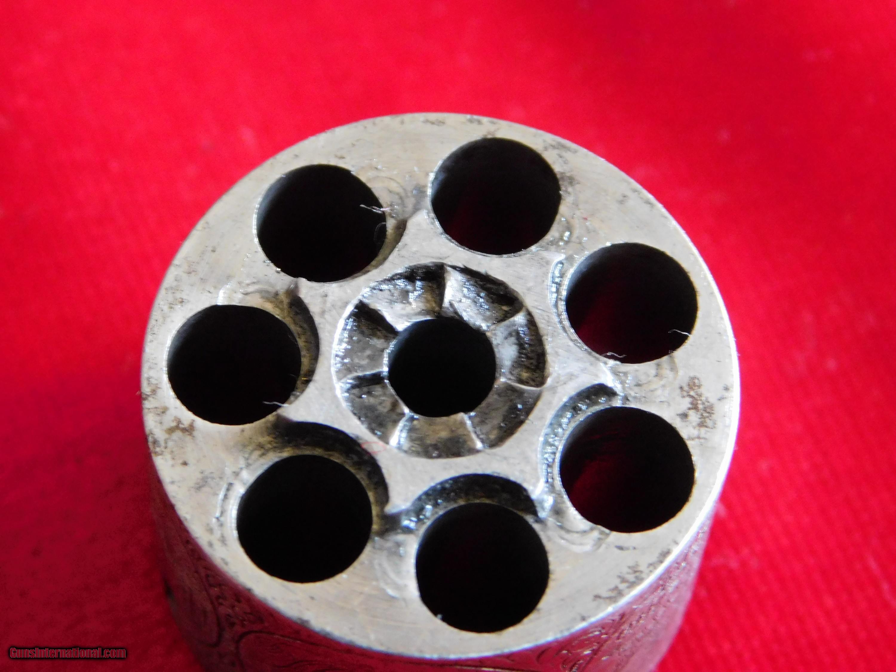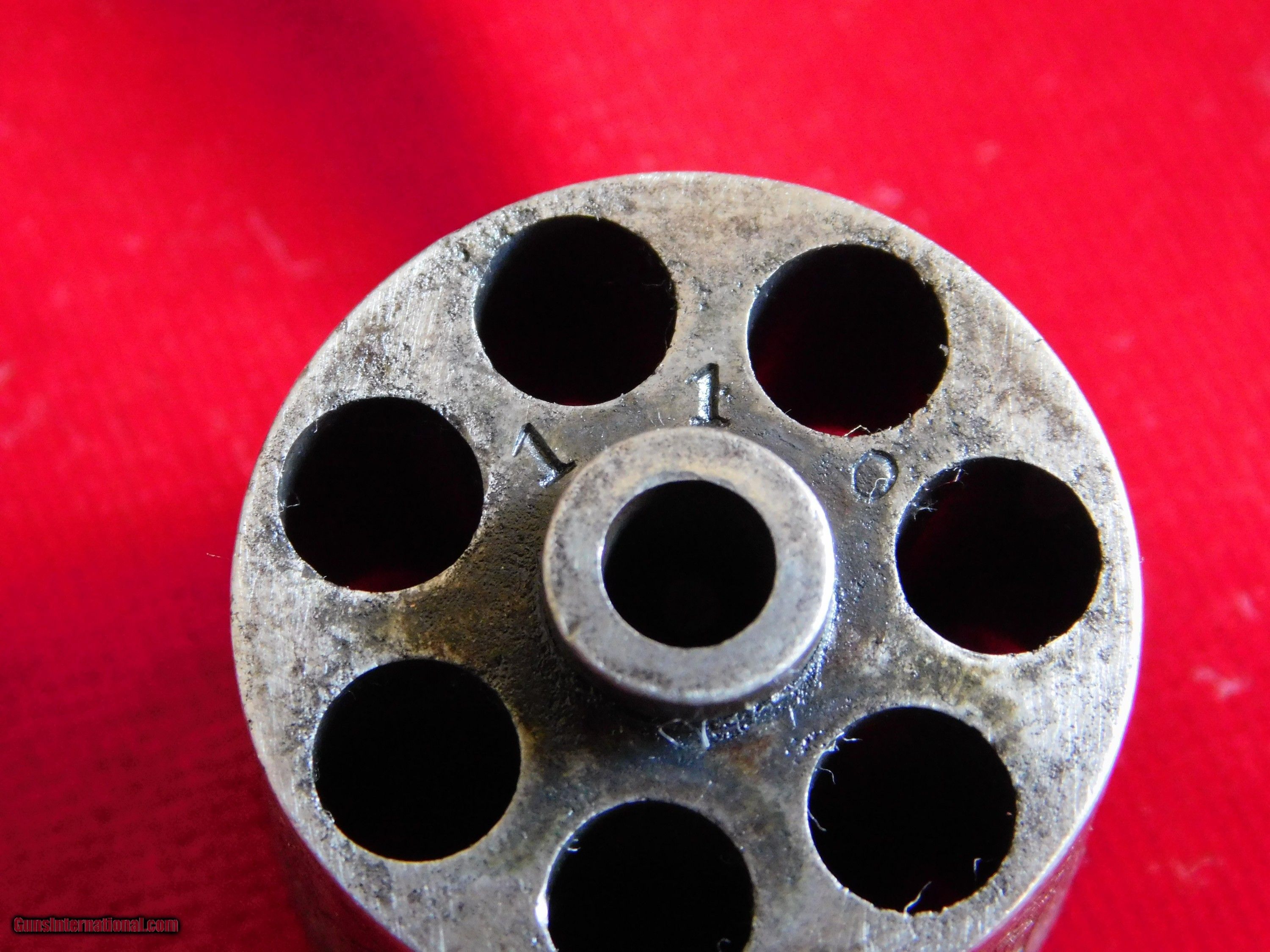Description: For sale is an early model Allen & Wheelock Sidehammer .22 rimfire revolver from my personal collection. NOTE: This is intended for black powder .22s, not modern cartridges. It was made by Allen & Wheelock between 1858-1859 and the frame is not dated 1860. The barrel, frame, cylinder pin , and grips are all stamped with the matching number batch number, “110.” It has a grooved topstrap for sighting. The octagon barrel is 2” long with a good bore, with shine. All seven chambers are clean. The barrel is crisply marked "ALLEN & WHEELOCK, WORCESTER, MA U.S./ALLEN’S PAT'S SEPT. 7, NOV.9 1858." It has very good walnut grips that retain their original finish. The cylinder is roll engraved with five circular panels depicting mounted rider, standing Indian (seal of Massachusetts), ship and other military trophy deigns. The hammer cocks well and the cylinder cycles and locks. The cylinder pin enters from rear; there are nicks on the backstrap under the rod (shown), likely indicating removal of a stuck rod. This piece has a clean, even finish with a pleasing patina. Overall, it is in good to very good condition. I accept money order, bank check, or personal check. I ship after a personal check clears. Shipping $35 SOLD Antique: Yes Handgun Caliber: .22 Short |