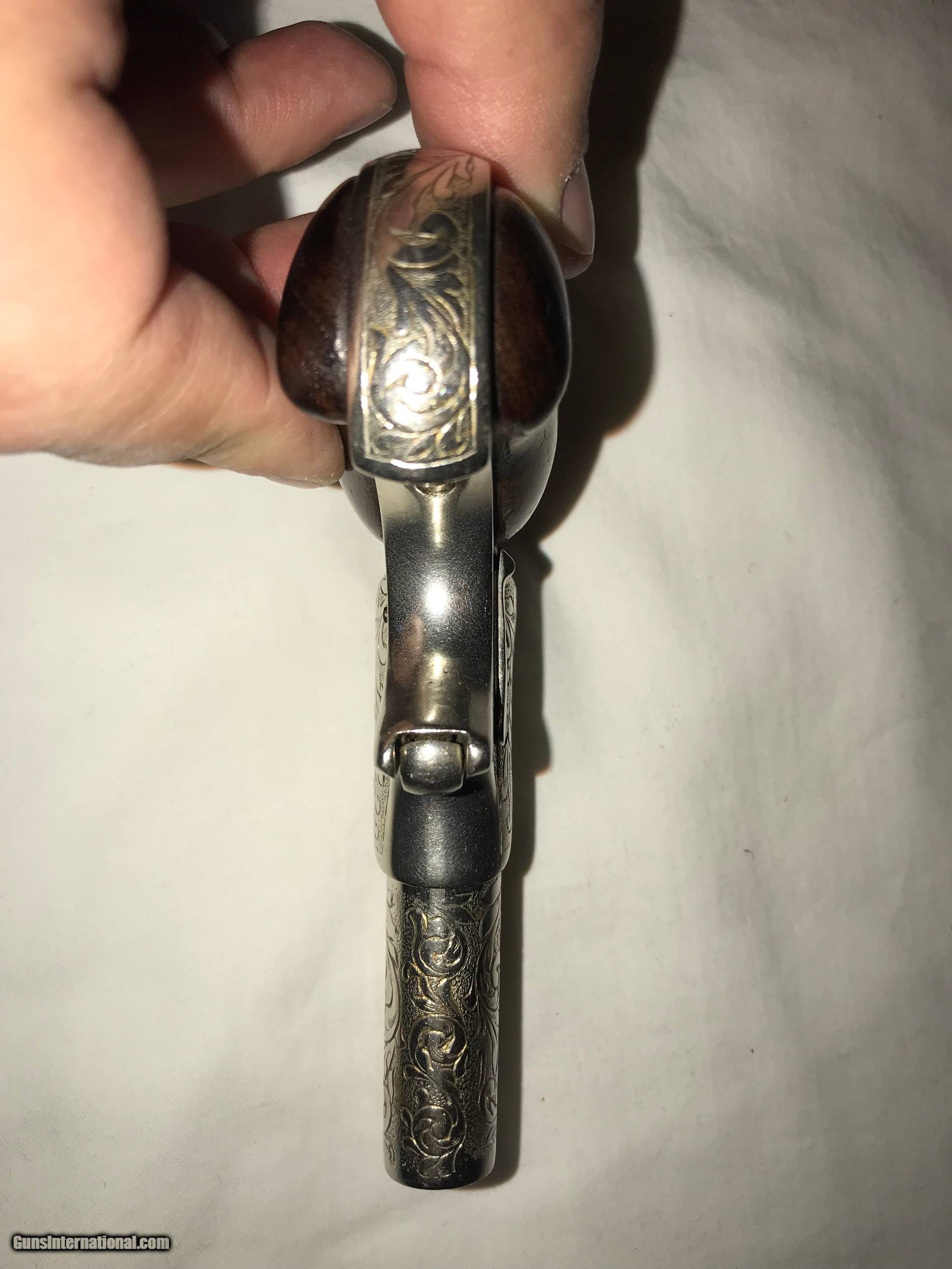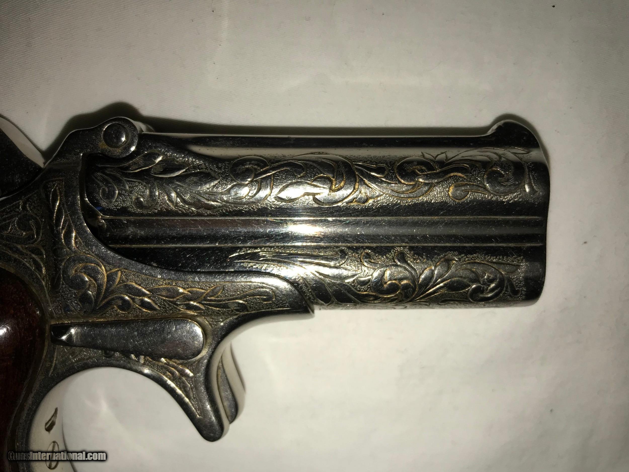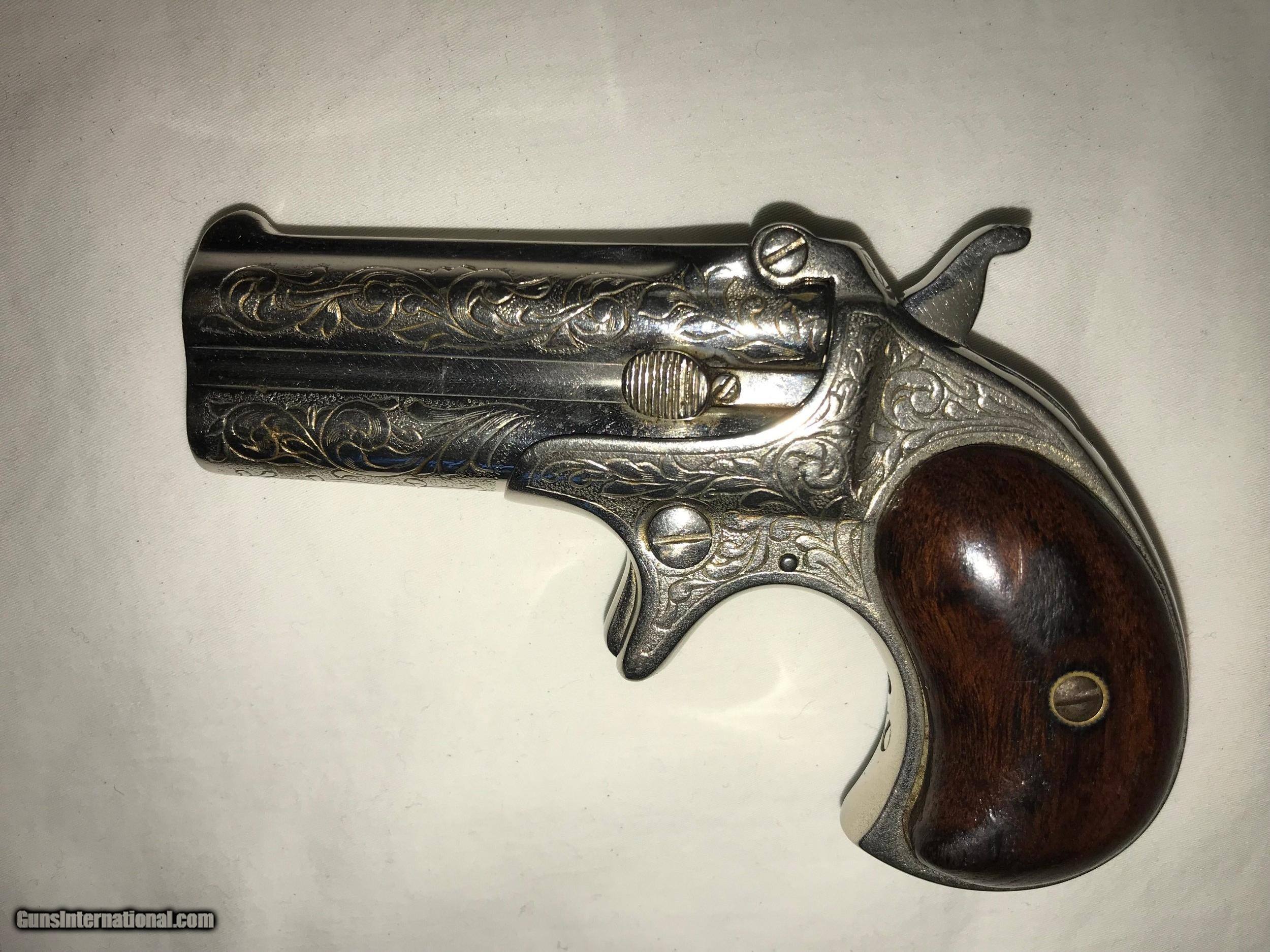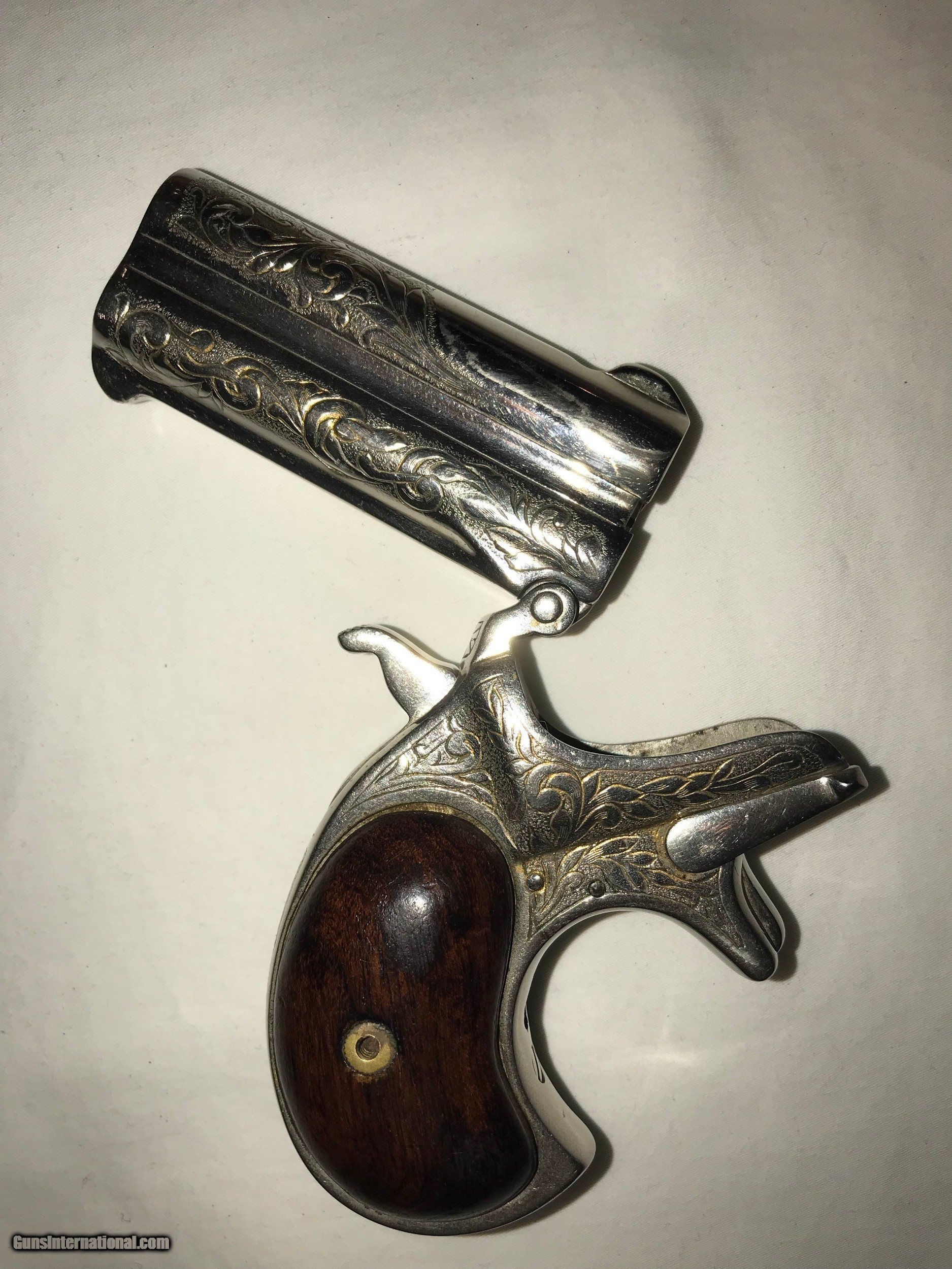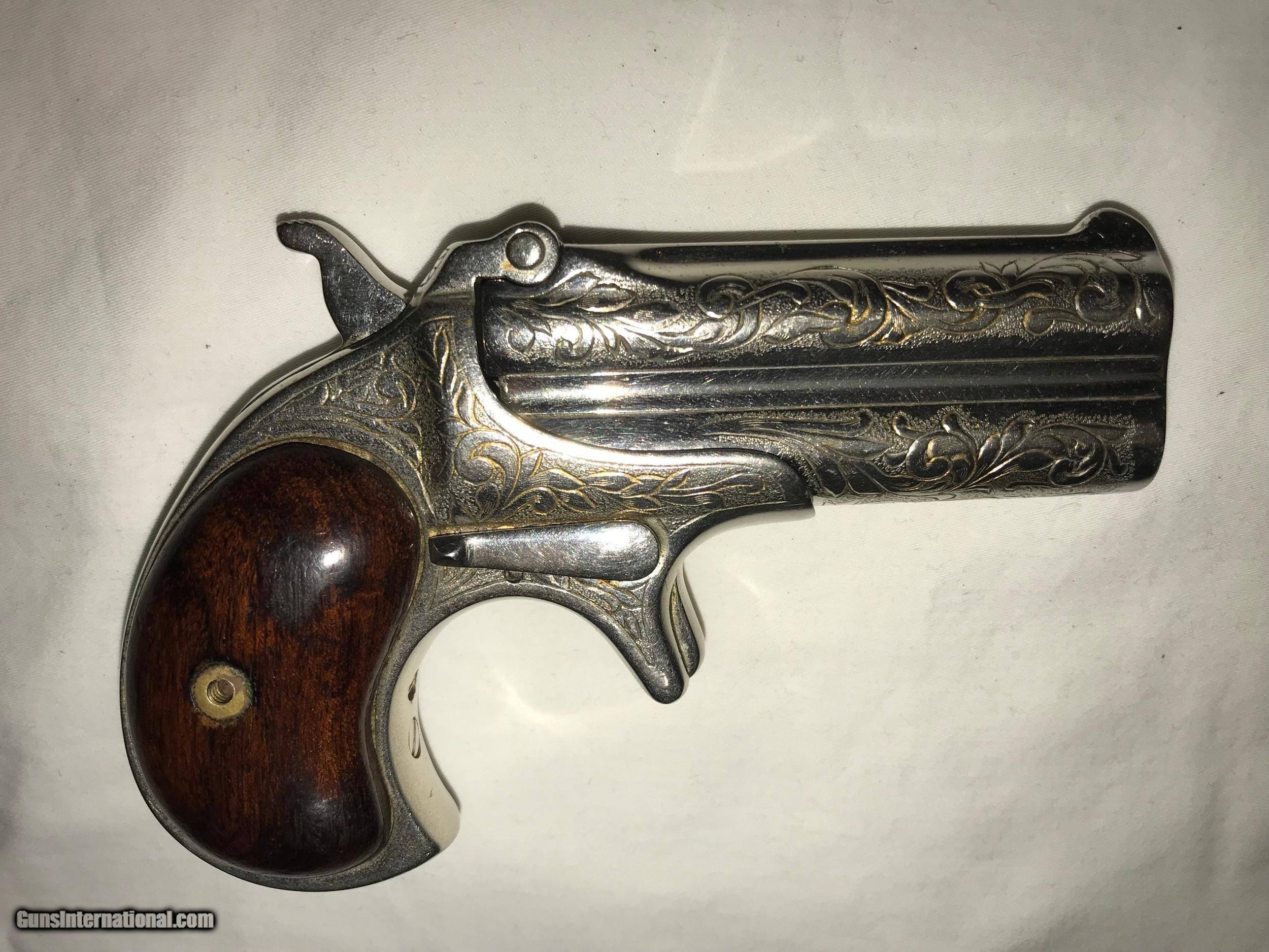 Description: This is an engraved Remington .41 Derringer with wood grips. It is very clean and the bore is in good condition with no pitting. REMINGTON ARMS--UMC CO .ILION. NY, The hinge is good and barrel is not loose. Very good derringer for your collection. SOLD Curio/Relic: Yes Antique: Yes Manufacturer: Remington Model: Derringer Caliber Info: .41 Condition: very good Metal Condition: very good Wood Condition: excellent Barrels: good