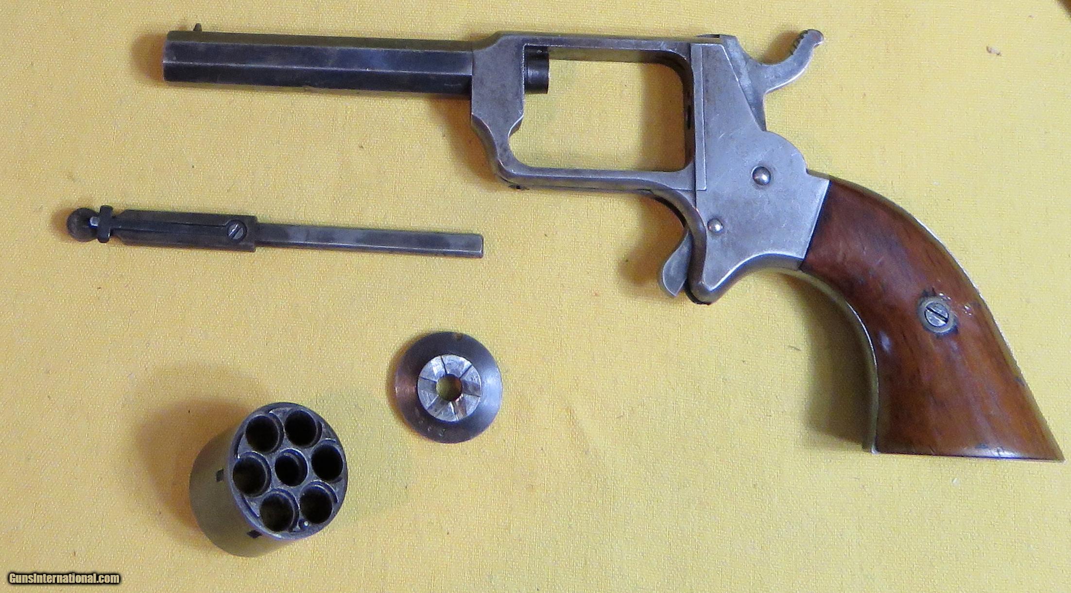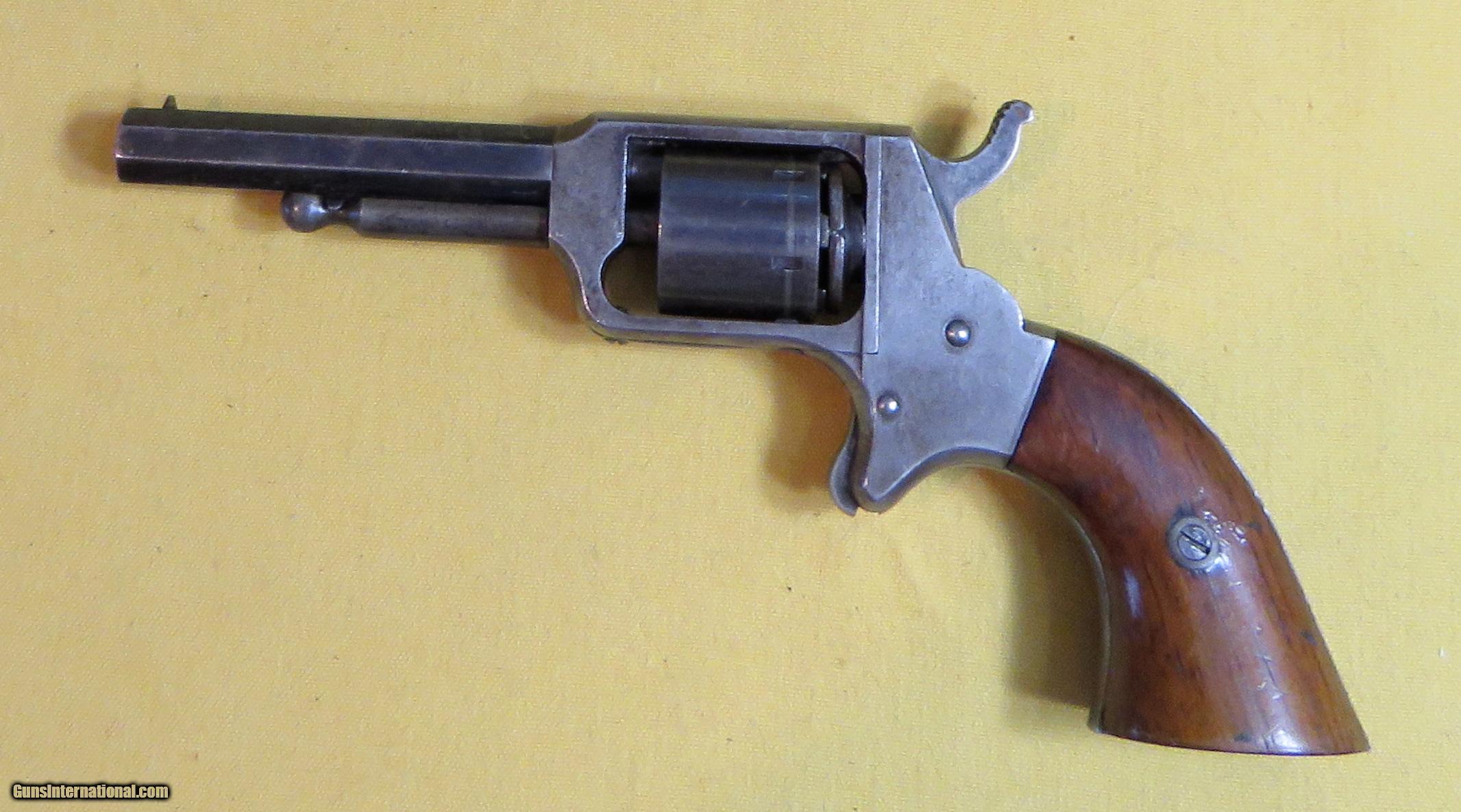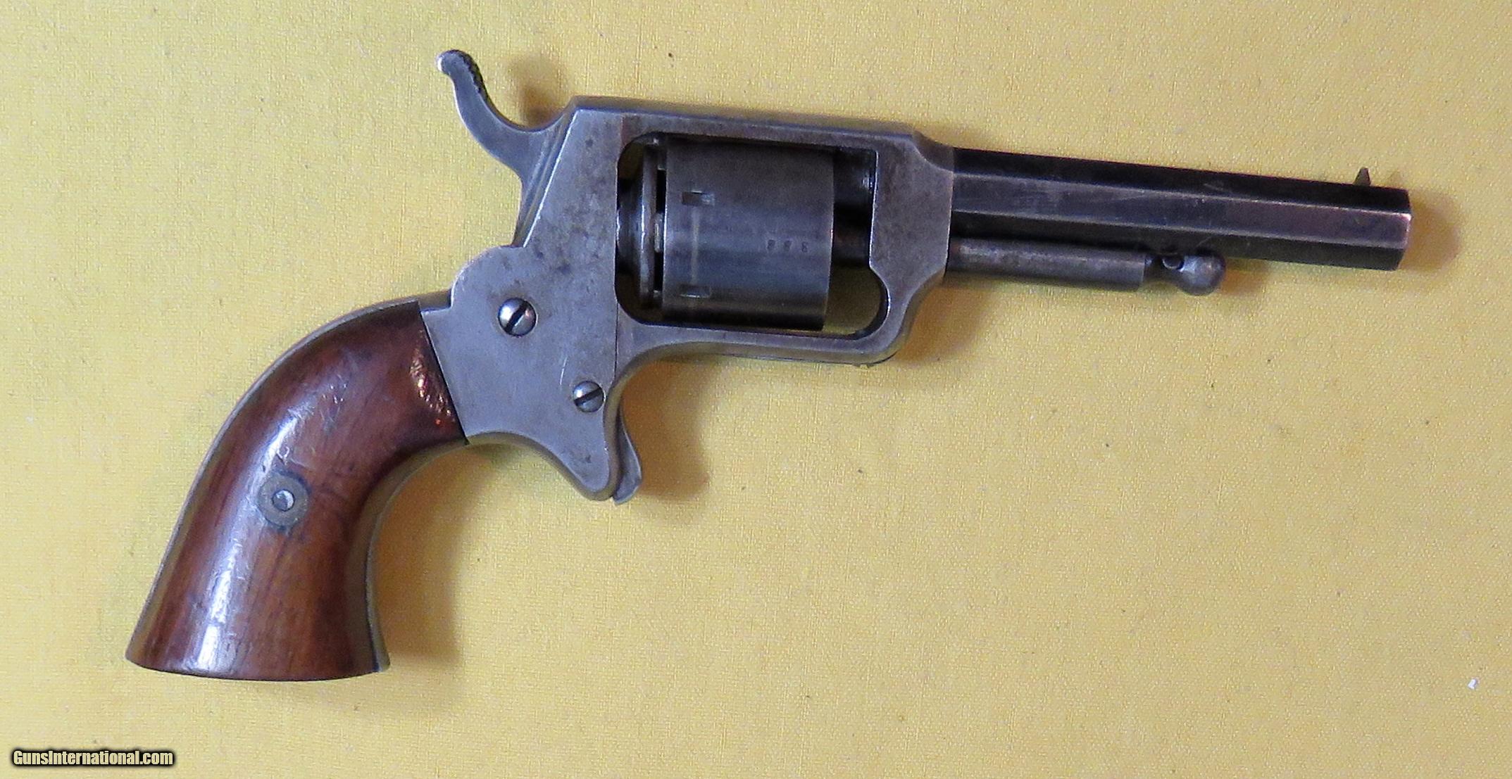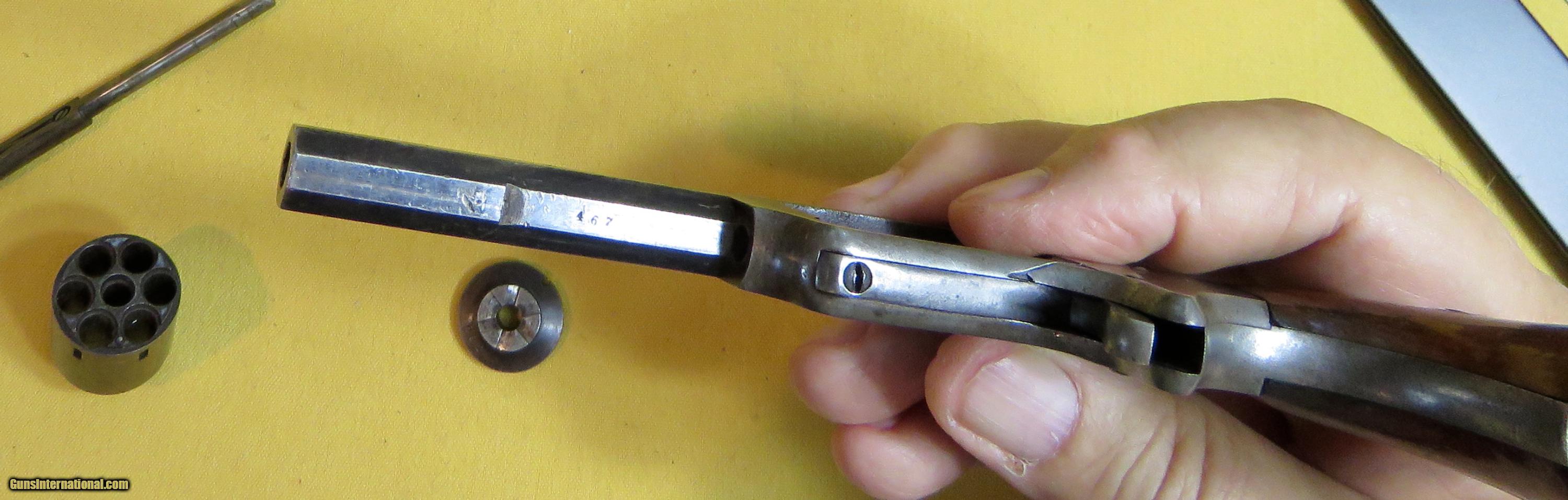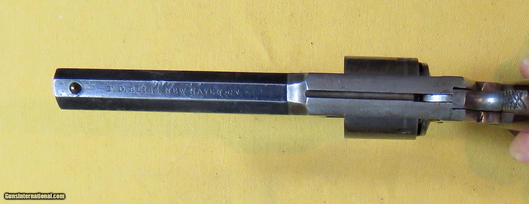Description: F. D. Bliss 25 caliber rimfire revolver. 1863-1864. Successor to the Bliss and Goodyear percussion revolver of the same design. Probably less than 3000 made. Markings are " F. D. BLISS. NEW HAVEN-CT" on the barrel top flat, and are very sharp. The frame is a silvery gray color. The barrel has about 80% original bright blue. The cylinder has about 60% original blue, thinning. The cylinder pin is complete with the original locking spring, and has what appears to be a silvery remains of case coloring. The serial number is 467, and the cylinder assembly number (for the cylinder and the back plate) is #388. There is a penciled number on one of the grips which is unreadable. The bore is excellent. Mechanically it is fine. The grips have lots of varnish, and show a little shrinking. This is overall a very nice example of this somewhat scarce gun. Most that I see have little if any original blue, and are worn rather badly. SOLD Antique: Yes Manufacturer: F.D. Bliss Serial Number: 467 Caliber Info: 25 |