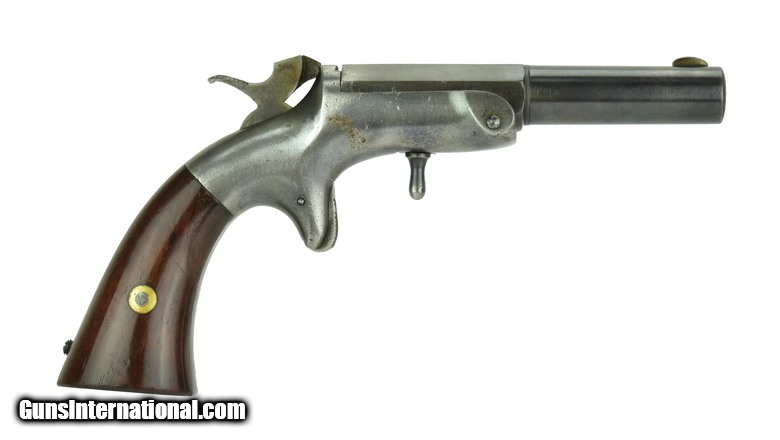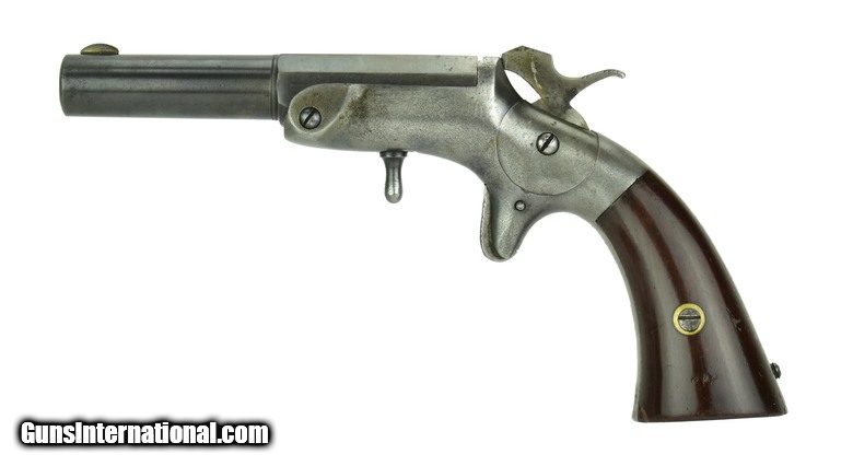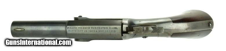 Description: Frank Wesson Medium Frame .32 Rimfire Caliber Pistol. Single shot pistol. Circa 1860. Barrel length 3 ½”. Part round, part octagon barrel. Barrel address and patent numbers are perfect. Action works perfectly and has safety notch and full cock notch. Bore is very good. Barrel has 98% blue. Grips are excellent with 100% original factory varnish. Grips are rosewood. Serial number 665.