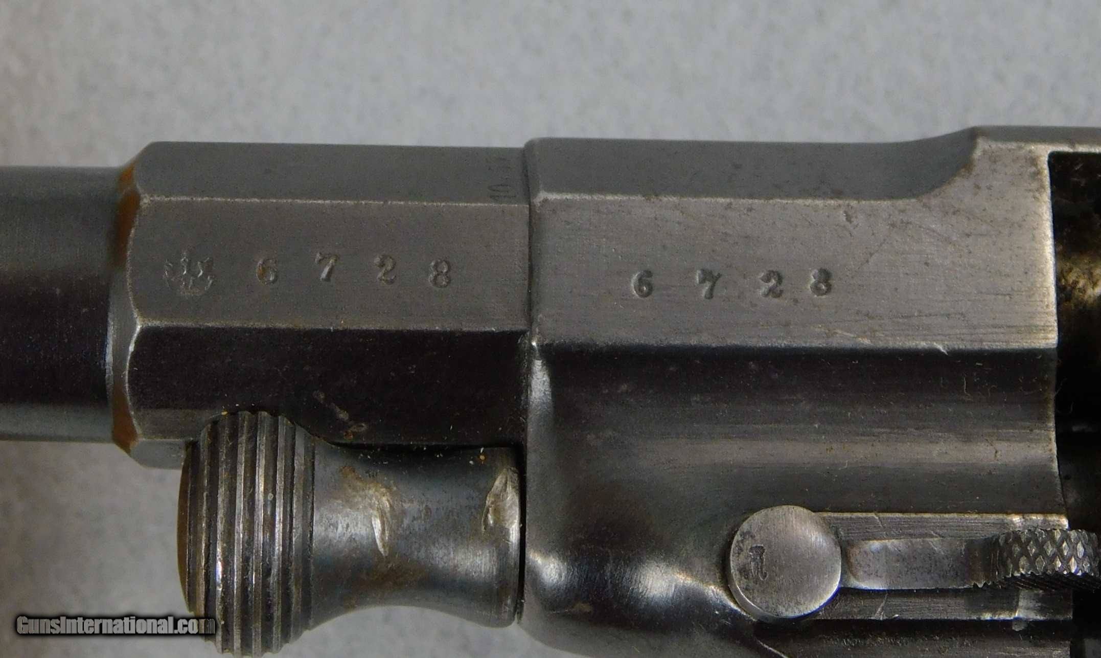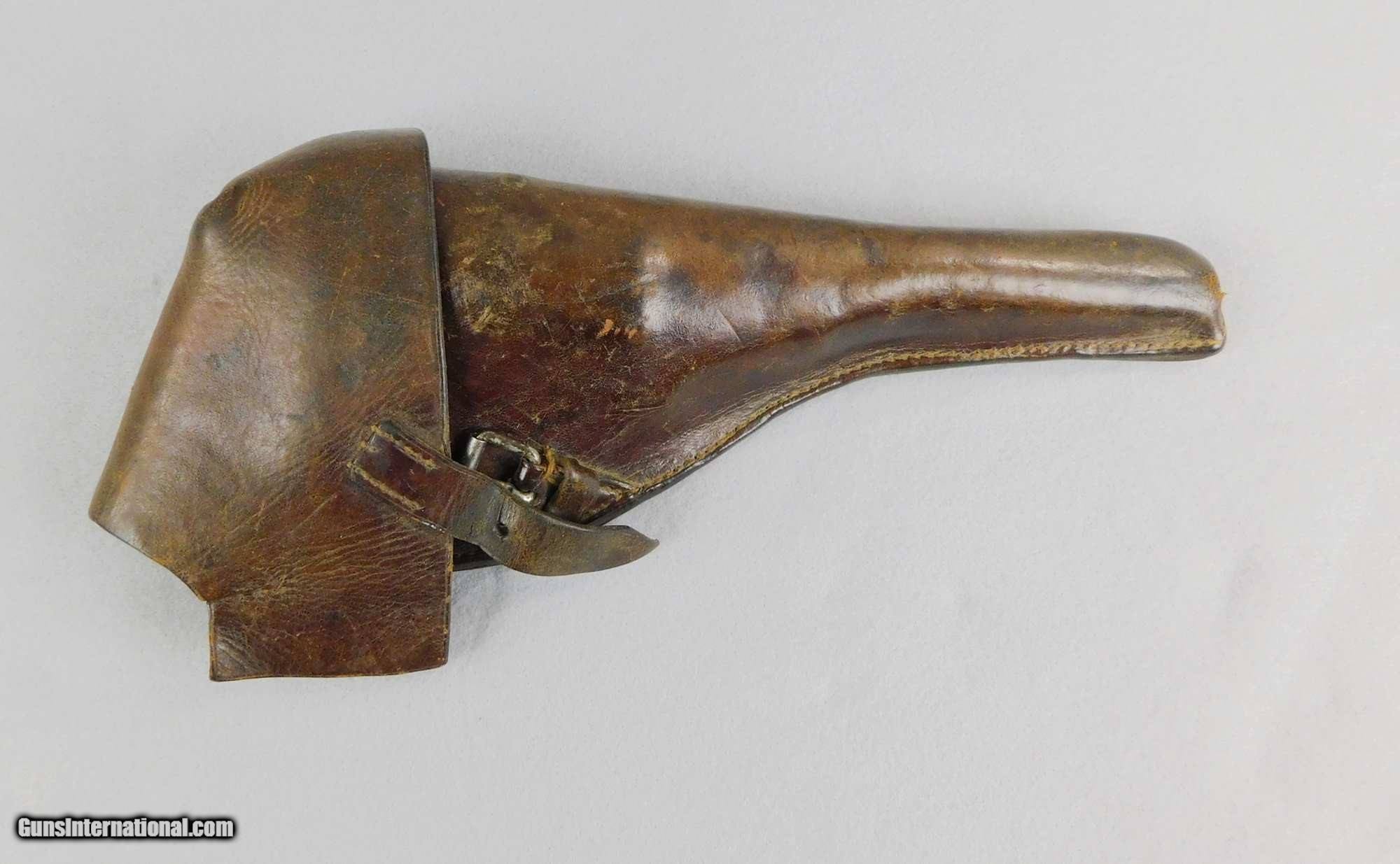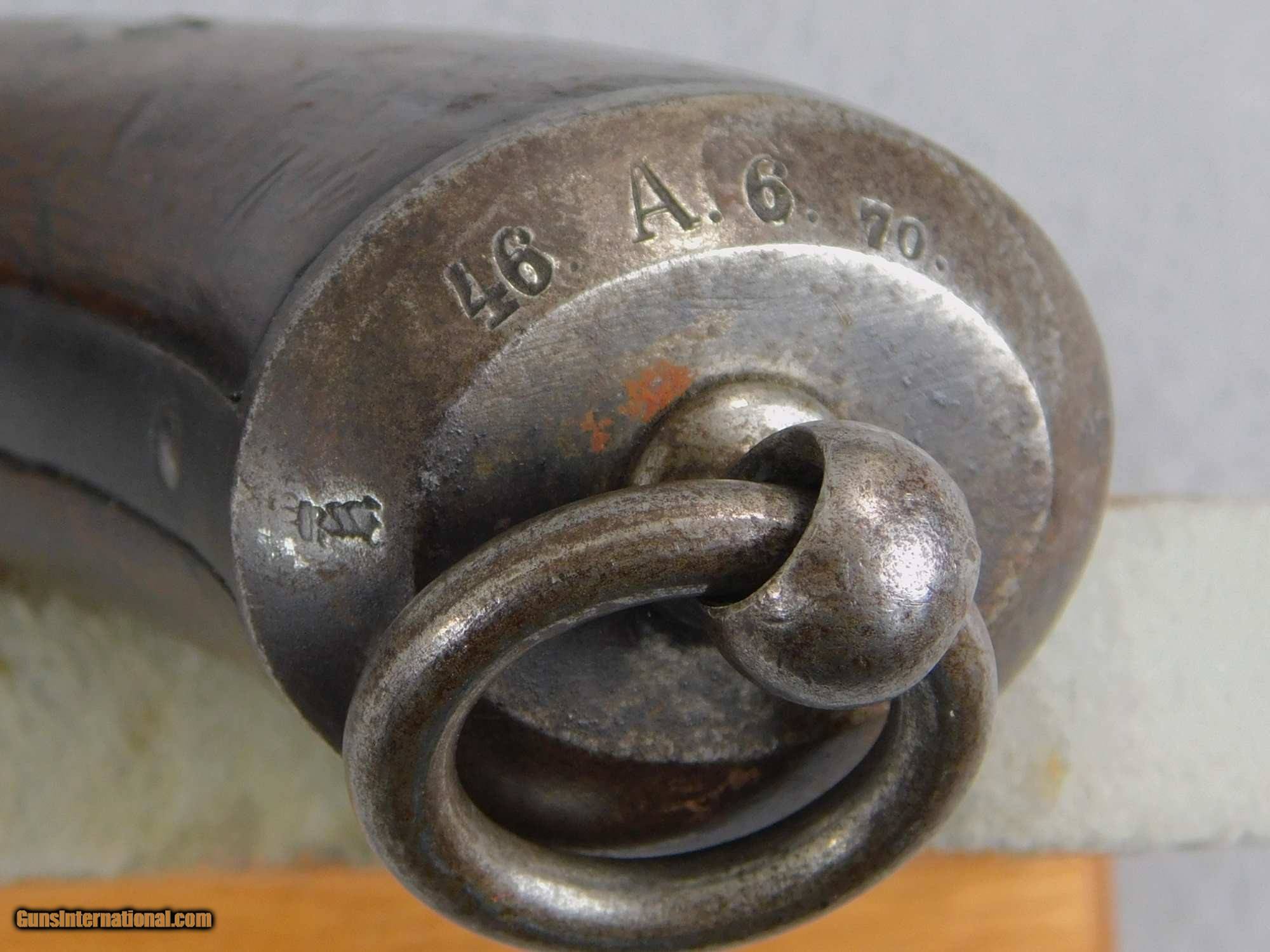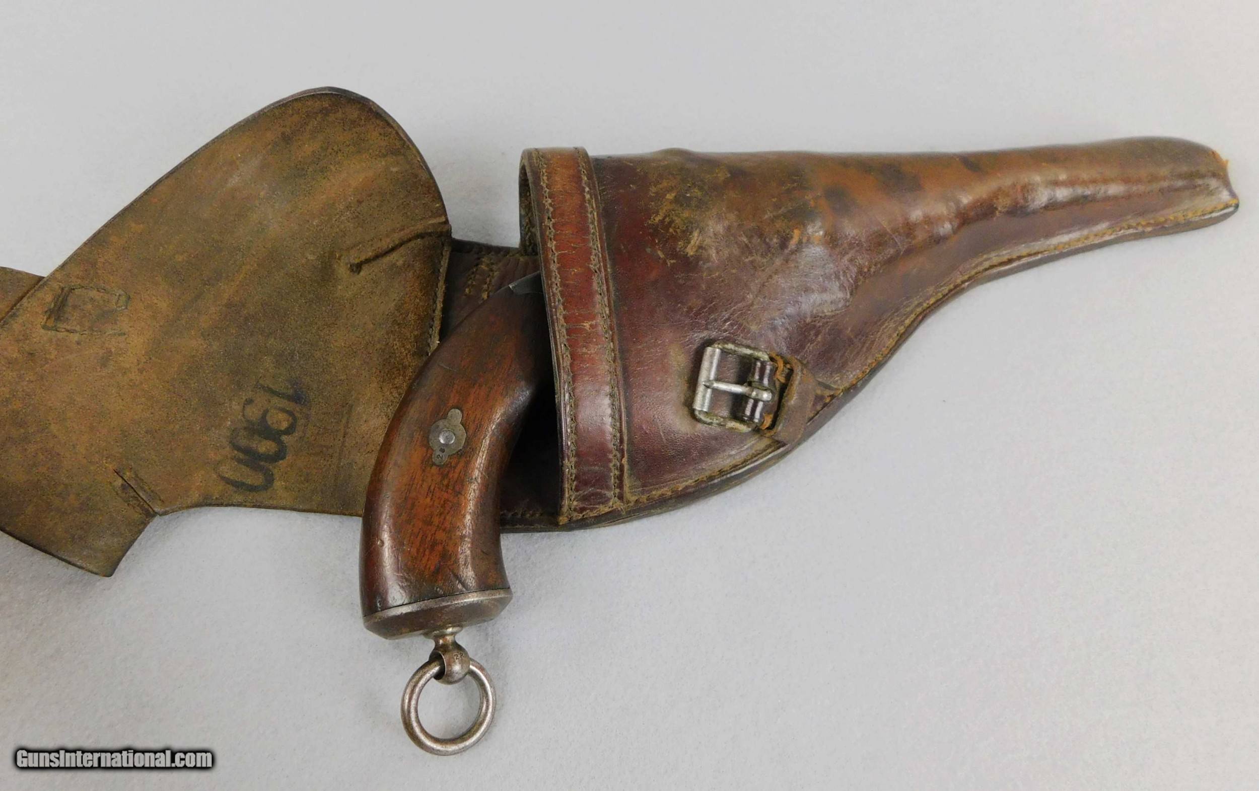 Description: This is an original German Model 1879 Reichsrevolver service pistol in 10.55 mm and is Regimentally marked on the butt. It is A.6. 70.46. and is all matching numbers and is serial number 6728. The mechanical function is very good crisp and tight. The bore is very good bright and shiny with strong rifling. The holster is maker marked on the back L Rigen/ Karlsruhe and dated 1900. Leather did not hold up as well as the revolvers so replacements were on hand at the arsenals. This service revolver retains 80% of the original brown color. My understanding is that reloads can be made with 44 S&W Russian brass and dies are available. I would consider trades for pre 1899 ANTIQUE PISTOLS and rifles on any of my items.. WHAT DO YOU HAVE TO TRADE? Ask about our 30-90 day lay-away program. We accept Bank Check, Money order, Personal checks or wire transfer. SOLD Antique: Yes Model: Model 1879 Reichsrevolver Serial Number: 6728 |