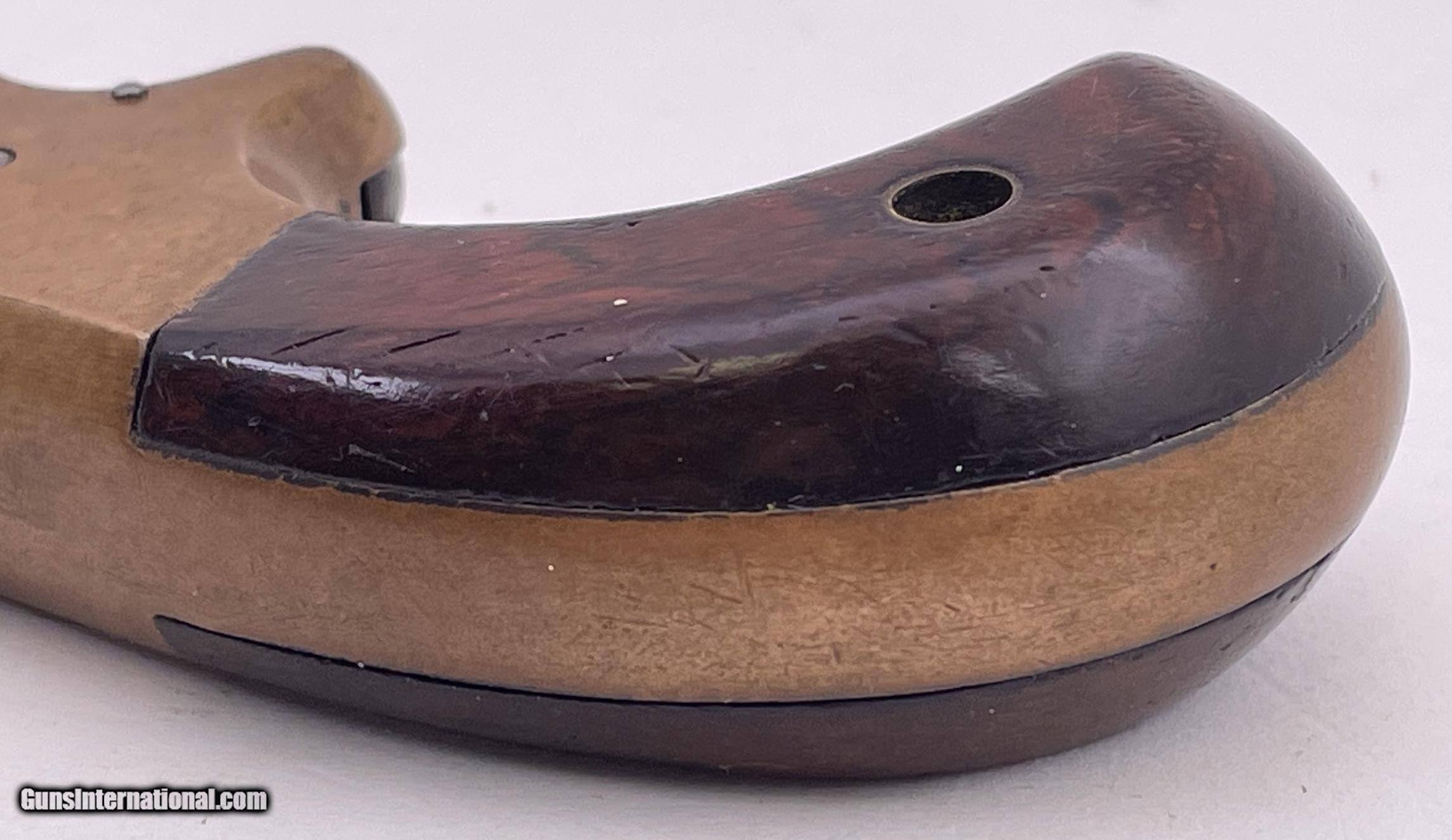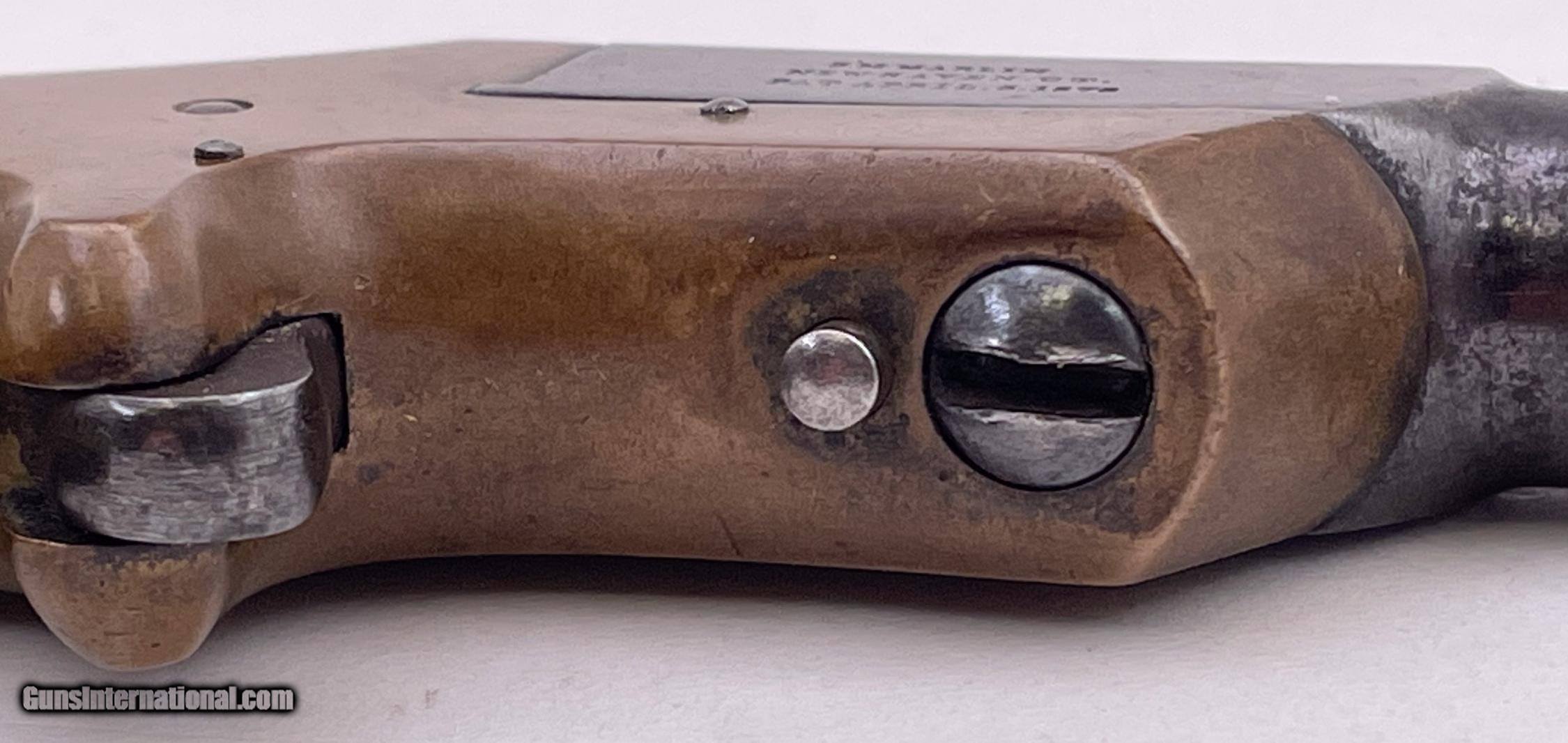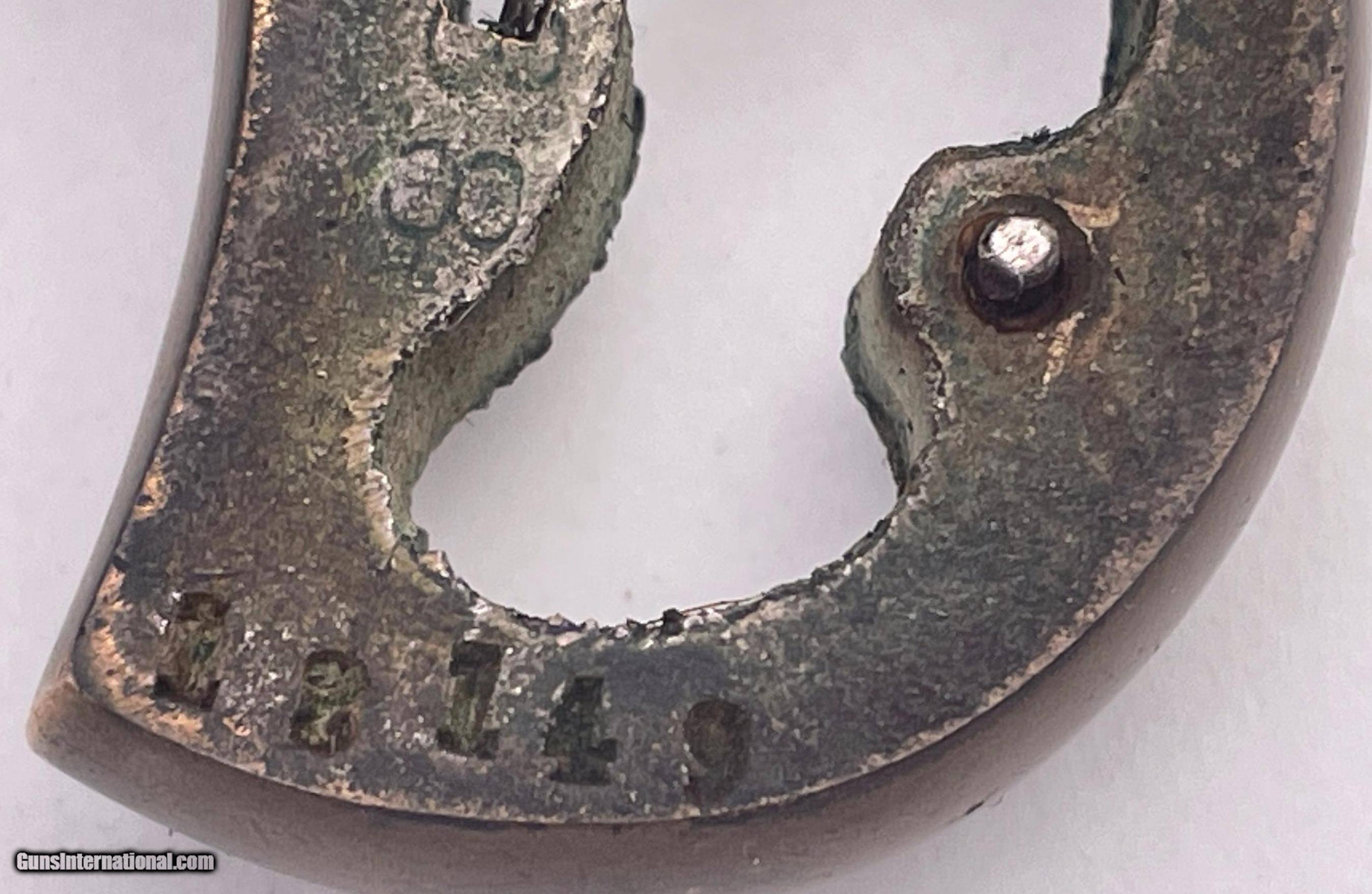 Description: Bore shows some roughness. The brass frame is a good dark untouched age patina and the iron parts have strong traces of original blue. The action is crisp. See photos for condition. SOLD Antique: Yes Handgun Caliber: .38 Rimfire Manufacturer: Marlin Model: Victor Serial Number: 13149 Barrel Length: 2.75 |