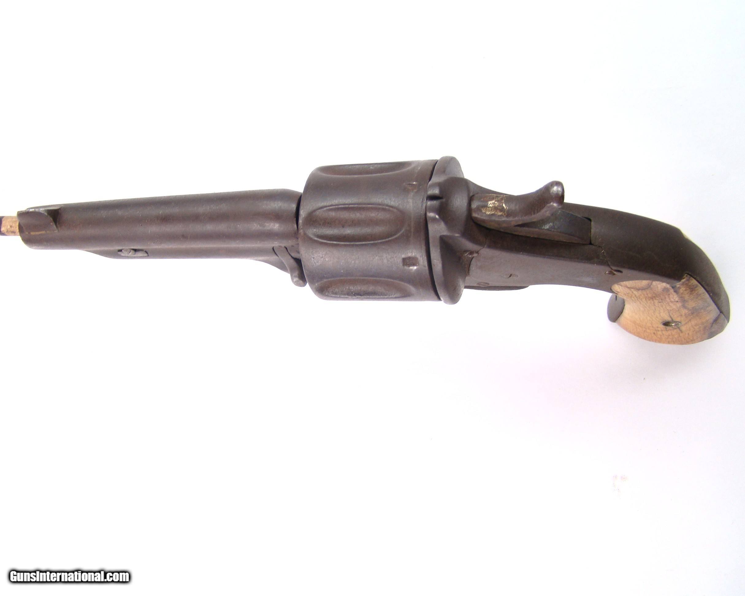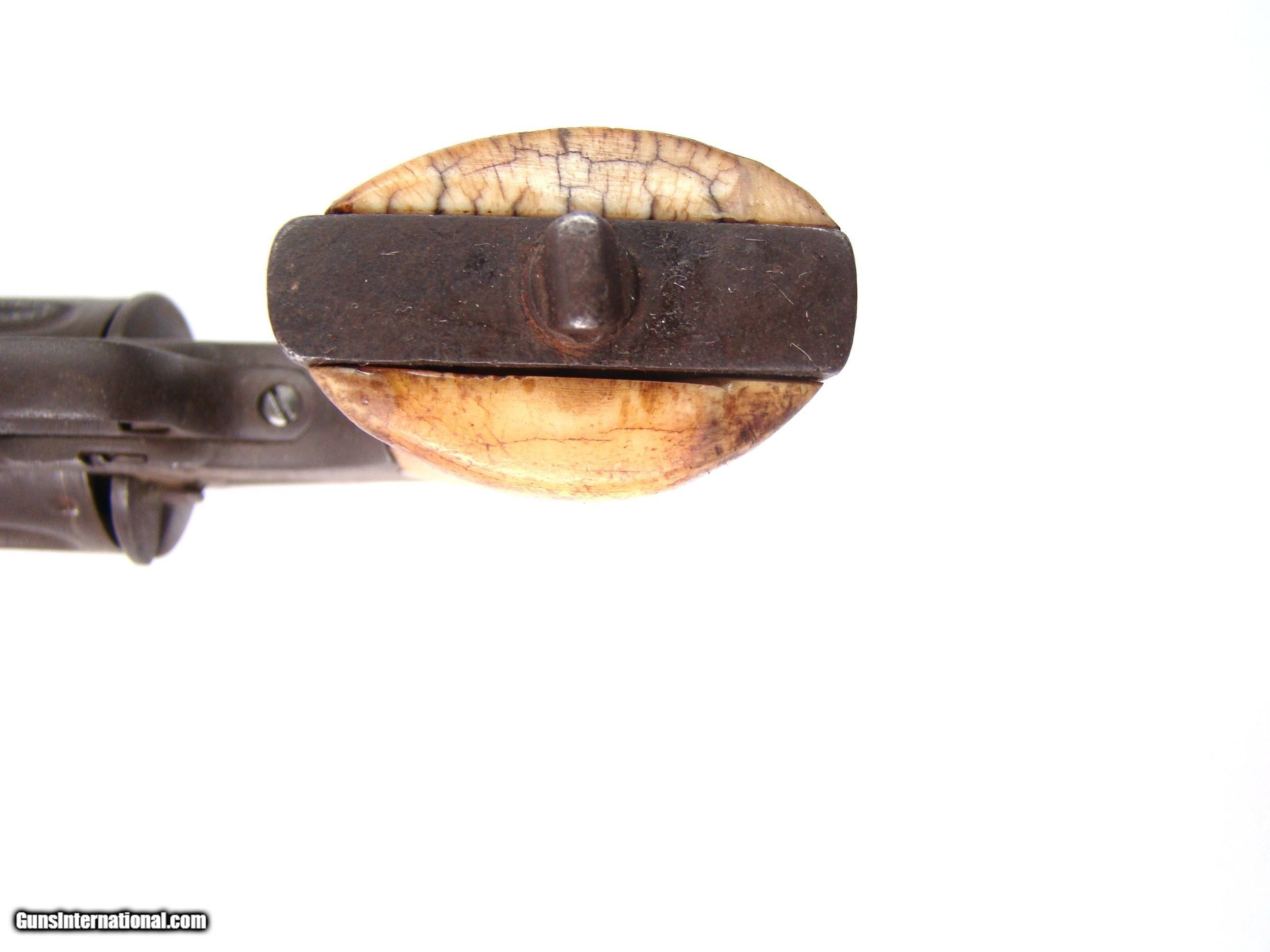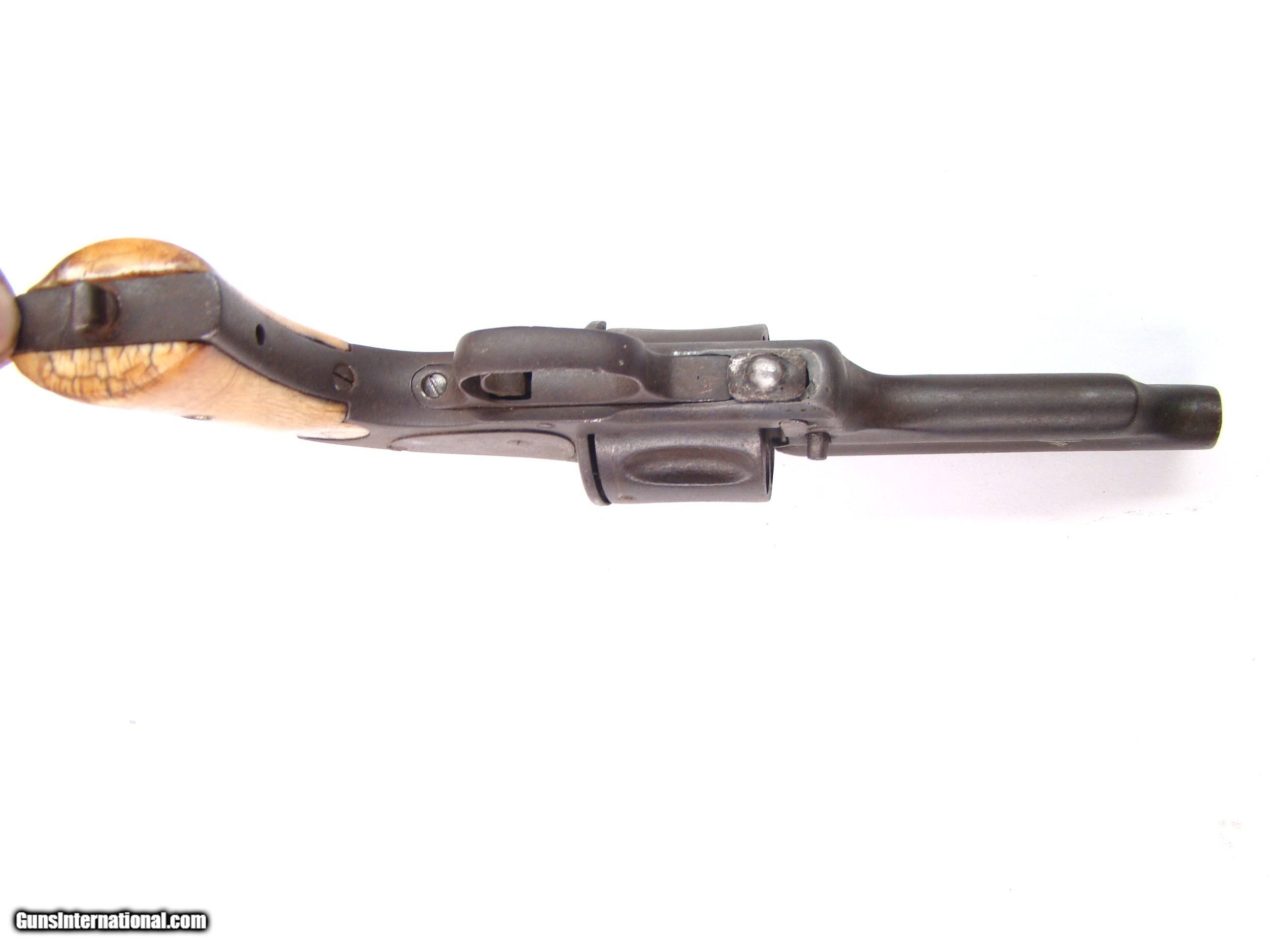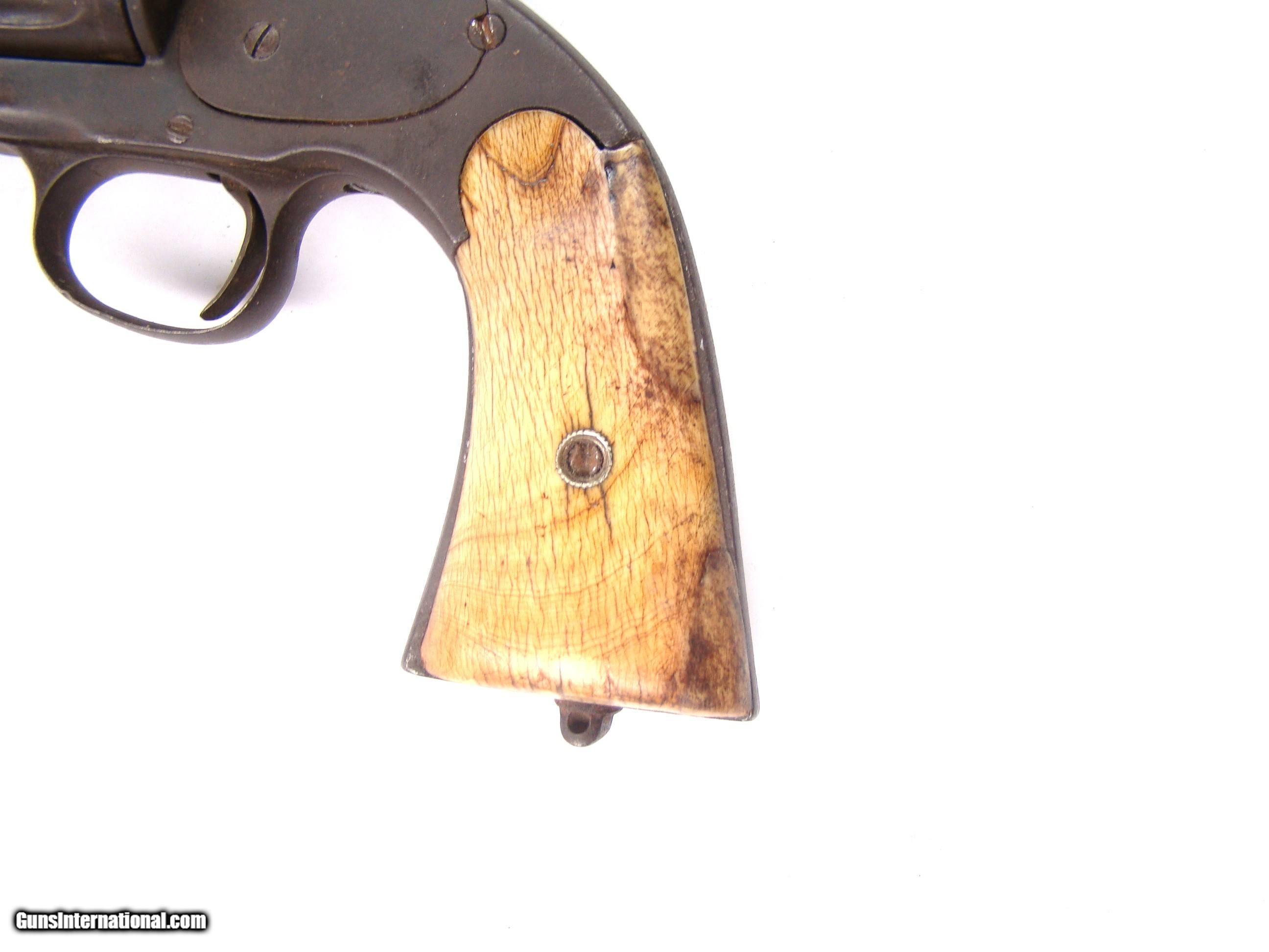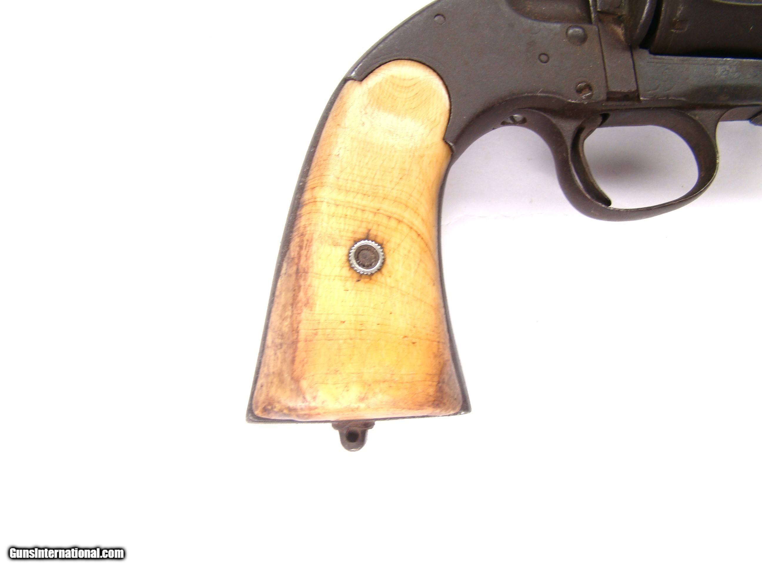 Description: Merwin Hulbert Single Action Revolver Early Open top 44 Rus Cal, Bore VG, Mech VG, Original Old Ivory grips with a couple chip repairs VG, Has a 4 ¼” barrel , Numbered in several places #506 .Has lanyard ring on the butt. Has traces of original engraving in protected areas. Has the original loading gate. Metal overall has a dark brown patina finish with traces of fine pitting. Has seen a lot of use. Probably a Mexican used gun. Antique: Yes Price: $895.00 Contact Seller |