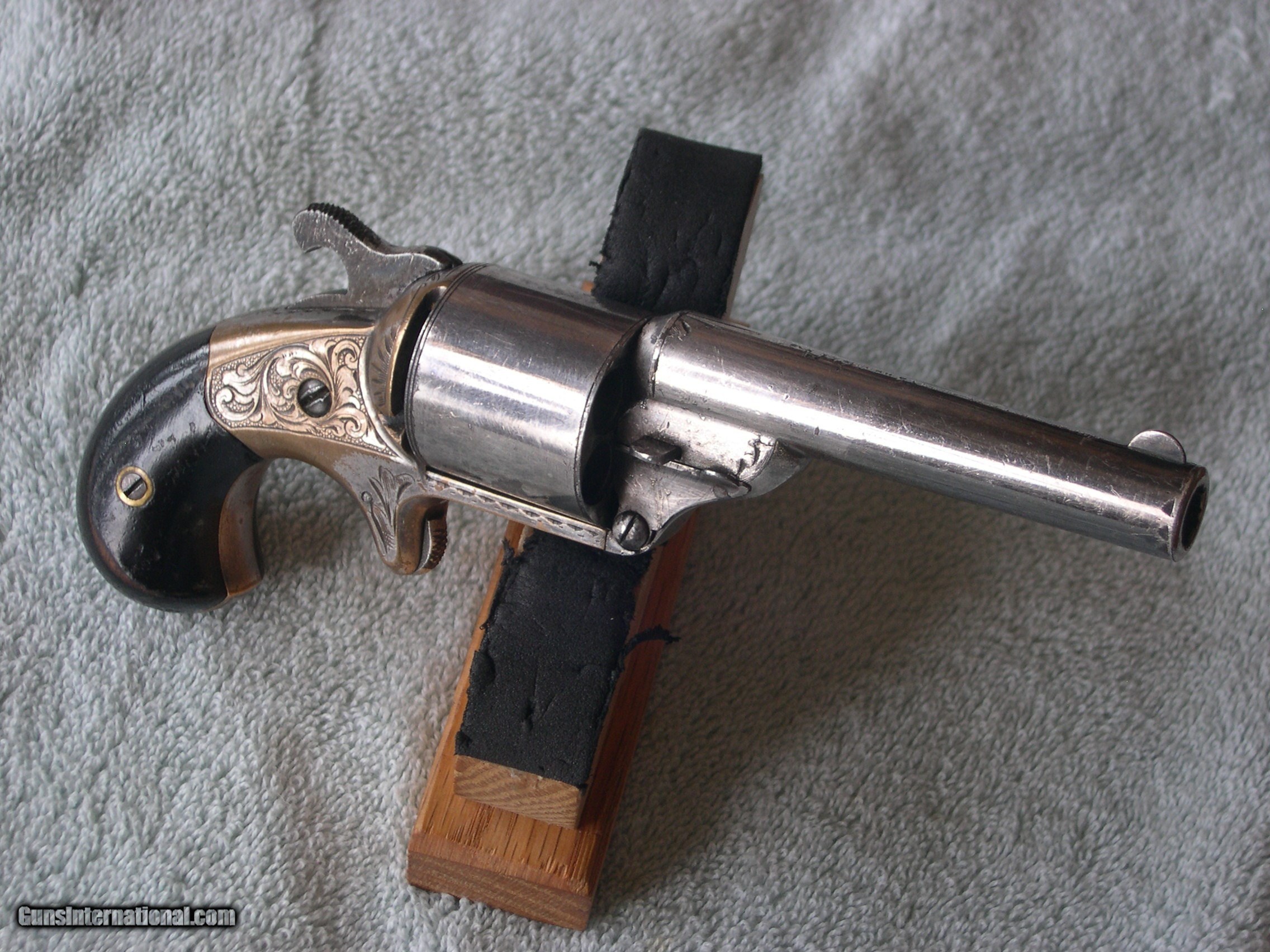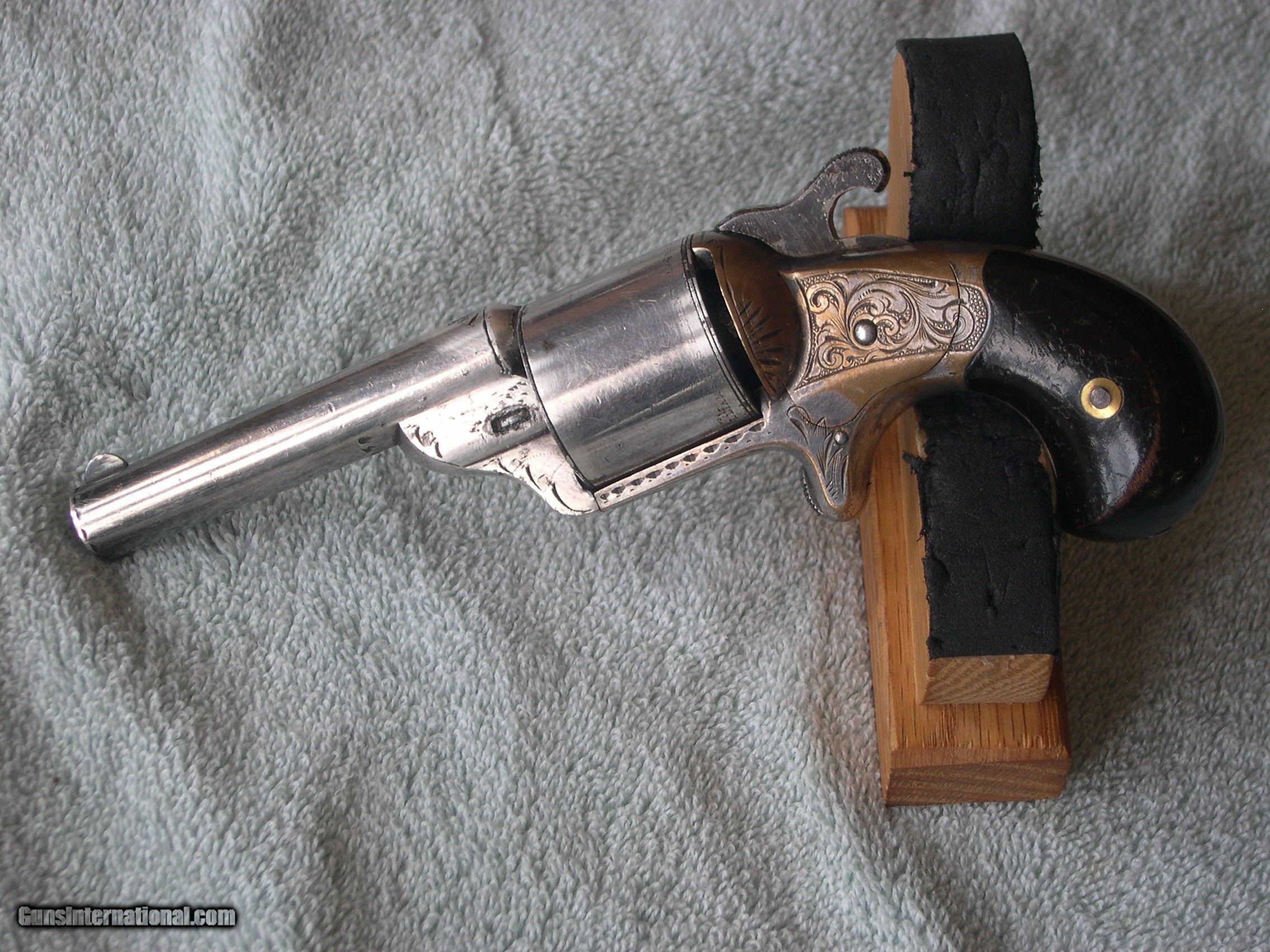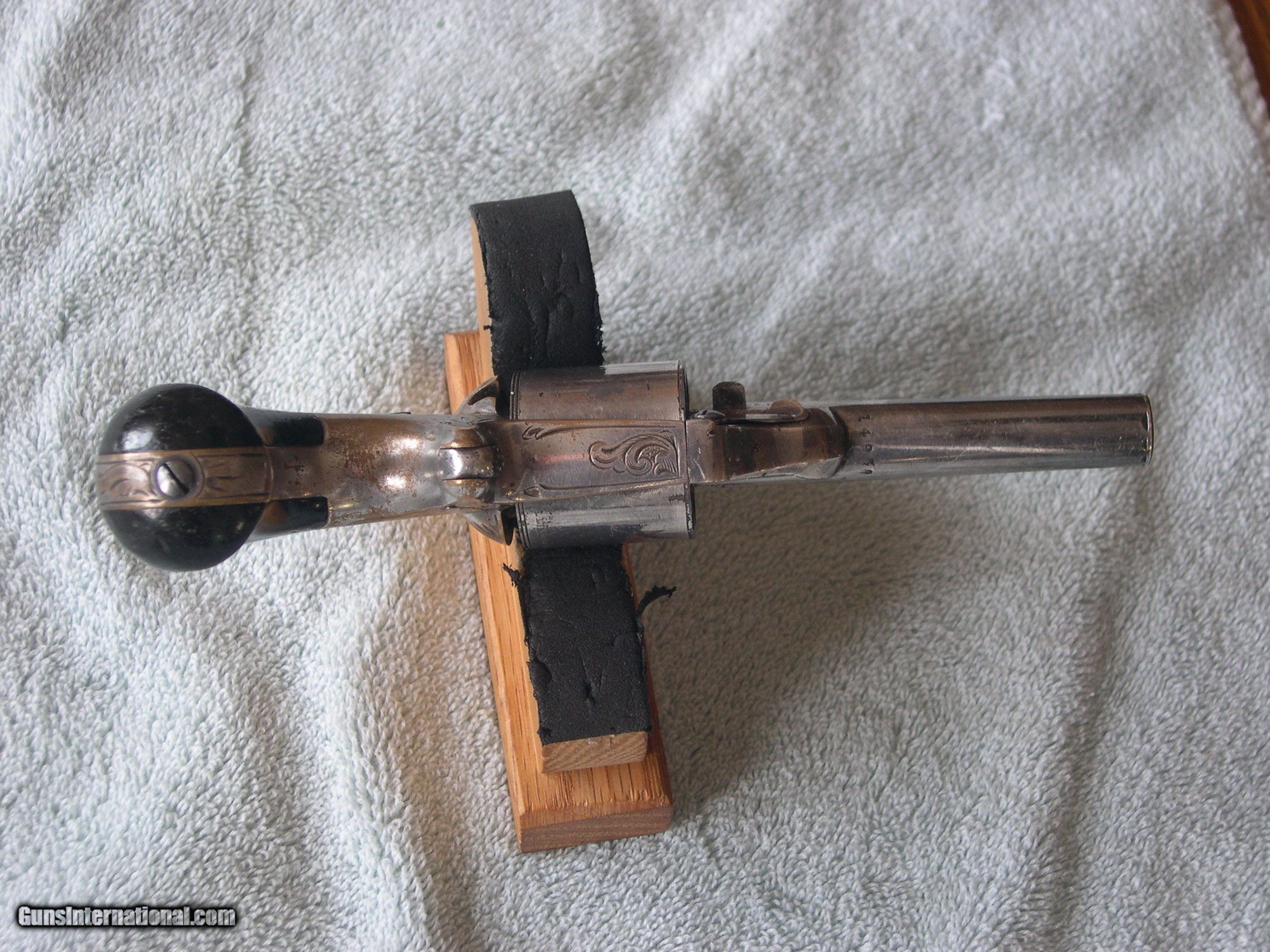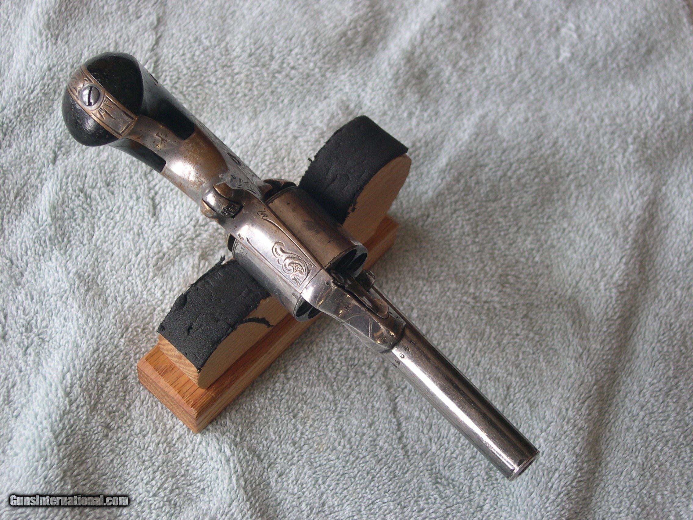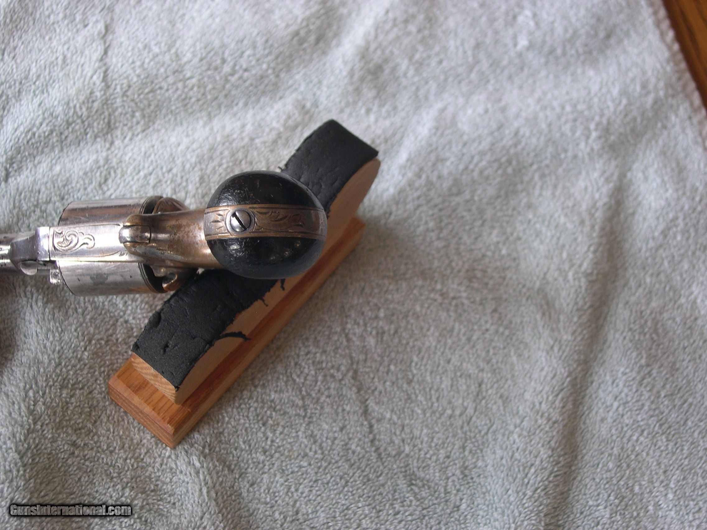 Description: This is in perfect working order, Loads from the front of cylinder, and each cartridge projects a nipple from the rear of cylinder, that fires the gun, a very novel idea, that did not catch fire, in the mid Nineteenth century !! These are silver plated and this one has lot of finish on it, as you can see in pics, a real nice bore also ! 32 caliber and can be shipped without FFL, ANTIQUE !! SOLD |