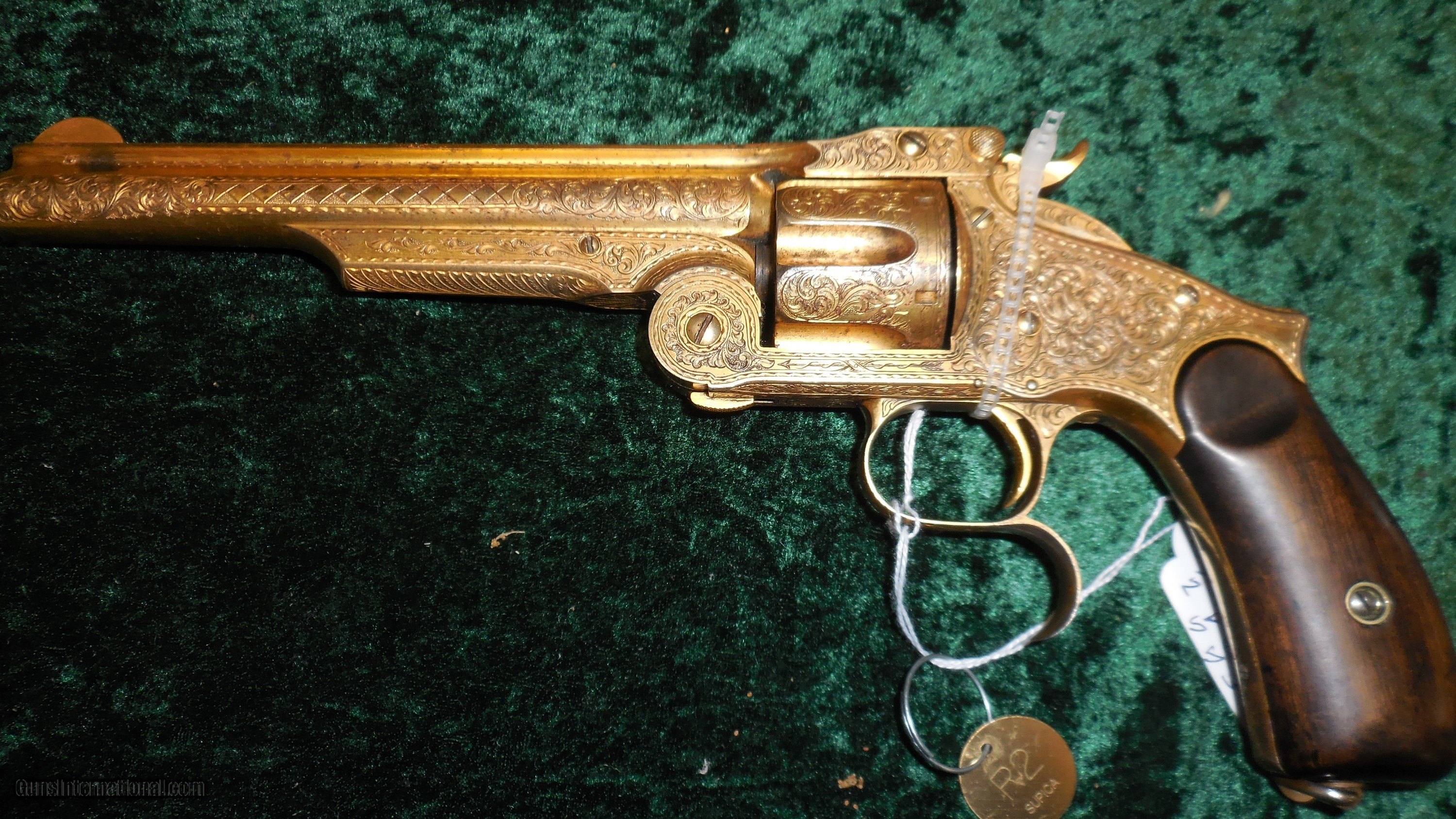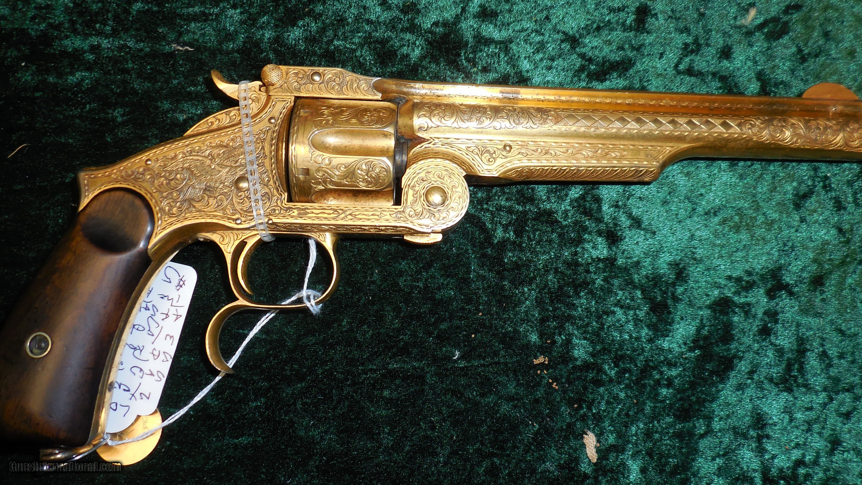 Description: THE BEST DECORATED S&W I EVER HAD!. THIS GUN WAS ENGRAVED BY ONE OF THE BEST ENGAVERS OF AMERICAN FIREARMS IN THE LATE TO MID19TH CENTURY. THE GUN IS ENTIRELY GOLD PLATED & DOCUMENTED TO BELONG TO L.D.NIMSCHKE. THE GUN IS A GREAT 7 in SOLID RIB rUSSIAN IN 44 CAL. THIS GOLD PLATED MASTERPIECE IS EXTENSIVELY ENGRAVED BY NIMSCHKE IN THE NY STYLE SCROLLWORK ON A FINE PUNCH DOT BACKGROUND. THERE ARE WAVY LINE BORDERS, CHECKERBOARD PANELS ON BITH SIDES OF THE BBL, ARROW MOTIFF BELOW THE CYLINDER & A FANTASTIC EAGLE ON THE RIGHT SIDE OF THE FRAME. THESE ARE CHARACTERISTIC OF NIMSCHKE CUT INTO THE STEEL CANVAS OF THE FRAME COVERING MOST ALL OF THE SURFACE.sILIAR PANELS ARE FOUND AMONG NIMSCHKE FIREARM ENGRAVING BOOK P. 21, 37, &60. ON P.60 OF HIS BOOK IS ALMOST AN IDENTICAL FEATURE OF HIS WORK. THE BBL RIB HAS THE ONE LINE S&W ADDRESS & PATENT DATES LEGEND ENDING WITH RUSSIAN MODEL SURROUNDED BY ENGRAVED FLOURISHES & A PINNED BLADE FRONT SIGHT. A LANYARD RING IS MOUNTED ON THE BUTT. THE MATCHING ASSEMBLY 35 IS STAMPED ON THE GRIP FRAME, CYLINDER, BBL, & BBL LATCH. THE RIGHT GRIP PANEL IS NUMBERED TO THE GUN. THE GUN HAS A BETTER THAN 90% PERIOD RETAILER APPLIED GOLD PLATING WITH SOME EDGE WEAR & THINNING ON THE BACKSTRAP. THE LIGHTLY REOILED ARE FINE. MECHANICALLY VG. IF YOU NEED TO OWN ONE GUN THAT WOULD BE THE STAR OF YOUR S&W OR GUN COLLECTION, THIS IS THE ONE TO HAVE. THIS GUN IS FEATURED IN THE GUNS OF THE NRA SPORTING ARMS MUSEUM P 233. ALSO FEATUREDON THE ILLUSTRATED HISTORY OF FIREARMS P. 94. STANDARD CATALOGUE OF THE S&W, 4TH ED. P.94 7 THE PREVIOUS OWNER MR SUPICA IN 2013 NRA SPORTING ARMS MUSEUM.. NOW IN SUMMARY YOU HAVE BEAUTY, CONDITION, DOCUMENTED PROVENANCE, DO YOU NEED ANYMORE? SOLD Antique: Yes Handgun Caliber: .44 S&W Russian Manufacturer: S&W Model: RUSSIAN MODEL Barrel Length: 7 IN Bore: VG Chambers: VG Condition: VG Metal Condition: VG Wood Condition: VG Bore Condition: VG Barrels: VG Action: DA Stock: walnut Finish: GOLD Weight: 6 LB Sights: FIXED Manufacture Date: 1880 Engraving: NIMSCHKE ENGAVING |