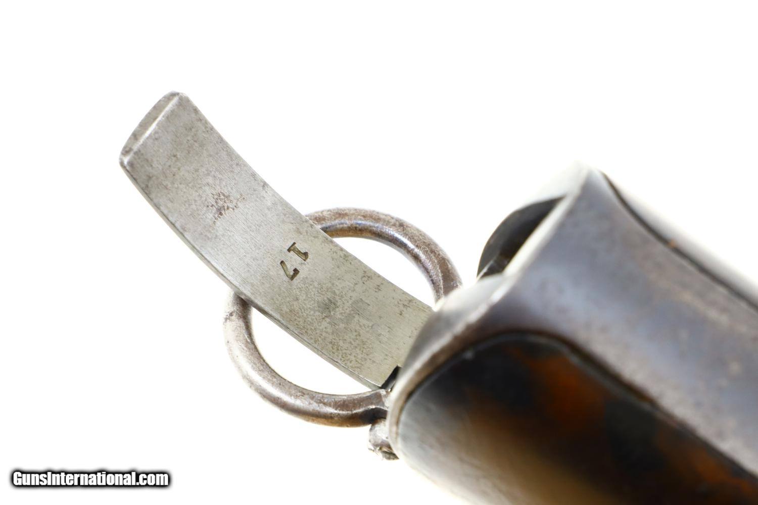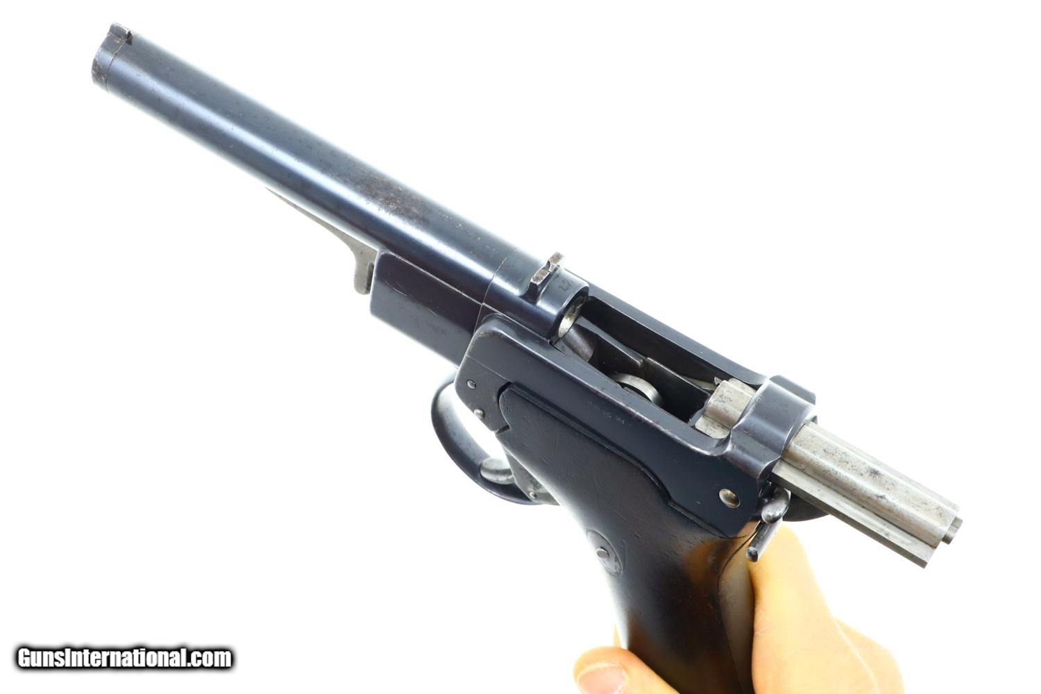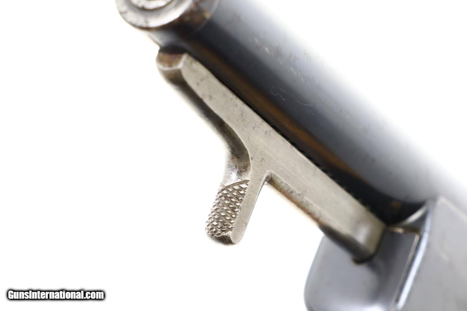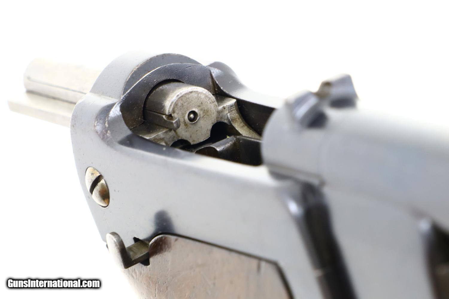 Description: Truly the FIRST semiautomatic pistol, the great great grandfather of all modern handguns, one of only a handful known, this all matching example one of 25 guns accepted by the Austrian Military for testing in 1897 with the acceptance markings on the left side of the frame. A fantastic find by any metric. Identical to the pistol pictured in the classic reference text by Motz and Schuy on pages , this prototype/experimental pistol functions as a single action blowback with an external hammer, has a 5.75” barrel with a fixed front and rear sight. Convenient controls at rear function as a manual hold open/slide release and safety. The cartridge cut off is reflected by the spring loaded button at the upper right receiver. Clip fed through a hinged trap door on butt located next to large rotatable lanyard ring. Smooth grips, each with an oval escutcheon, secured by a single transverse screw. Synopsis: Extraordinarily Rare, First Semiautomatic Pistol, Salvatore, Dormus, 1896, Austrian Military Test, 8mm, 17, O-82 Condition: VG + original rust blue with areas of fading and patchy oxidation as one might expect from a first of kind test pistol that was carefully evaluated by the Austrian Military about 130 years ago. In-the-white bolt and hammer with staining and light etching. Faded case hardened hammer. Oil darkened grips with scattered handling dings but no chips or significant loses. Very bright bore with sharp rifling. Perfect manual mechanics. The ultimate Holy Grail for anyone interested in semiautomatic small arms technology regardless of their focus. ~~Insured shipping fee of $155; most packages shipped using FedEx 2nd Day.~~ SOLD Antique: Yes Manufacturer: OWG Serial Number: 17 Caliber Info: 8mm |
