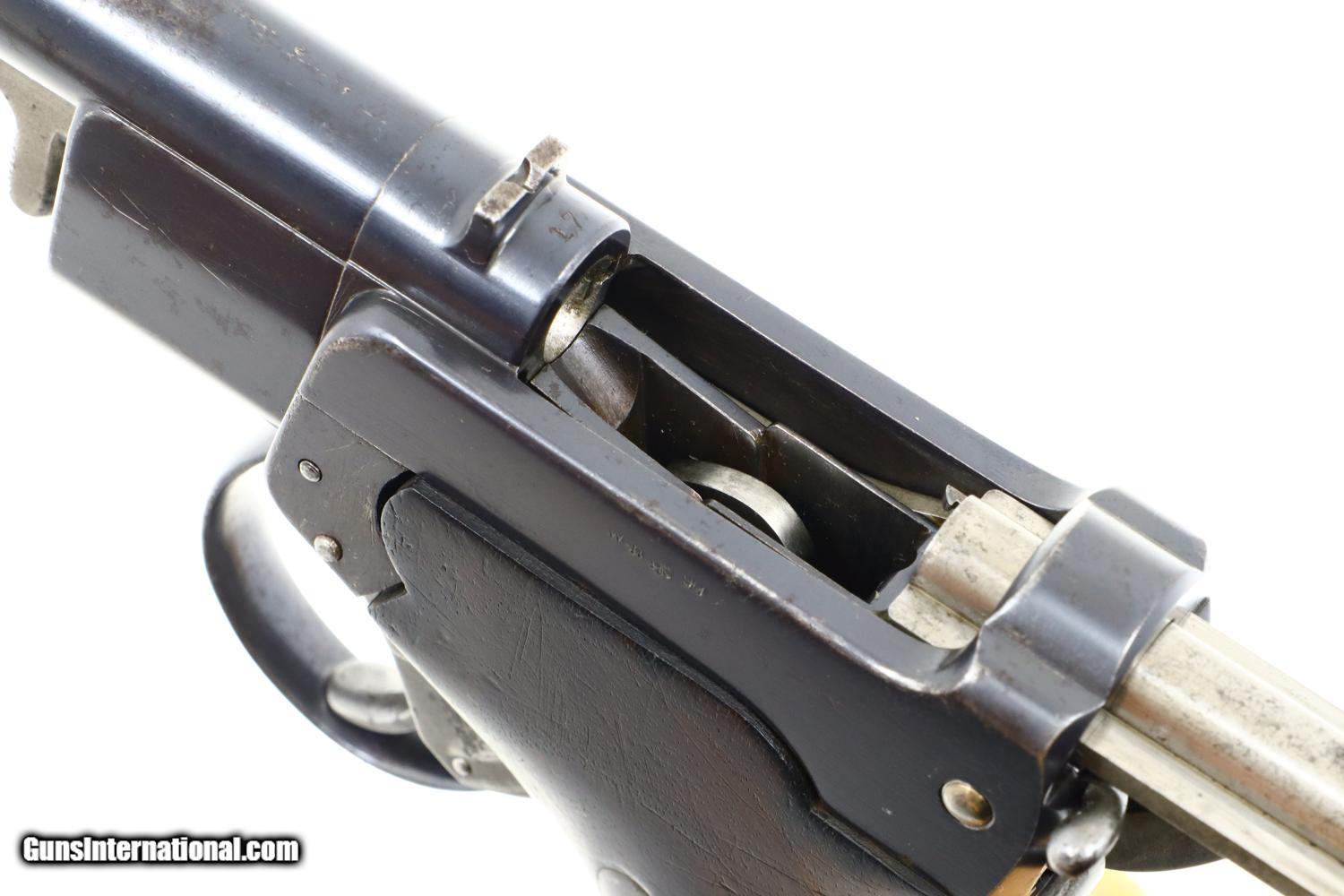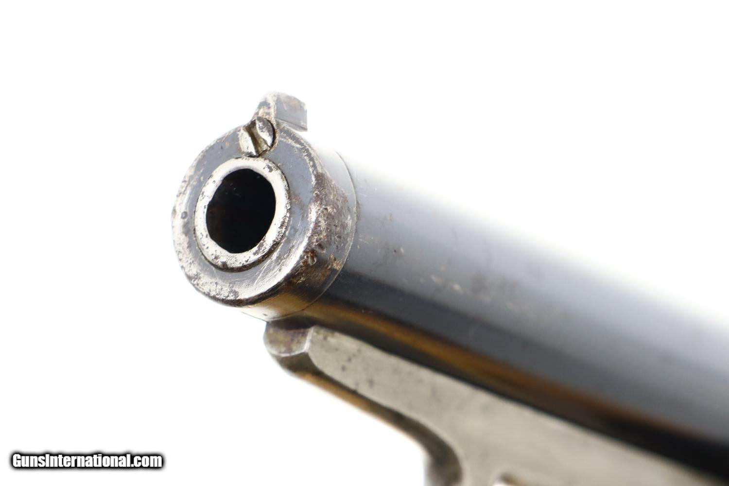 Description: Description: Truly the FIRST semiautomatic pistol, the great great grandfather of all modern handguns, one of only a handful known, this all matching example one of 25 guns accepted by the Austrian Military for testing in 1897 with the acceptance markings on the left side of the frame. A fantastic find by any metric. Identical to the pistol pictured in the classic reference text by Motz and Schuy on pages , this prototype/experimental pistol functions as a single action blowback with an external hammer, has a 5.75” barrel with a fixed front and rear sight. Convenient controls at rear function as a manual hold open/slide release and safety. The cartridge cut off is reflected by the spring loaded button at the upper right receiver. Clip fed through a hinged trap door on butt located next to large rotatable lanyard ring. Smooth grips, each with an oval escutcheon, secured by a single transverse screw. Synopsis: Extraordinarily Rare, First Semiautomatic Pistol, Salvatore, Dormus, 1896, Austrian Military Test, 8mm, 17, O-82 Condition: VG + original rust blue with areas of fading and patchy oxidation as one might expect from a first of kind test pistol that was carefully evaluated by the Austrian Military about 130 years ago. In-the-white bolt and hammer with staining and light etching. Faded case hardened hammer. Oil darkened grips with scattered handling dings but no chips or significant loses. Very bright bore with sharp rifling. Perfect manual mechanics. The ultimate Holy Grail for anyone interested in semiautomatic small arms technology regardless of their focus. SOLD Manufacturer: OWG Serial Number: 17 Caliber Info: 8mm |