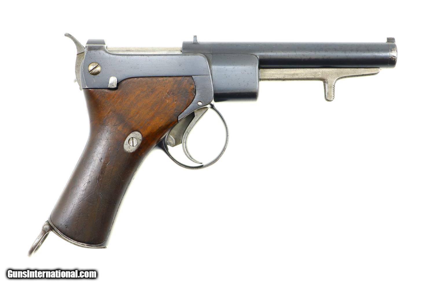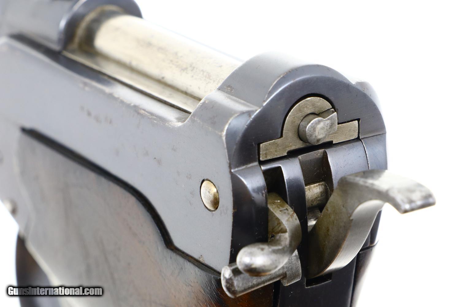 Truly the FIRST semiautomatic pistol, the great great grandfather of all modern handguns, one of only a handful known, this all matching example one of 25 guns accepted by the Austrian Military for testing in 1897 with the acceptance markings on the left side of the frame. A fantastic find by any metric. Identical to the pistol pictured in the classic reference text by Motz and Schuy on pages , this prototype/experimental pistol functions as a single action blowback with an external hammer, has a 5.75” barrel with a fixed front and rear sight. Convenient controls at rear function as a manual hold open/slide release and safety. The cartridge cut off is reflected by the spring loaded button at the upper right receiver. Clip fed through a hinged trap door on butt located next to large rotatable lanyard ring. Smooth grips, each with an oval escutcheon, secured by a single transverse screw.