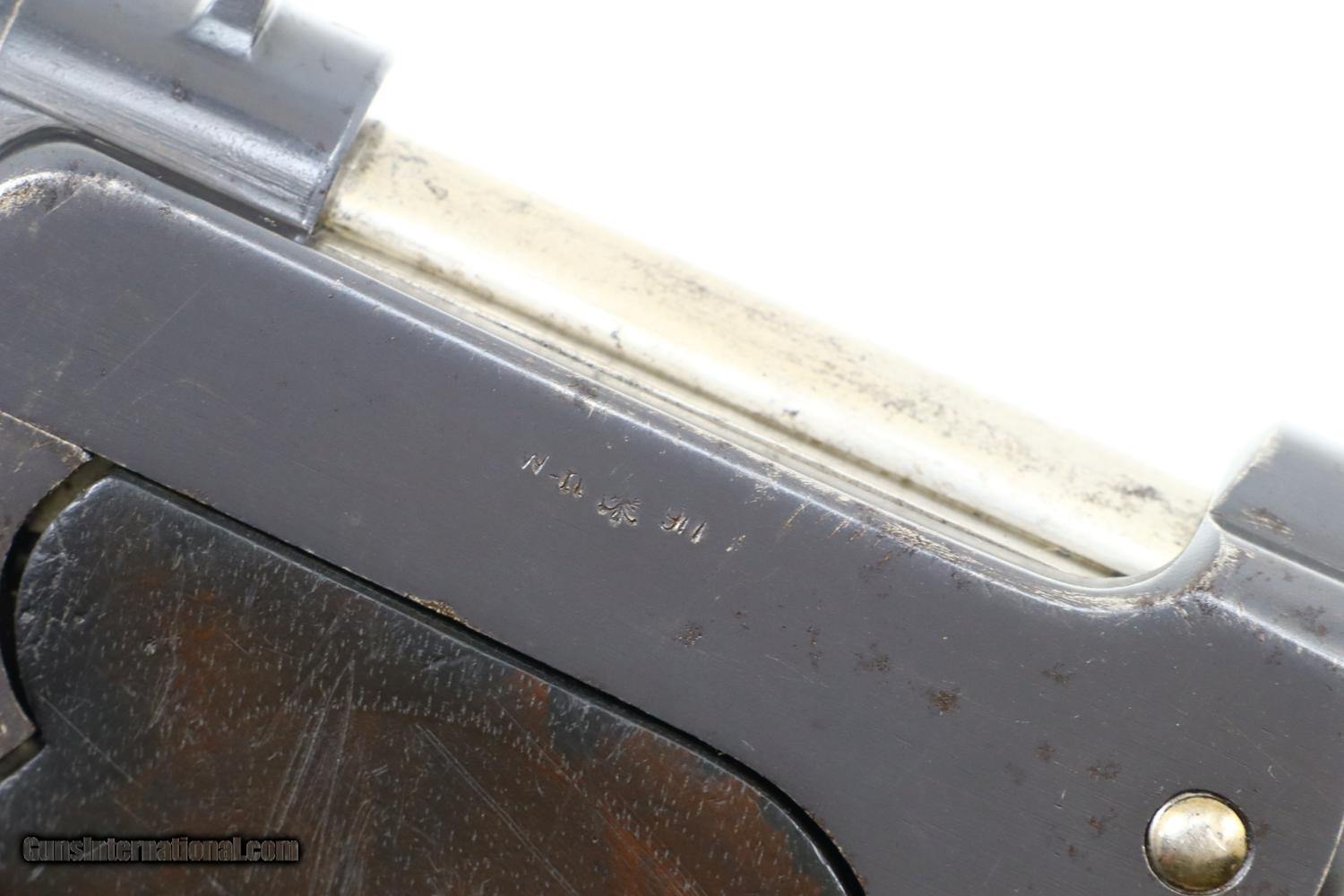 VG + original rust blue with areas of fading and patchy oxidation as one might expect from a first of kind test pistol that was carefully evaluated by the Austrian Military about 130 years ago. In-the-white bolt and hammer with staining and light etching. Faded case hardened hammer. Oil darkened grips with scattered handling dings but no chips or significant loses. Very bright bore with sharp rifling. Perfect manual mechanics. The ultimate Holy Grail for anyone interested in semiautomatic small arms technology regardless of their focus.