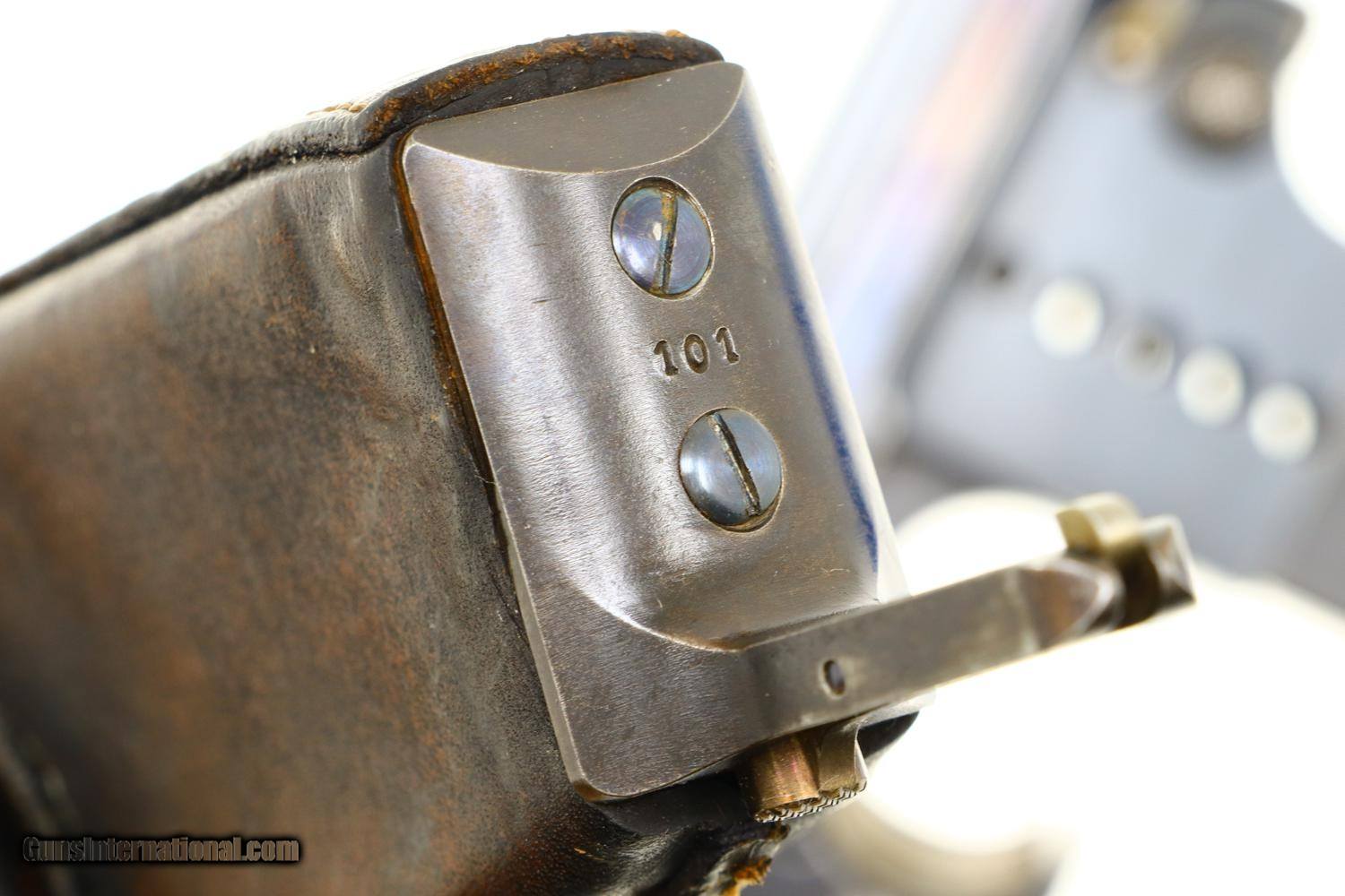 Description: The Bergmann 1897 No. 5 pistol stands as a testament to the innovative firearm design of its era. Crafted by the prolific German engineer Louis Schmeisser, this semi-automatic pistol introduced remarkable advancements for its time. Chambered in 7.8mm Bergmann, it offered reliable firepower while its locked breech action ensured smooth cycling and proper function of the high velocity rounds. Another distinctive feature was its detachable box magazine, a pioneering concept that allowed for rapid reloading—a significant departure from the typical revolvers of that era and Bergmann's earlier models. The Bergmann No. 5 boasted a sleek, ergonomic design with finely detailed craftsmanship, showcasing the blend of functionality and aesthetics. The Bergmann 1897 No. 5 pistol not only played a role in the evolution of firearm technology but also left an indelible mark on the history of weaponry. Fewer than 1,000 were assembled, some authors citing approximately 800, relatively few surviving to this day. This standard configuration Bergmann 1897 No. 5 has a horizontally adjustable front sight and vertically adjustable rear sight, graded from 1-1000 meters. Two line address on bolt cover with serial number on right side of frame above trigger guard. Crown/C/U proofed. Factory rust blued with small parts finished with a mixture of straw and fire blue. Fitted with black hard rubber grips having a "B" in an embossed oval over a finely checkered field. Complete with 2 magazines, 1 of which is a replacement, and factory matching shoulder stock, leather arguably re-covered. Synopsis: Scarce and highly charismatic Bergmann No. 5, the most striking of Bergmann's semiautomatic pistols, designed in hopes of securing a military contract. Bergmann's first locked breech pistol, one of the first of its genre, this model with a horizontal locking system, and one of the first guns to have a staggered double column magazine! Condition: VG+ with fading of rust blue and heat treated small parts in the expected areas. Comparable condition grips. Primary magazine, re-blued, with fire blued floor plate; comparable condition replacement magazine with numbered floor plate (not photographed). Near excellent stock, missing cleaning rod, with aged appearance of leather now consistent with the overall appearance of ensemble. Pistol a tight/perfect fit to the lug with no wobble. Bright bore with sharp rifling. Perfect manual mechanics. A phenomenal steampunk pistol, one of the first locked breech semi-automatics, this example particularly interesting in having a factory matched shoulder stock. ~~Insured shipping fee of $155; most packages shipped using FedEx 2nd Day.~~ SOLD Antique: Yes Manufacturer: Bergmann Serial Number: 101 Caliber Info: 7.8mm Bergmann |
