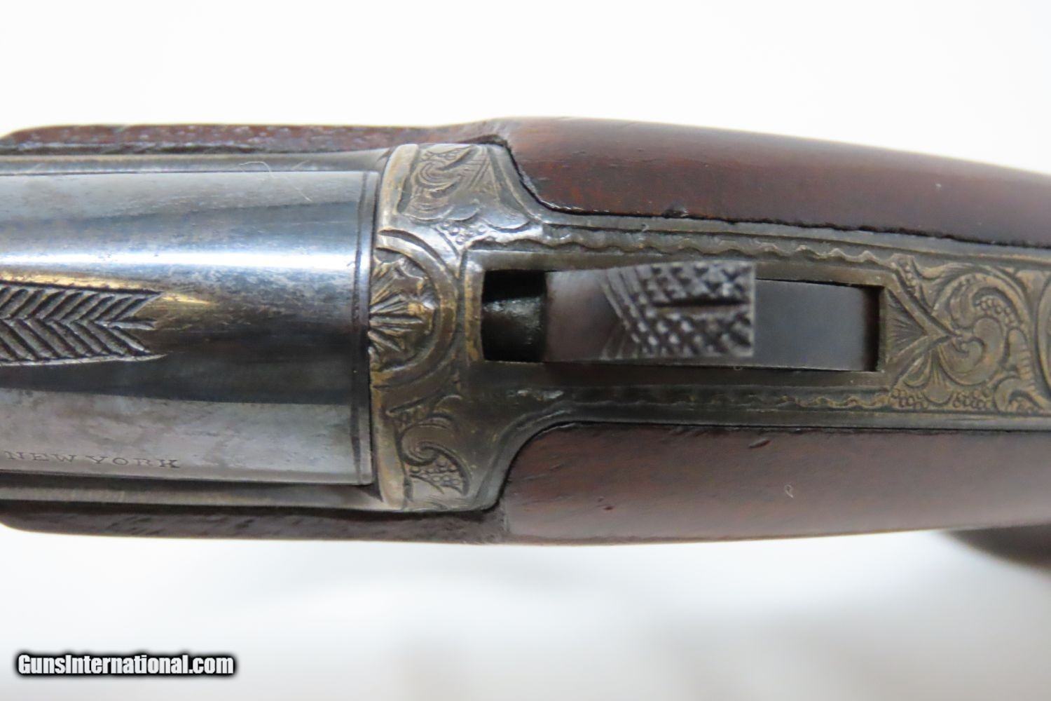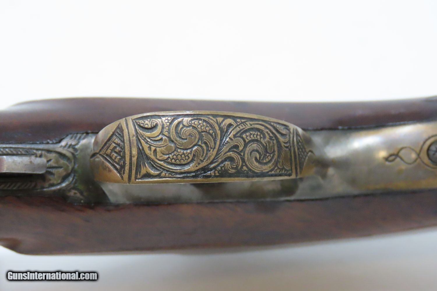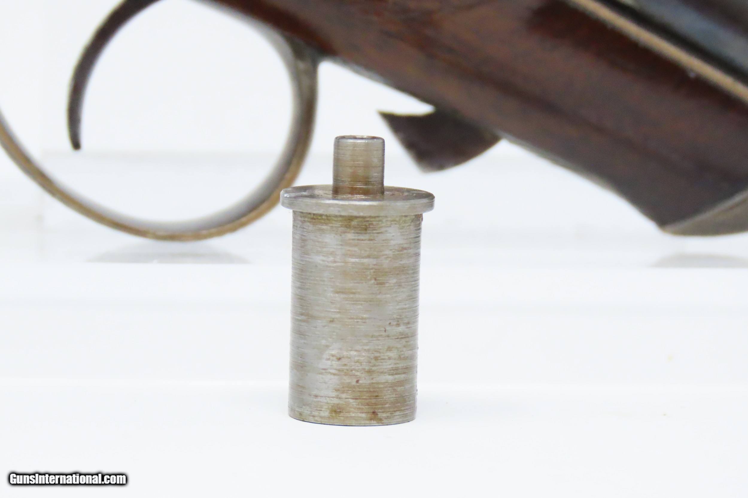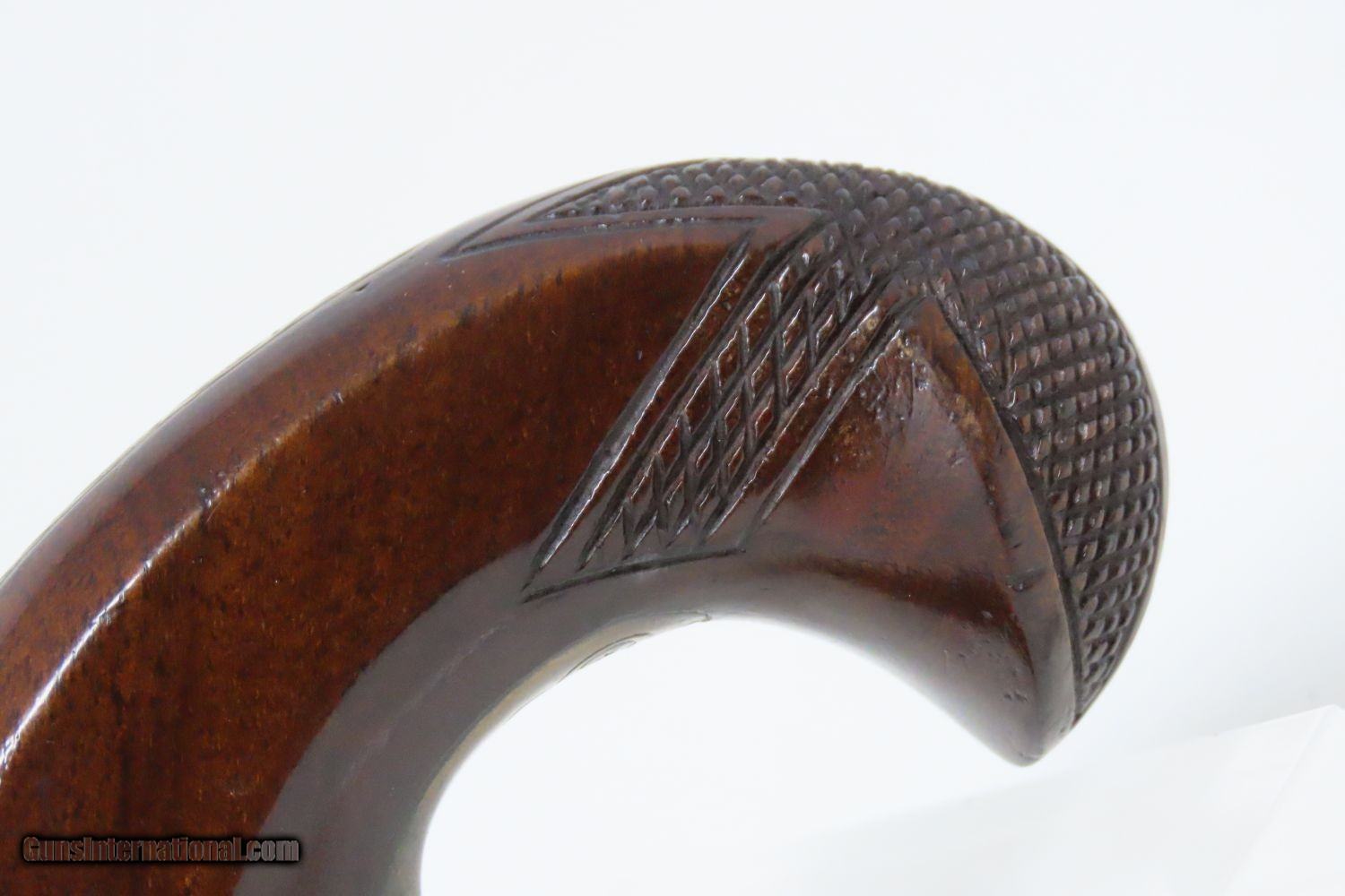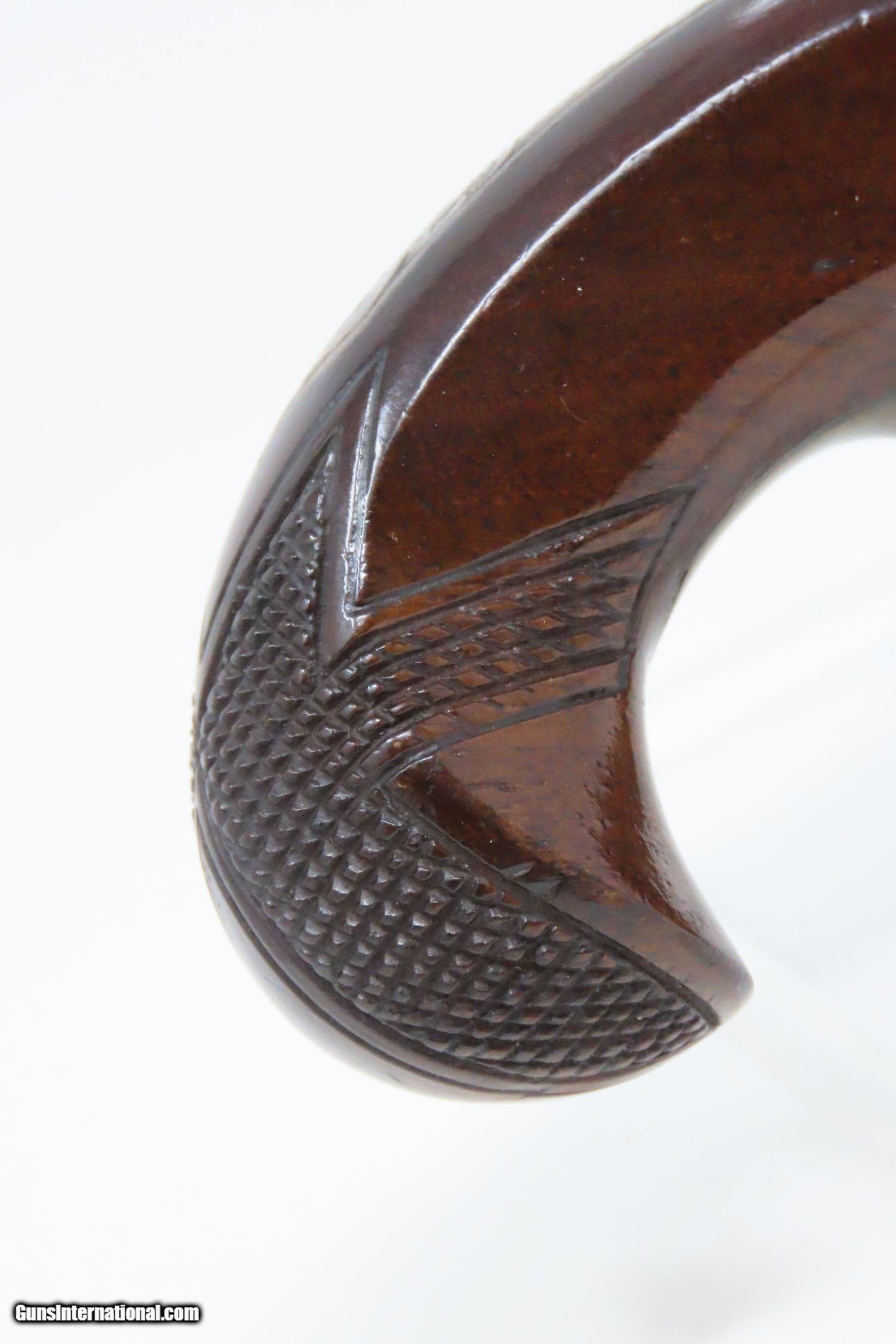 Description: Rare ENGRAVED Antique WILLIAMSON Single Shot CONVERTIBLE .41 Cal. DERINGER Rimfire/Percussion Combination Pistol with PERCUSSION ADAPTER! Here we present an antique Williamson Deringer, made circa 1868 in Brooklyn, New York. According to Flayderman's Guide to Antique American Firearms, this was invented by David Williamson and this unique design that was meant to be the stopgap between a time when the benefits of cartridge pistols were obvious and desirable, but ammunition supply in certain places was questionable. He chambered his deringer for the .41 rimfire cartridge, but included a small adapter that allowed the user to use it as a percussion pistol as well. The hammer was such that it would strike the percussion cap if the adapter was being used (see the hole in the center of the breech face), but also had a rimfire striker when that ammunition was used. Fewer than 10,000 of these were made between the Moore’s Patent Fire Arm Company and National Fire Arm Company. The design shows a clear likeness to Henry Deringer's original percussion single shot pistol from the 1840's...especially in size and profile. It even uses Deringer's distinctive wrap-around checkering on the grip handle. This is a hard to find pistol and even harder to find one in this condition that includes the Percussion Adapter! The overall condition is fine. Strong action. Bright, rifled bore. The stock is solid with smooth finish and nice checkering. Visible markings are clear. Here is a nice little derringer with a neat percussion adaptor. Own the original! This is a legitimate antique and not a reproduction. Barrel is 2-1/2 inches. Caliber: .41 Rimfire Overall condition as seen in photos. Very Fast. Very Safe. FREE SHIPPING WORLDWIDE. Delivered directly to your door by express mail! Guaranteed AUTHENTIC & Includes CERTIFICATE OF AUTHENTICITY. ancestryguns $2325 #210112 SOLD Antique: Yes |