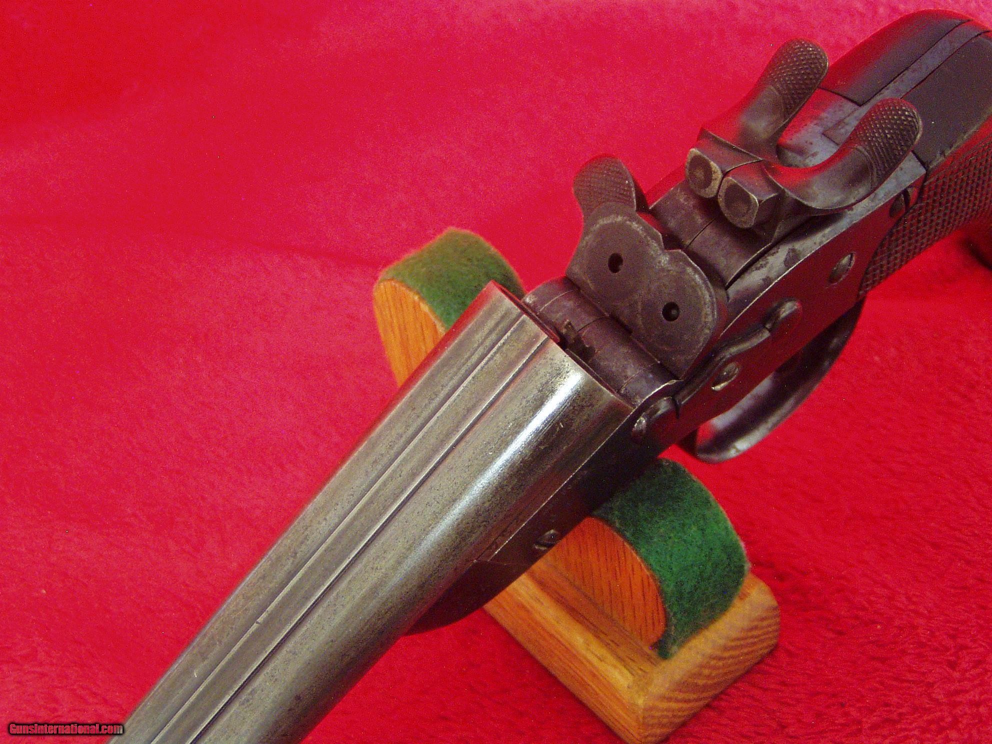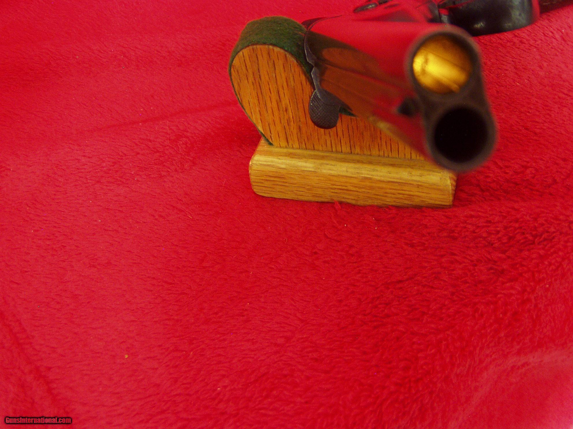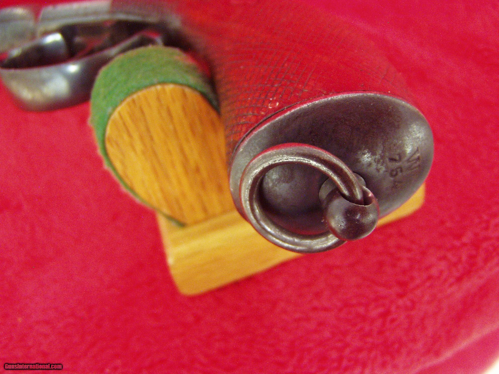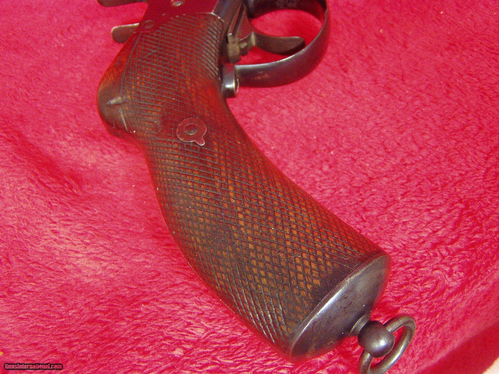 Description: This gun is in overall Very Good Condition. Has 5.5" Round Barrels with excellent bores. I believe it to be 9.4mm Nagant or Belgian caliber. It is Marked: "BREVET REMINGTON", "BREVET NAGANT", "EM and L NAGANT LIEGE", "#754, Serial Number" , and "star*/ELG", Proof markings. Metal finish is all Blue to Grey/Brown Patina. Most wear on barrels from holster. Action is strong and everything locks up tight. Interstingly, the single trigger works both actions; with both hammers cocked,the first pull of the trigger releases the right hammer; the second pull fires the left barrel. Has nice checkered wood grips showing some "smoothing" from use. Has Lanyard Ring. All numbered parts match the Serial #754. Very nice Antique Pistol. Buyer pays $25.00 shipping to lower 48 states. International Shipping Varies. I accept USPS Money Orders, Bank Cashier's Check and I will accept Personal Check, with shipping hold. Layaway Available! ANTIQUE. SOLD Antique: Yes Manufacturer: Nagant Remington Brevet Model: Model 1877 Serial Number: #754 Caliber Info: 9.4mm Bore: 5.5 inch Chambers: 2 shot Ejectors: Top Break Condition: Very Good Metal Condition: Very Good Wood Condition: very good Bore Condition: excellent Barrels: two Barrel Type: round Action: Single Action Triggers: one Stock: Wood Finish: Blued Weight: 2.5 lbs. Sights: barrel Manufacture Date: 1880's |