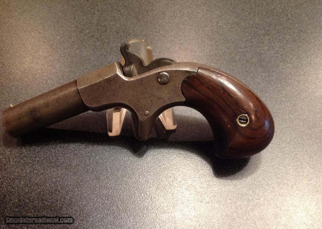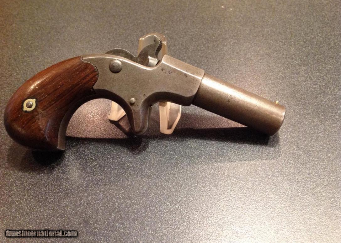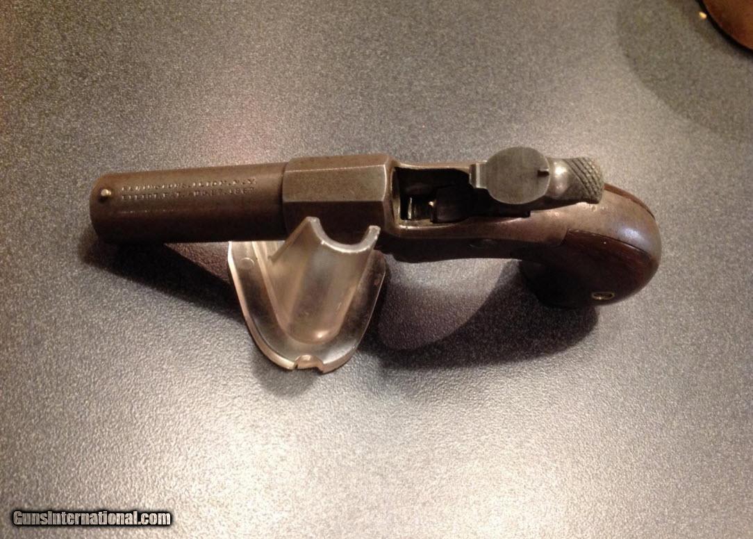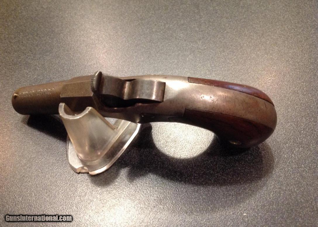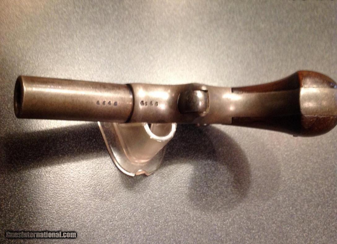 Description: This is a .41 RF antique Deringer with a 2 1/2" barrel. It was originally blue but there is very little finish left on it. The metal is smooth and uncleared with a very minor amount of light pitting present. The barrel markings are crisp and clear. Serial number 4646. The walnut grips are in excellent condition with a small amount of original varnish remaining. The action works perfectly and the bore is in good condition. This is well above average condition for one of the little guns as most were used hard. Let me know if you have any questions or if you want to trade for other antique guns. Shipping paid by buyer for your choice of carriers. Insurance optional but recommended. SALE PENDING SOLD Antique: Yes Manufacturer: Remington Model: Elliott Serial Number: 4646 Caliber Info: .41 Bore: VG Chambers: N/A Ejectors: N/A Condition: Very Good |