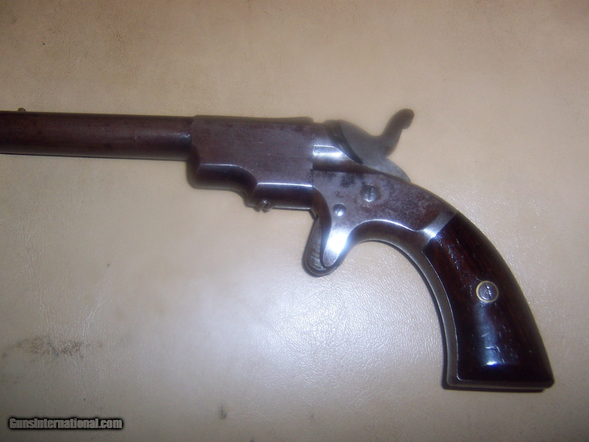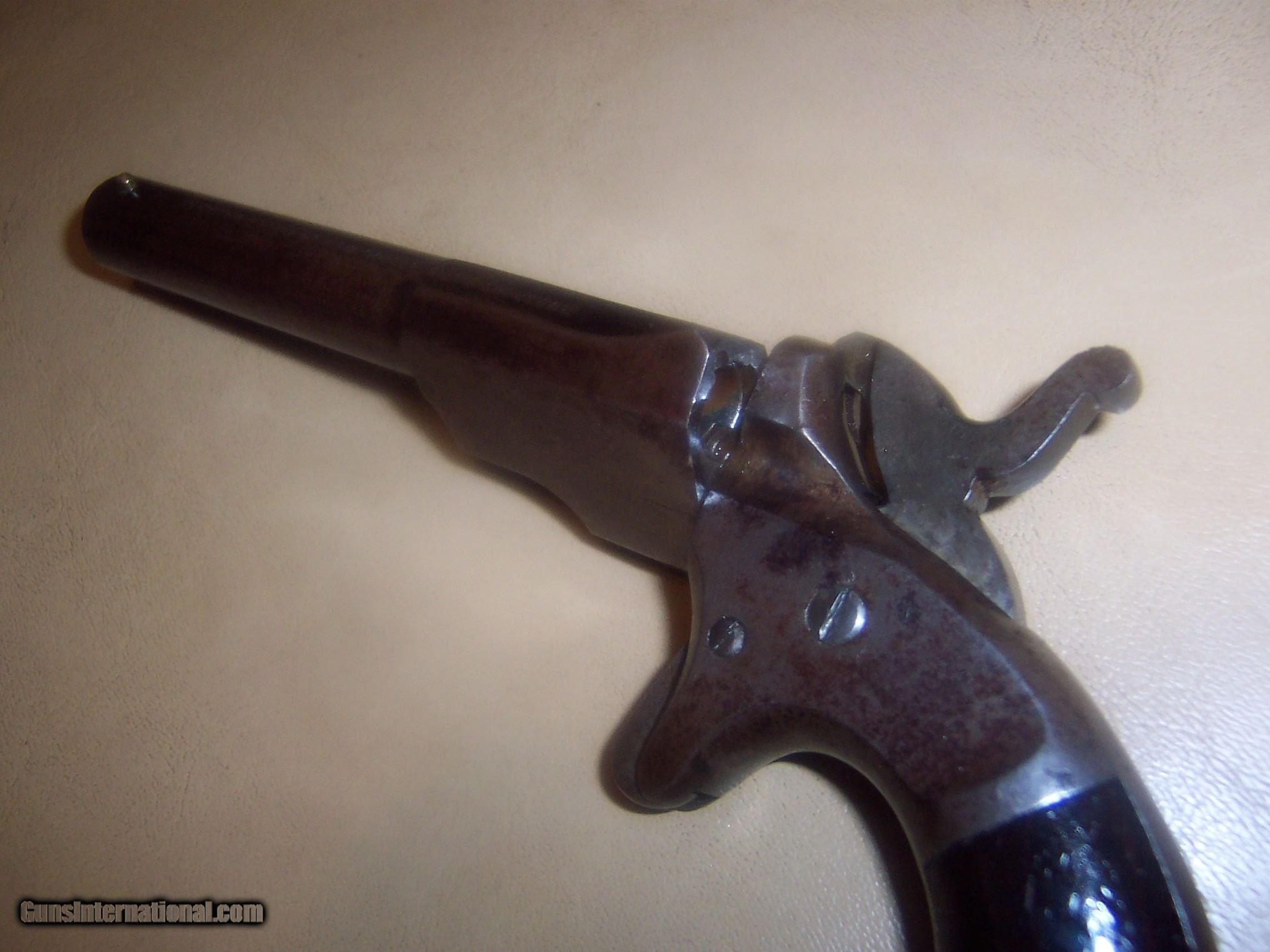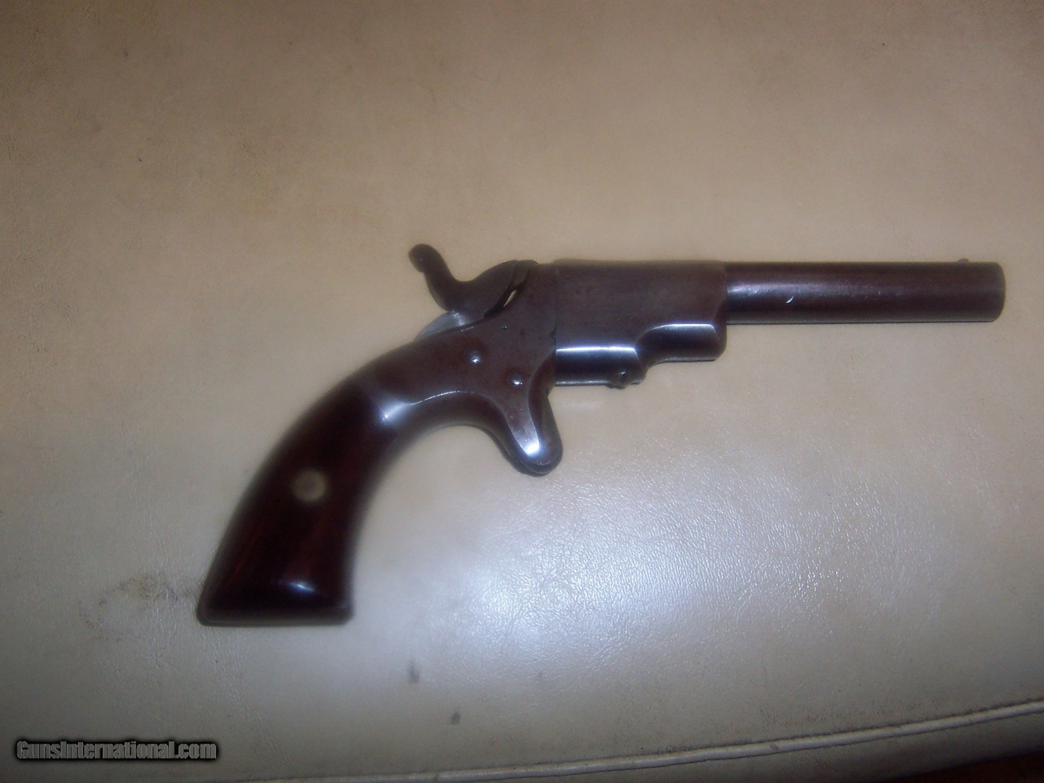 Description: 4 inch barrel // fine 32 caliber bore // gun in almost fine condition but has only minor original blue finish // ex working condition // fine rose wood grips// has a long barrel address i have never seen before// (repurtus pat'd pistol mfg co philadelpha)// before the last a the letter s is struck out $40 SOLD Antique: Yes Manufacturer: repurtus Model: derringer |