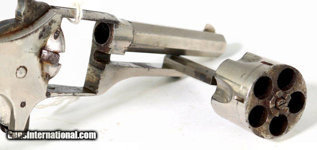 Description: The Unique Shattuck Revolver, with it's Swing Out Cylinder for Loading and Ejection. A Five shot, Spur Trigger revolver in 32 Rimfire... Manufactured by "C.S. SHATTUCK in HATFIELD, MASS. 1879" . I rate the nickel finish at about 60% +. Flayderman estimates total production at "a few thousand". The Original Hard rubber grips are in excellent, like new condition, the tip of the hammer spur is chipped off, the markings are Correct and Clear, the action is excellent. Antique SOLD Antique: Yes |