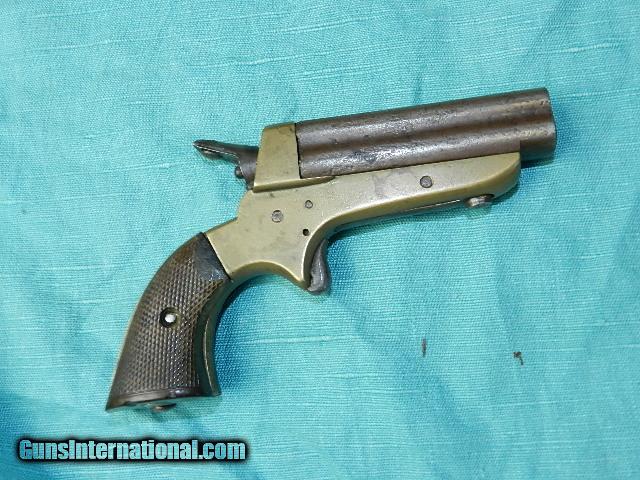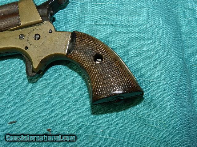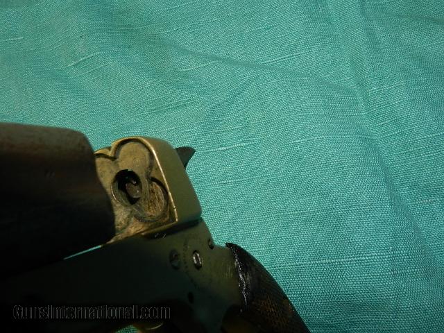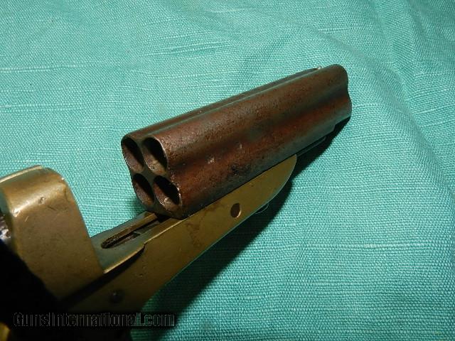 Description: A 19th century derringer /pepperbox 4shot .30 rim fire pistol with 3" barrels , and rifling but corrosion down in the grooves, and the exterior is aged brown metal, with the frame showing mustard yellow color. The under barrel latch releases the barrels the come forward, and they lock back up good. The grips are molded gutta percha and are very good . When the hammer is pulled back the firing pin doesn't rotate, so the action needs attention. A good gun to restore or use as parts. for another gun. Due to the high volume of emails, I can’t keep up with over 200 a day, please be patient, when corresponding thanks . We don’t have asite .I prefer money orders or a check. Item ships when funds come in. If you can only pay with a card let me know. I’m sorry I don’t list my phone number, did that for 30 days, never again.. I can’t talk on the phone all day…who will ship the guns? I’m just one person, and it’s very busy here! I do a brisk volume! I hope you like my wide selection of unusual guns, knives and gun parts. Shipping price determined by zip code. I try to keep the prices affordable, which means I make less money than most dealers. You won’t get altitude sickness with my prices! I consistently have the best selection of older guns If you BUY IT NOW you must still contact us for details buy it now doesn't end the sale, it just sends an email telling us you want to buy this gun. A phone call won’t secure a sale! Not home many times, the first buyer by email buys the gun !Thissite does not close down a sale when you do a BUY IT NOW like Ebay! I can get six buy it nows in an hour, first buyer to email gets the guns, others are in second place! Best to send another email . Sometimes not home to get calls. Some guns are required shipment to a gun dealer near you for a transfer to you when it arrives. With the widest selection of older guns at great prices, We don’t have a store, and sell on the internet only. SOLD Antique: Yes |
