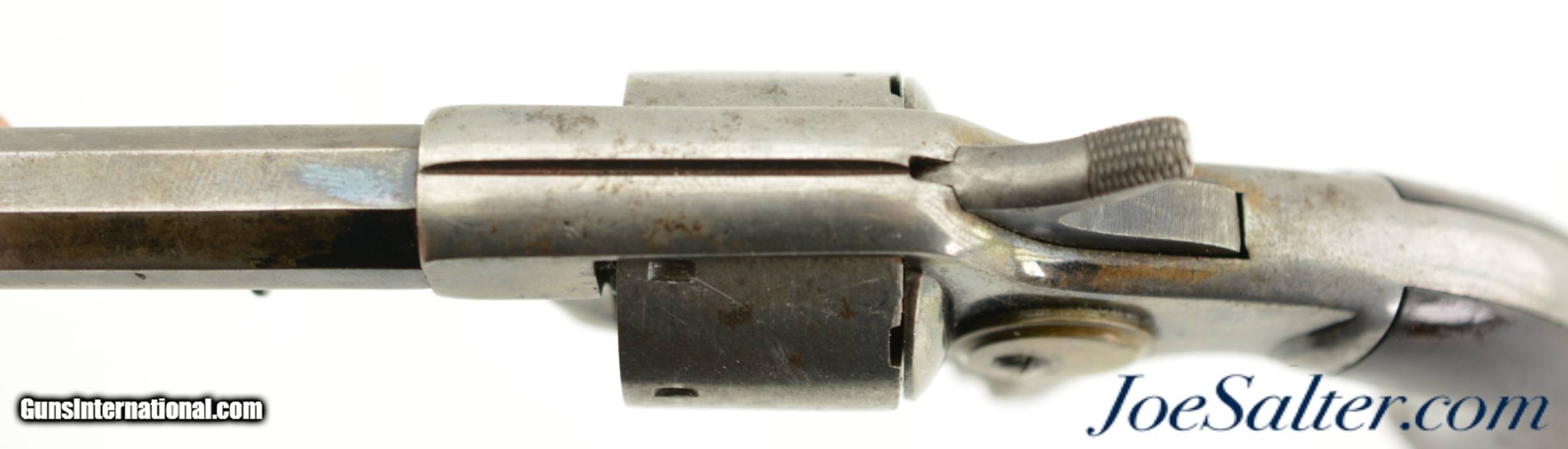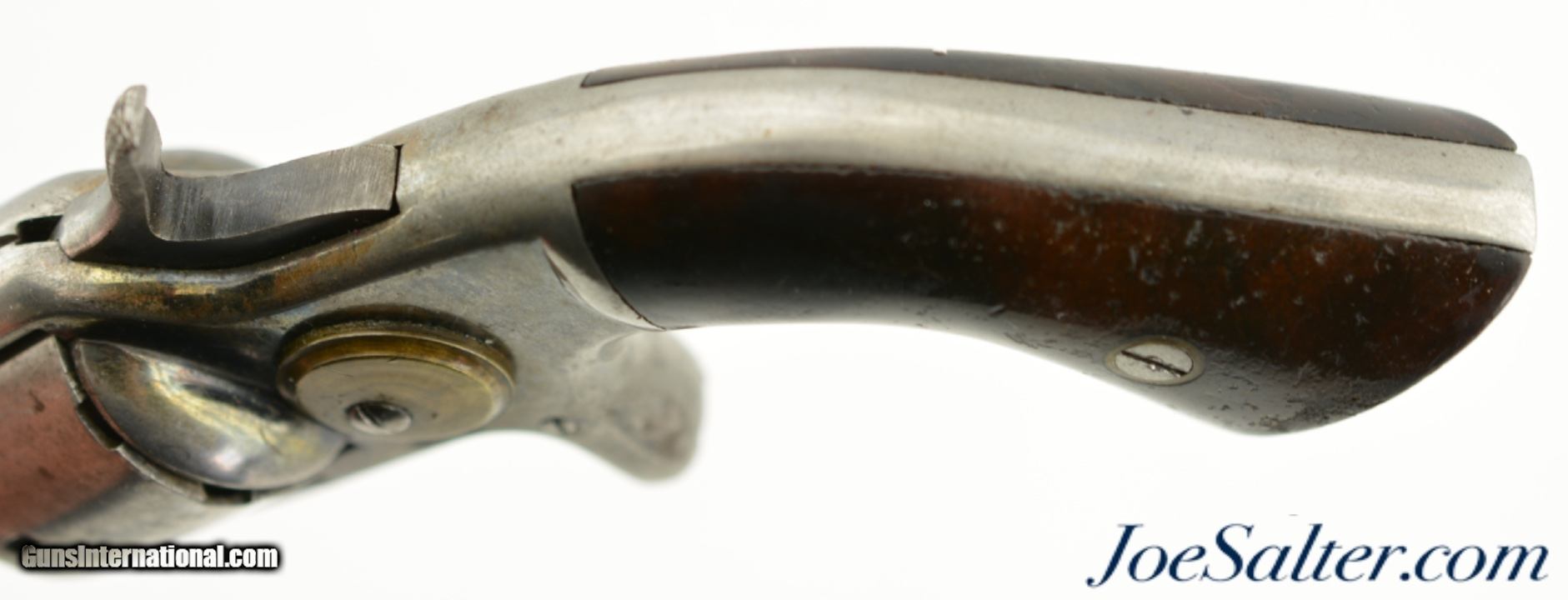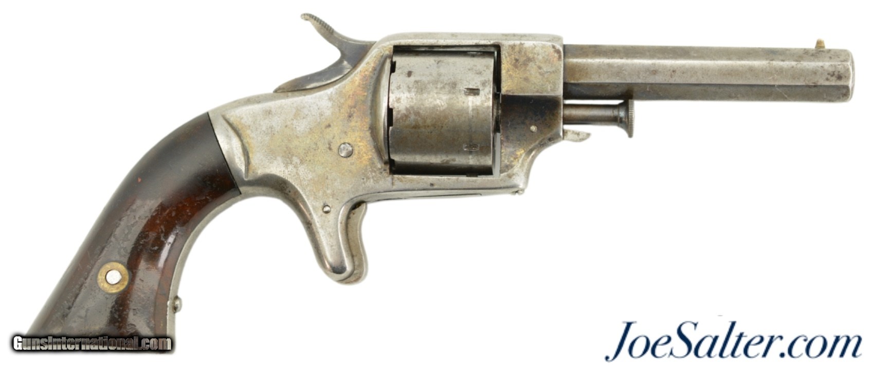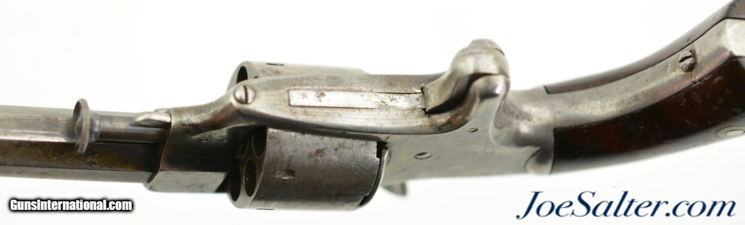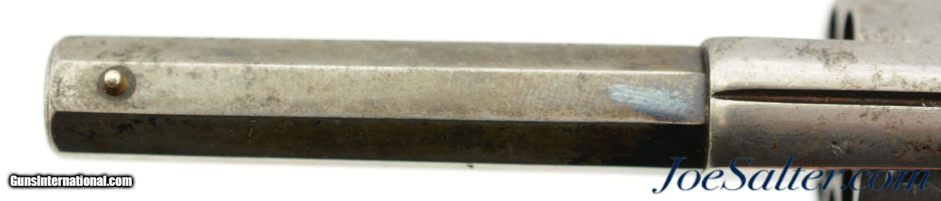 Description: Serial/Assembly #571, .25 Lipfire, 3 inch octagon barrel with a fine bore with scattered light roughness and good rifling. This is a very rarely seen Allen & Wheelock pocket lipfire revolver manufactured from 1860-1863. The antique revolver is completely unmarked except for the Assembly numbers which is absolutely correct for this model with only several observed having Allen & Wheelock markings as it was produced during the Rollin White / Smith & Wesson lawsuits. With fewer than 200 produced this example represents one of the most rare Allen revolvers with this example remaining in fine, fully functional and unconverted condition. The seven shot cylinder was loaded by removing the cylinder so no loading ports are present on this unique firearm with another unusual attribute of a brass side plate to expose the inner working on the left side of the frame. The barrel and frame retain perhaps 15-20% of the original blue finish with the hammer showing generous amounts of somewhat muted case-hardened colors. The rosewood grips are solid with about 75% of the original varnish with the balance worn smooth and each panel is numbered to the gun as is the cylinder and pin. Mechanically it functions properly with correct timing holding at half and full cock with a crisp trigger pull. A fine example of a rarely seen Allen & Wheelock pocket lipfire revolver. Antique SOLD |