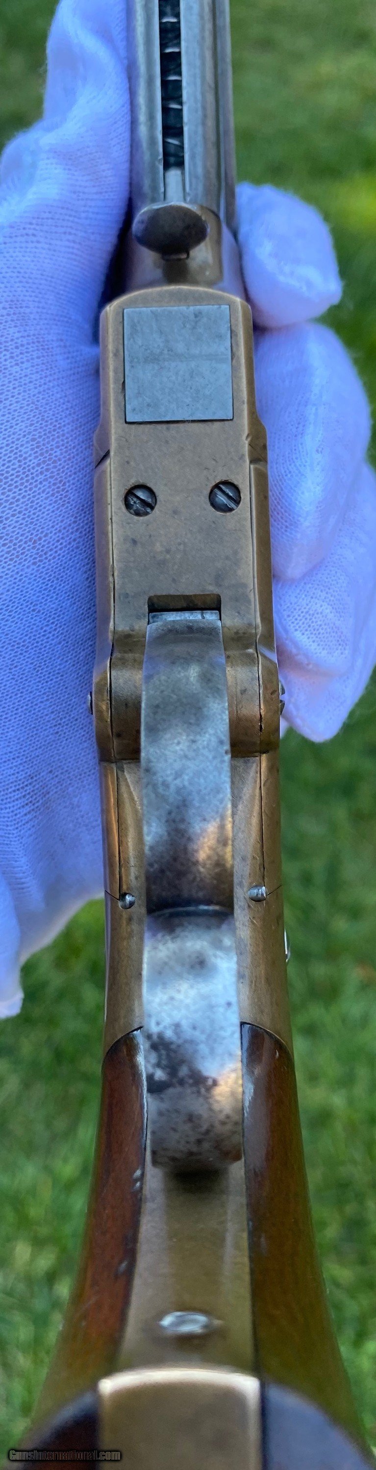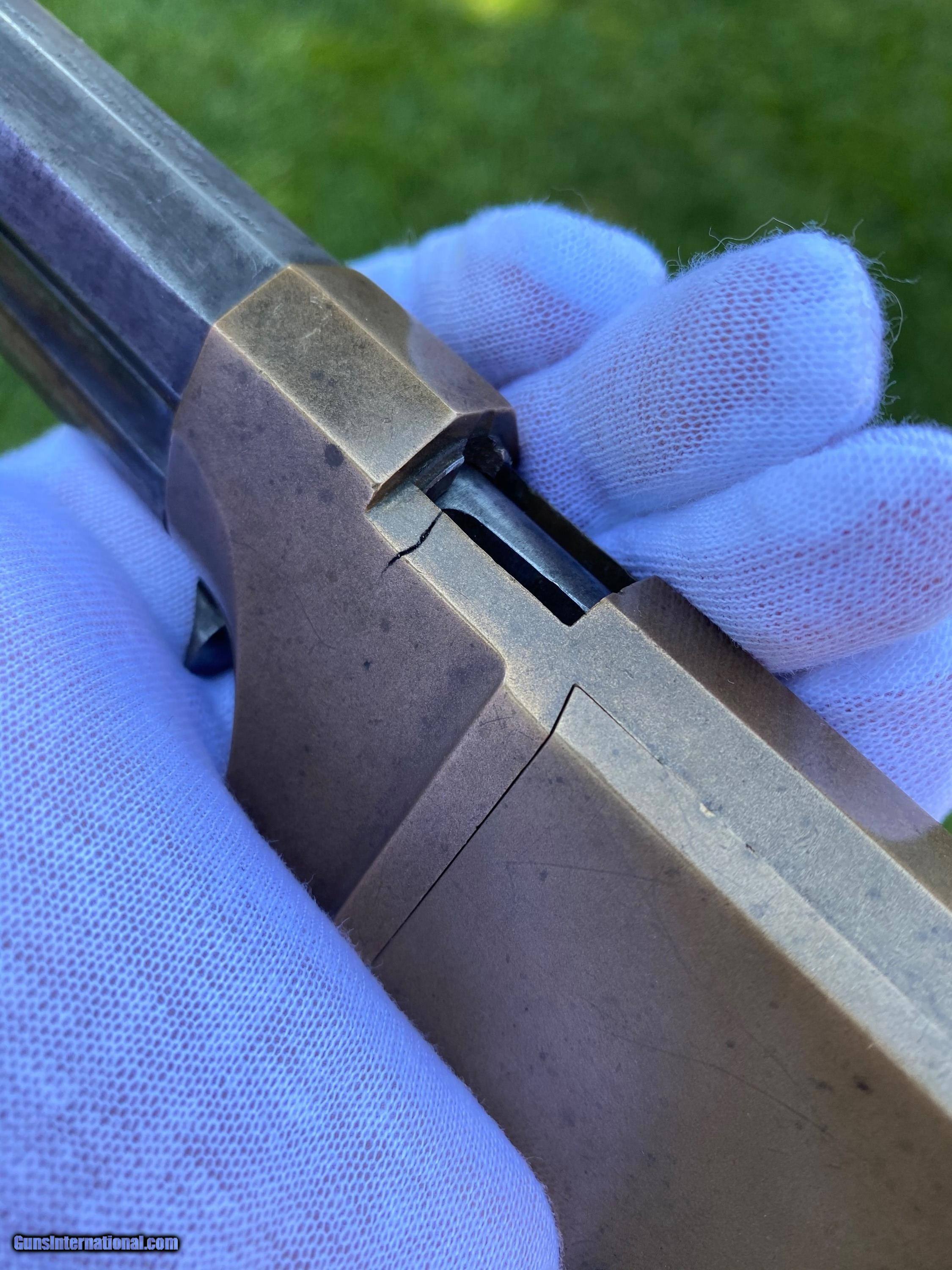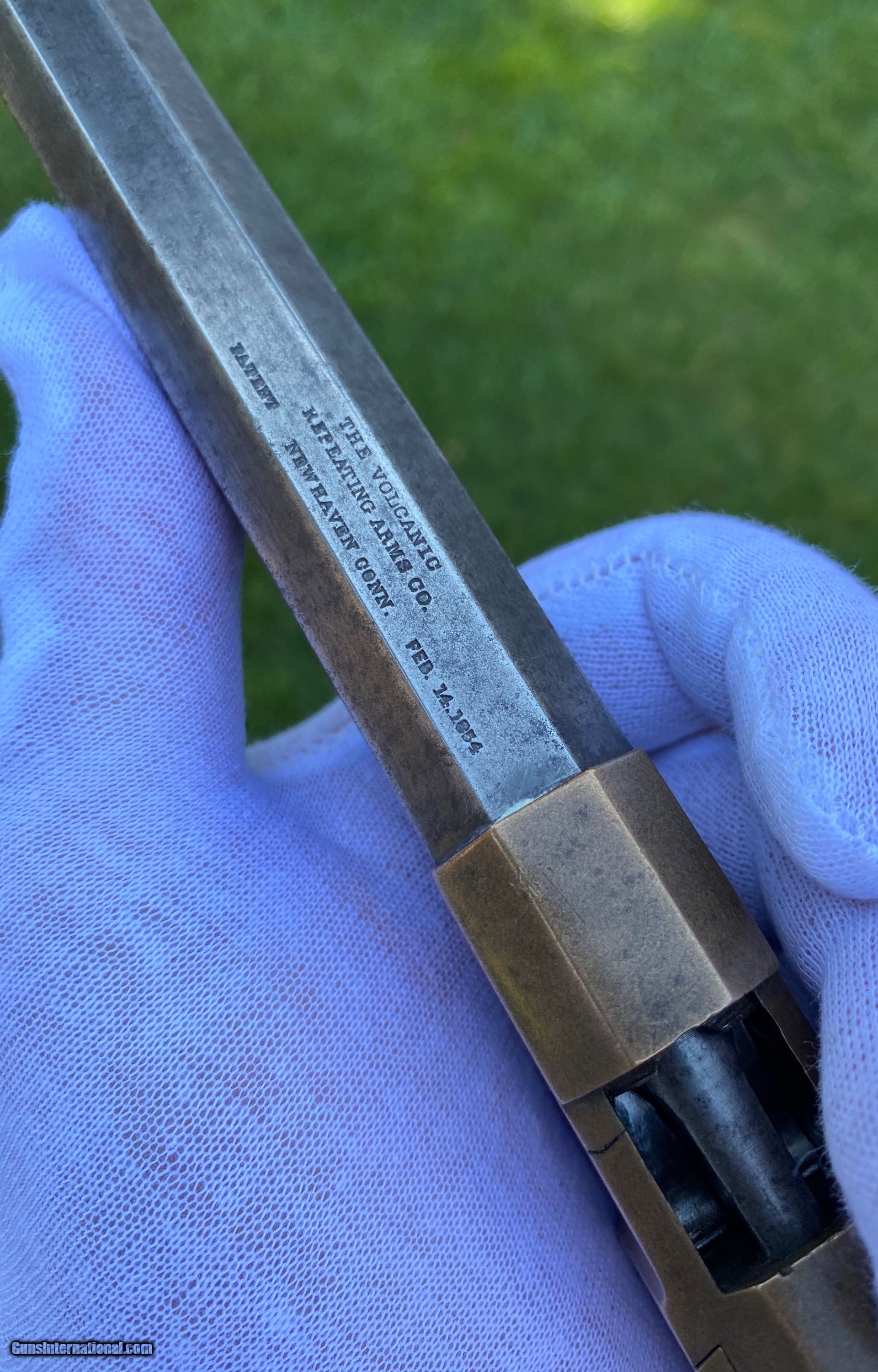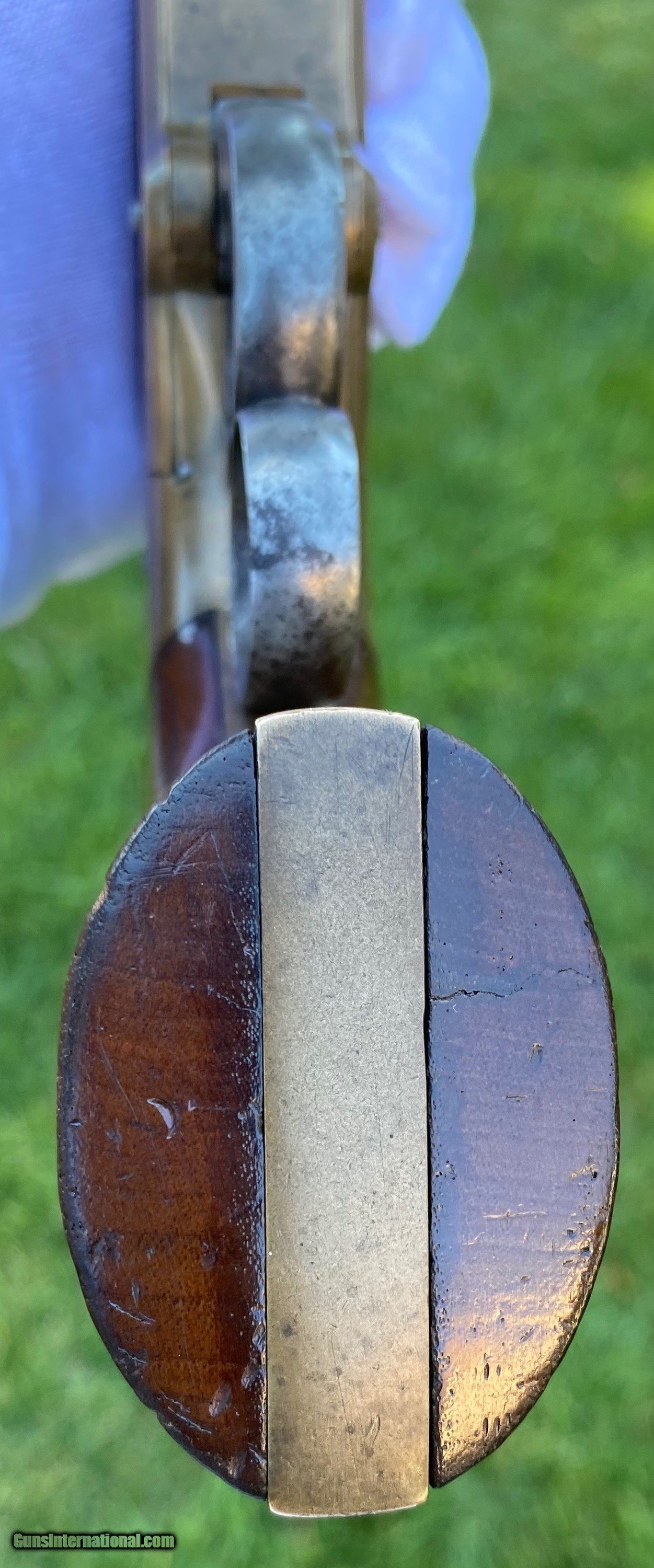 Description: This is an excellent example of the Volcanic Navy, This pistol features an 8" barrel with a crisp and sharp barrel address. The finish of the barrel is a grey. The grips are excellent and retain most of their original factory varnish. The brass frame shows an untouched mustard patina, The frame has a sharp hairline crack which can be shown in the photo, how that happened, I am unsure but it doesnt appear to effect it in any way other then noticing on ones appearence. Mechanically tight and functions excellent. This is a scarce Volcanic Navy with the 8" barrel and at this pricepoint, it would be hard to improve upon. Shipping is $30 Plus actual insurance. Insurance amount can be chosen by the buyer. Asking $10,300 SOLD Antique: Yes |