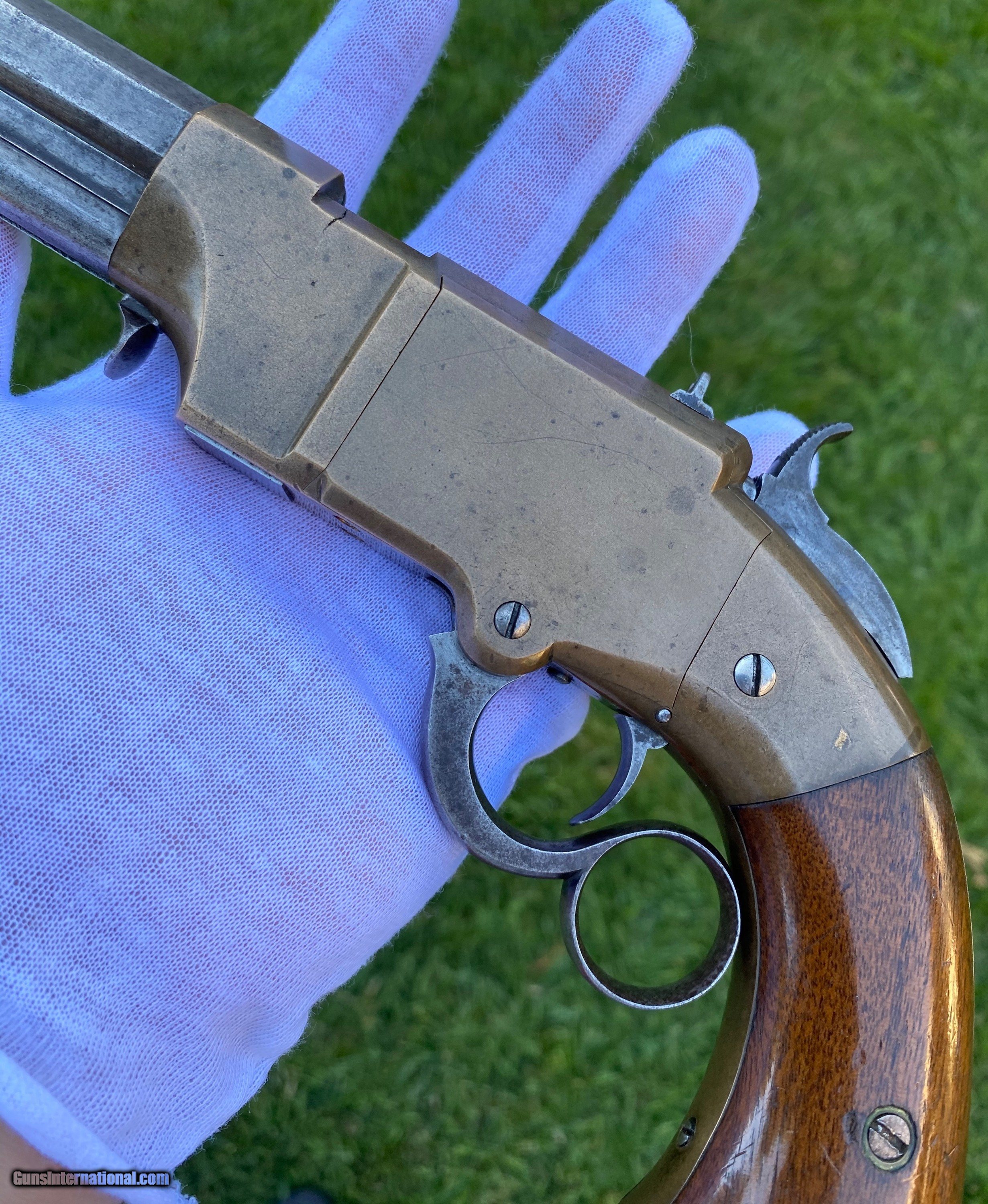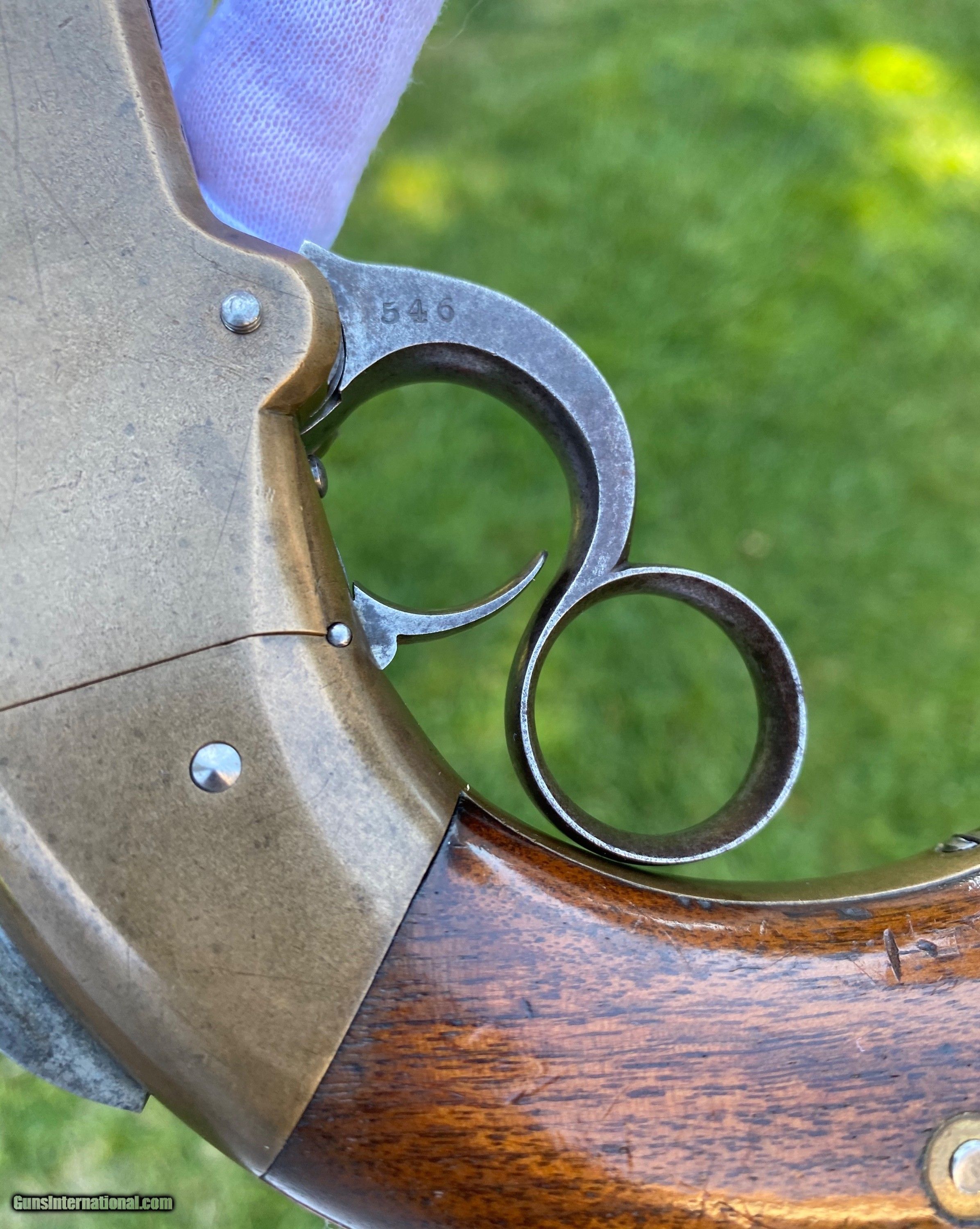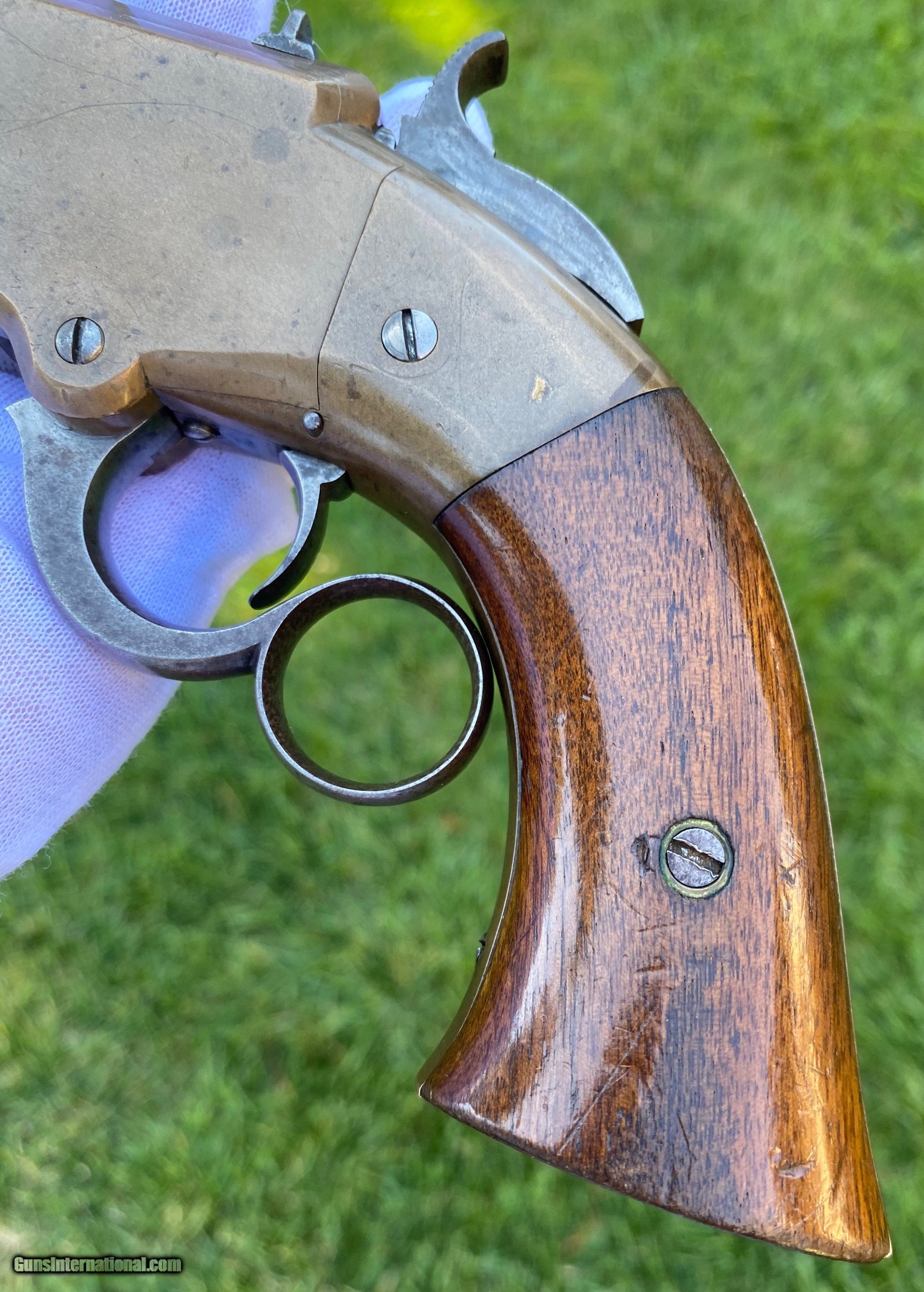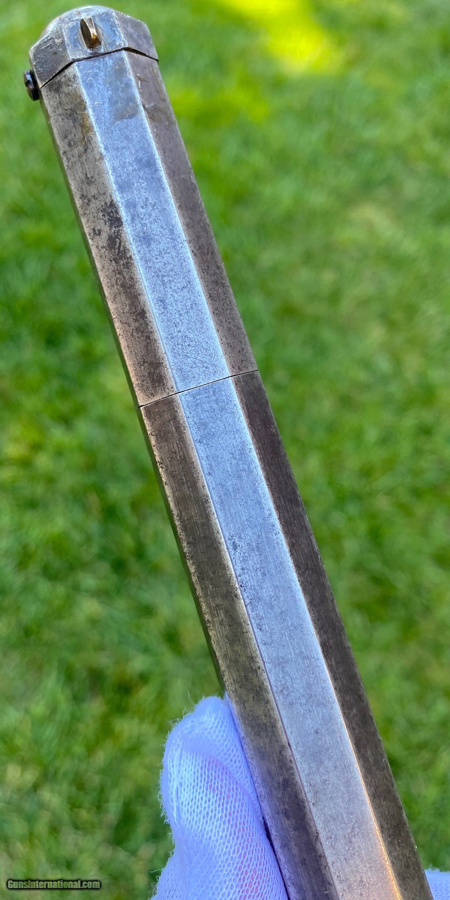 Description: This is an excellent example of the Volcanic Navy, This pistol features an 8" barrel with a crisp and sharp barrel address. The finish of the barrel is a grey. The grips are excellent and retain most of their original factory varnish. The brass frame shows an untouched mustard patina, The frame has a sharp hairline crack which can be shown in the photo, how that happened, I am unsure but it doesnt appear to effect it in any way other then noticing on ones appearence. Mechanically tight and functions excellent. This is a scarce Volcanic Navy with the 8" barrel and at this pricepoint, it would be hard to improve upon. Shipping is $30 Plus actual insurance. Insurance amount can be chosen by the buyer. Asking $10,300 SOLD Antique: Yes |