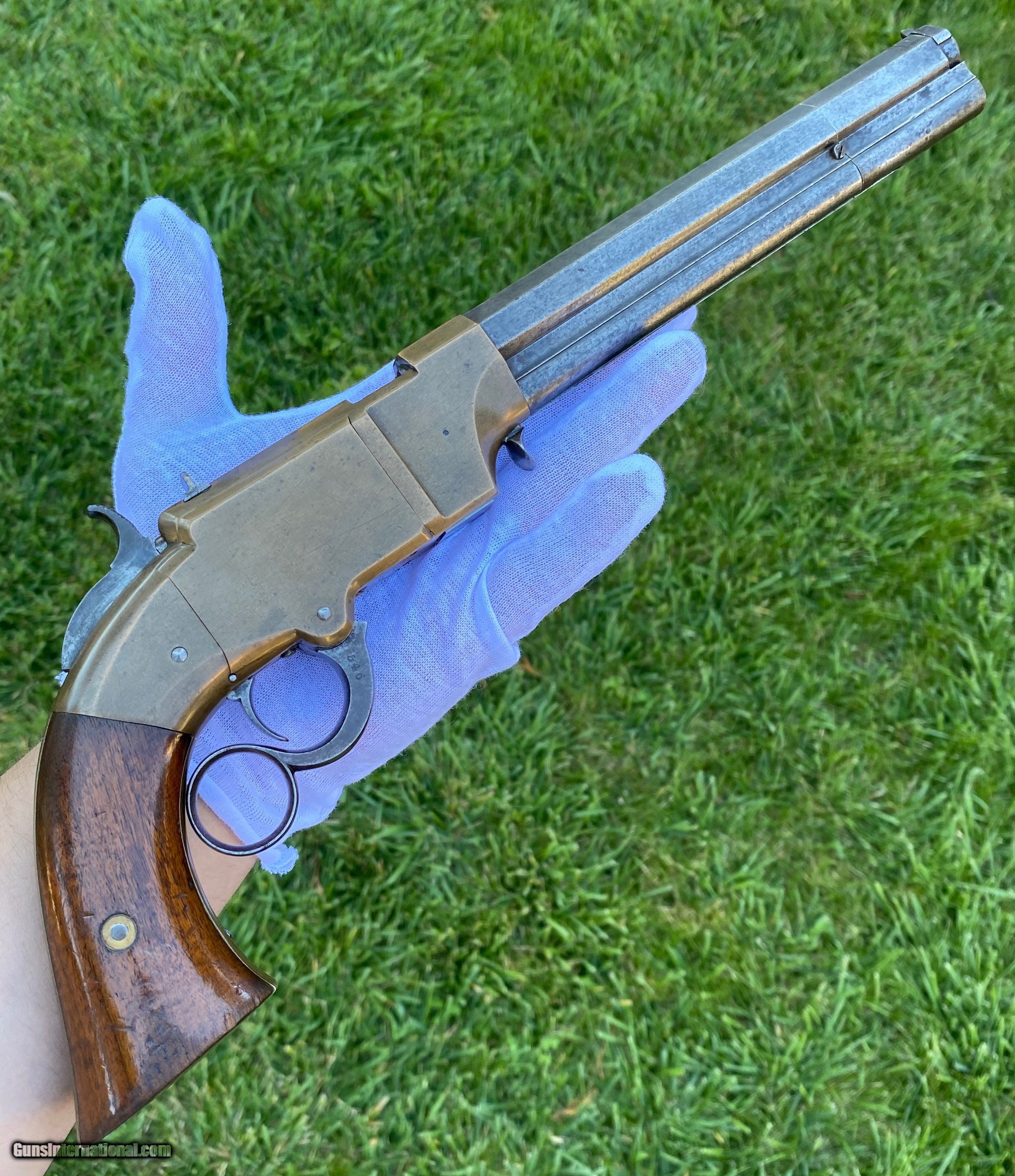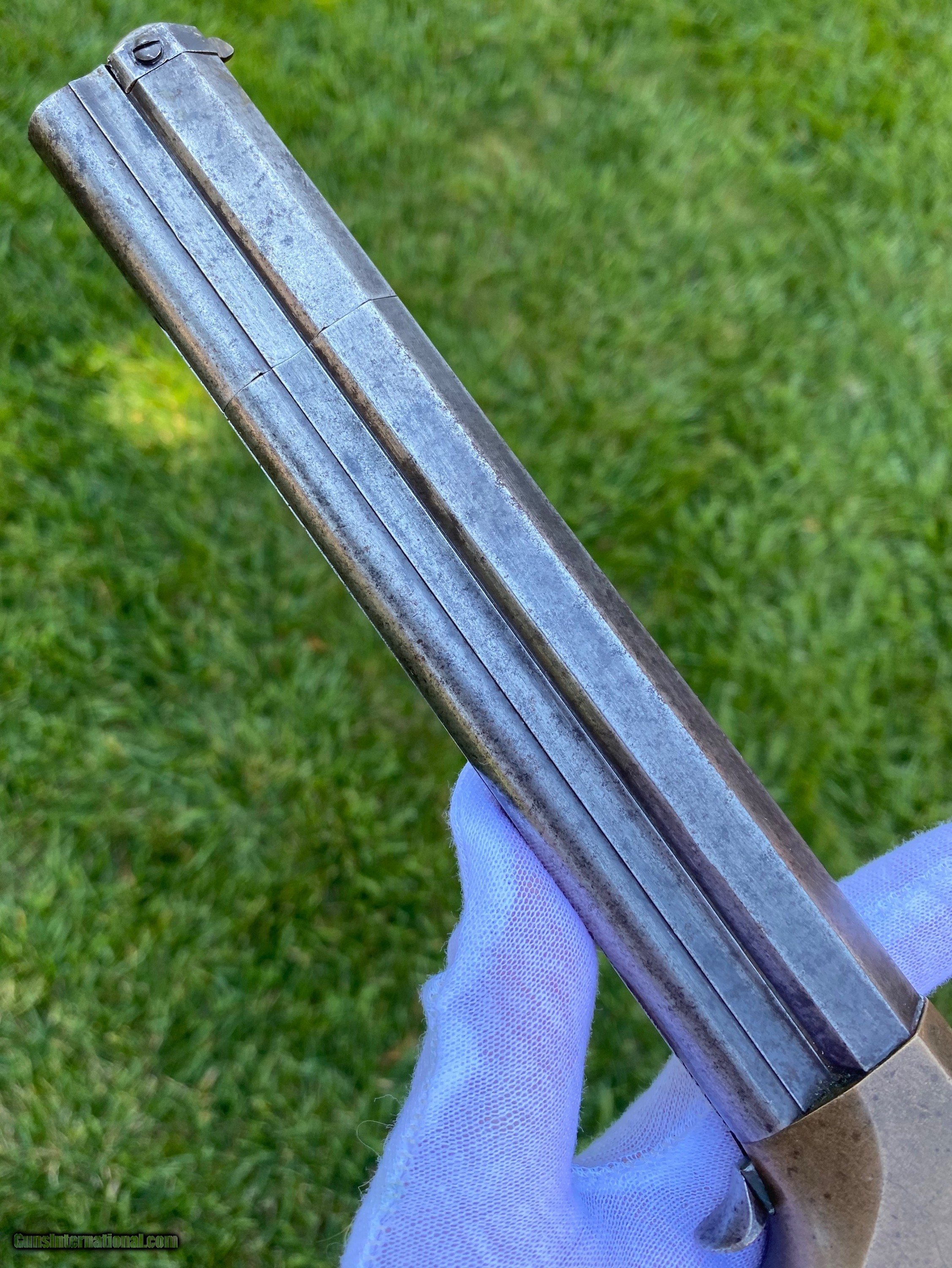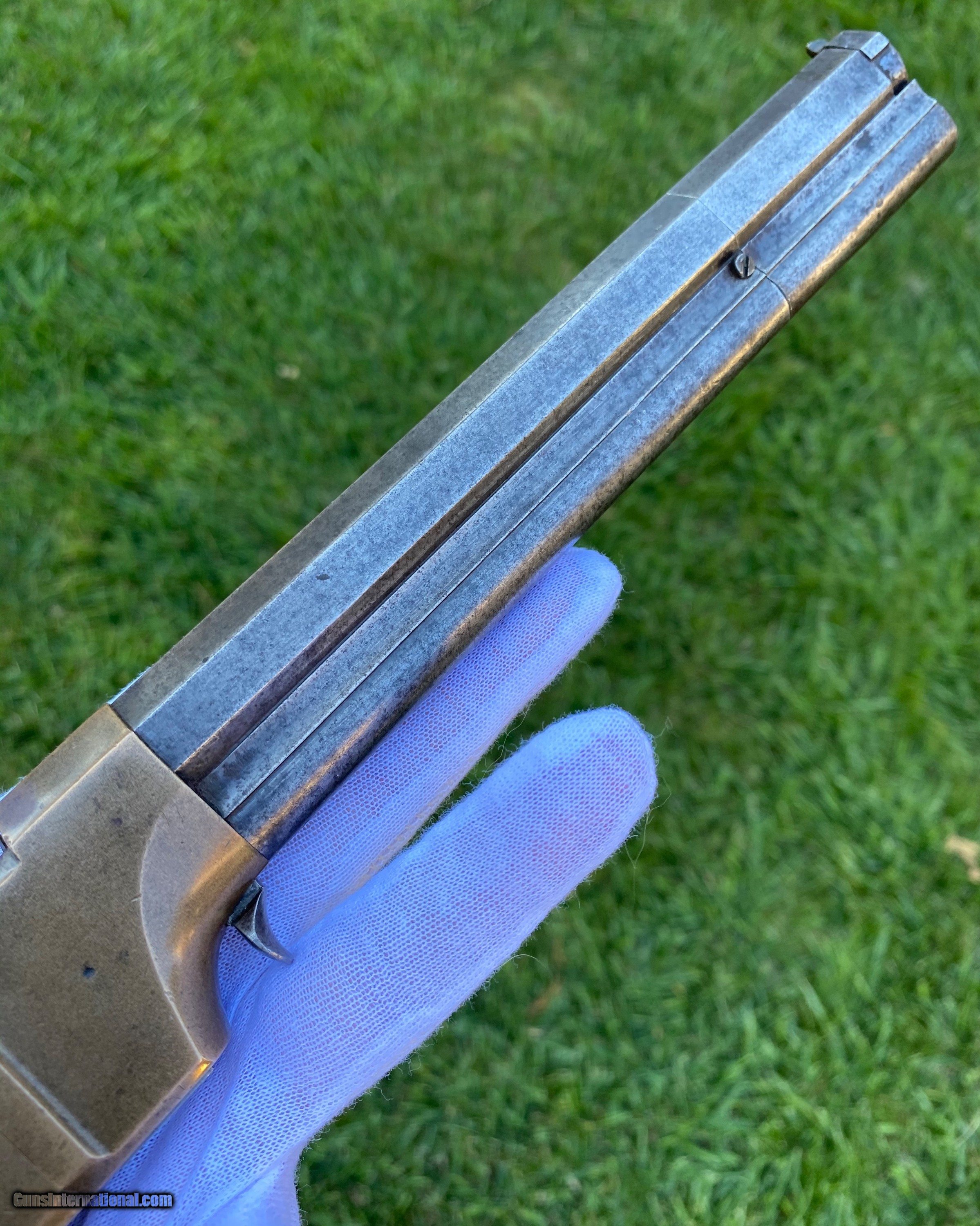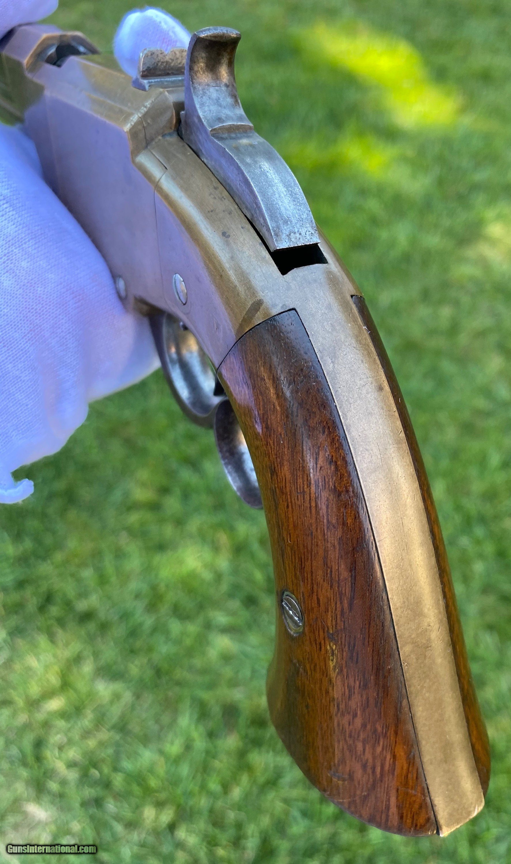 Description: This is an excellent example of the Volcanic Navy, This pistol features an 8" barrel with a crisp and sharp barrel address. The finish of the barrel is a grey. The grips are excellent and retain most of their original factory varnish. The brass frame shows an untouched mustard patina, The frame has a sharp hairline crack which can be shown in the photo, how that happened, I am unsure but it doesnt appear to effect it in any way other then noticing on ones appearence. Mechanically tight and functions excellent. This is a scarce Volcanic Navy with the 8" barrel and at this pricepoint, it would be hard to improve upon. Shipping is $30 Plus actual insurance. Insurance amount can be chosen by the buyer. Asking $10,300 SOLD Antique: Yes |