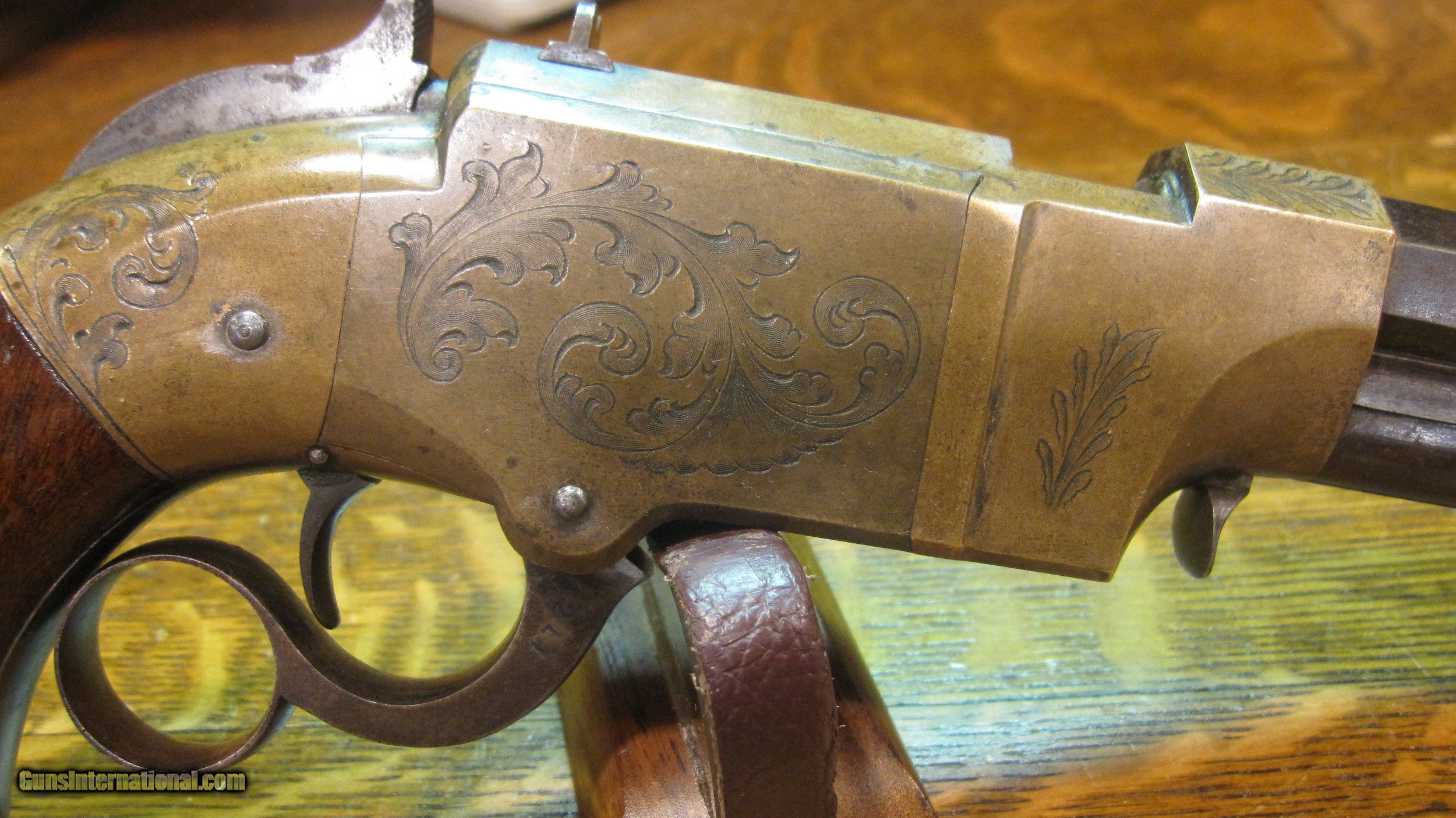 Description: New Haven Arms Navy Pistol. .41 CAL. Serial #2217. Manufactured in 1859, FACTORY ENGRAVED. RARER 6" Barrel. Estimated 300 produced. Very fine to excellent condition. 30-40% original blue. Cartridge follower has original fire blue remaining. Brass is simply GORGEOUS! Originally silver plated with just traces remaining. Even with fine condition guns the thin silver plate wore off soon. Action is fine, bore has great rifling and is somewhat shiny but , has been fired. Grips have 98% original varnish. Left grip has had a broken piece reattached with glue only. Original piece with no restoration or refinish. Please call 973-214-3407 with questions. Thankyou ON HOLD SOLD Antique: Yes |
