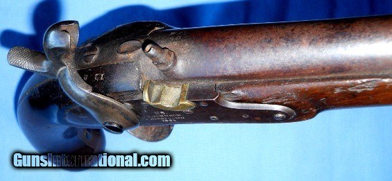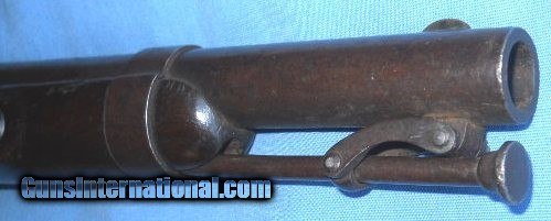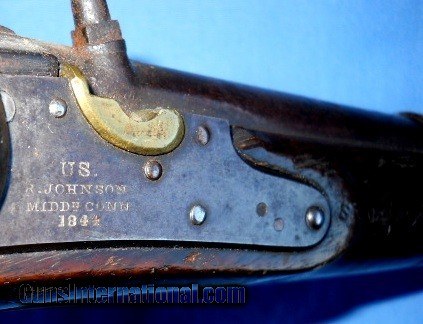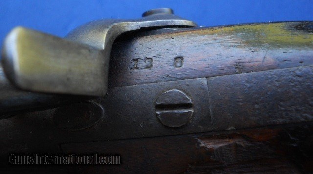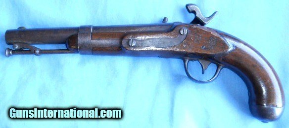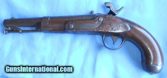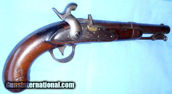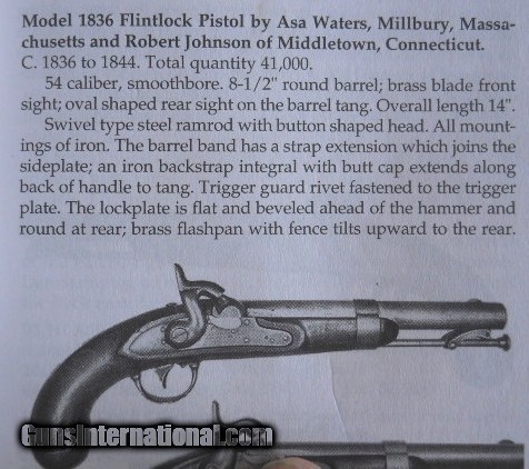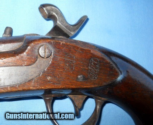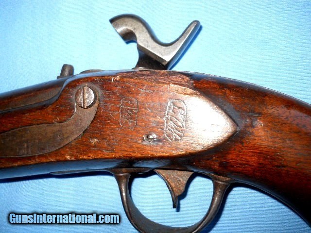 Description: U.S. MODEL 1836 ROBERT JOHNSON .54 CALIBER FLINTLOCK PISTOL CONVERTED TO PERCUSSION FOR MEXICAN WAR AND USED EXTENSIVELY IN THE CIVIL WAR. ORIGINAL METAL SURFACES MOSTLY TONED TO A PLUM-BROWN PATINA WITH SCATTERED LIGHT DINGS AND OLD STAINS. LOCK PLATE & HAMMER HAS HINTS OF ORIGINAL CASE COLORS MARKED "U.S. R. JOHNSON, MIDDn, CT" BARREL HAS FULLY LEGIBLE MARKINGS. WALNUT STOCK HAS MOST OF THE ORIGINAL FINISH, SHOWS 2 VERY GOOD CARTOUCHES & OTHER PERIOD STAMPINGS ALONG WITH DINGS, HANDLING, CHIP ABOVE LEFT SIDE FLAT & TYPICAL SMALL TIGHT CRACK TO LOCKPLATE SCREW (PICS 16,17,18) . BETTER THAN AVERAGE CONDITION OVERALL, AS PICTURED. LOCK IS FULLY FUNCTIONAL, CLEAR BORE & NIPPLE, APPEARS IT COULD BE FIRED IF WANTED. $20.00 S&H DIRECT TO BUYER ANYWHERE THAT'S OK. SEE ALL "ESTATE ANTIQUES" LISTINGS FOR MORE GOOD ITEMS AT SENSIBLE PRICES FROM OLD TIME COLLECTIONS. SOLD Antique: Yes Manufacturer: ROBERT JOHNSON Model: 1836 Barrel Length: 8 1/2 Bore: SMOOTH Condition: VERY GOOD PLUS Metal Condition: ORIGINAL Wood Condition: VERY GOOD Bore Condition: VERY GOOD Barrel Type: ROUND Action: CRISP & TIGHT Stock: WALNUT Finish: ORIGINAL Weight: 2 lb 6 oz Manufacture Date: 1844 |