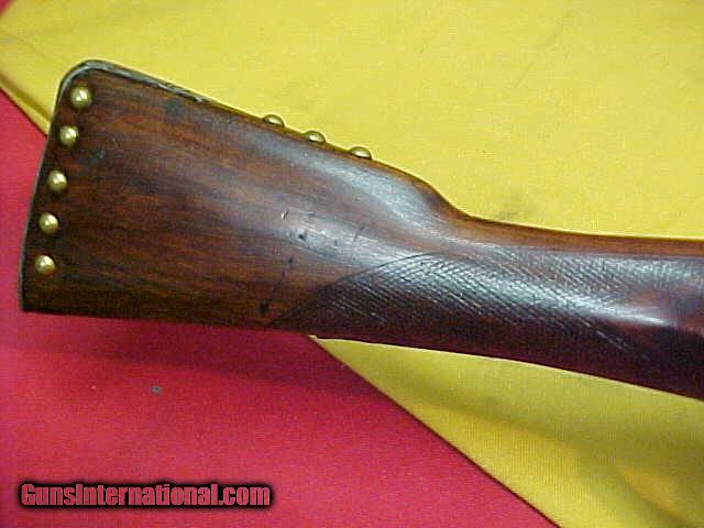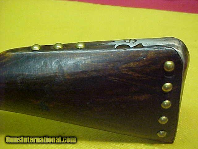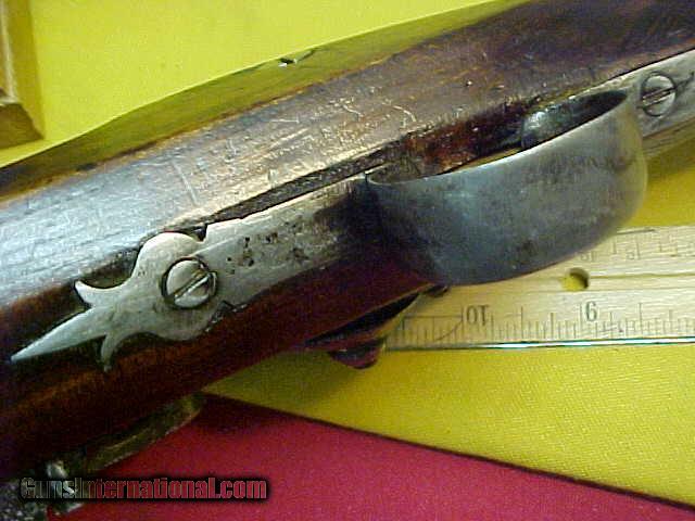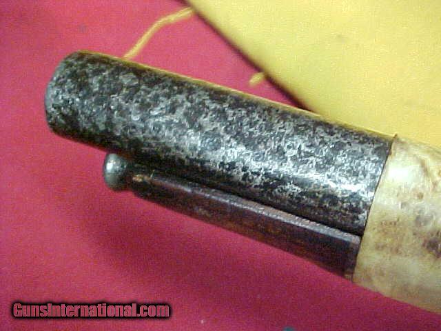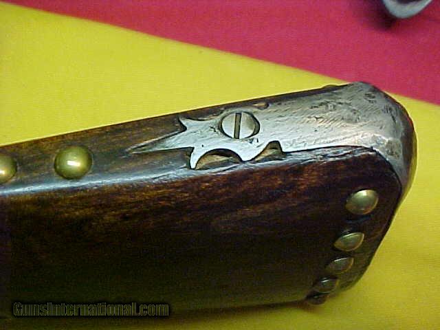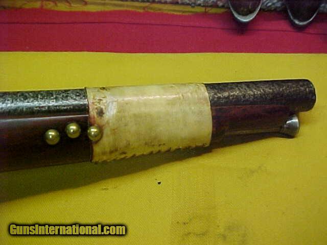 Description: #2473 Unmarked Flint “Blanket Gun” or very small Musketoon (…or perhaps a very large pistol!) It measures about 24” overall and has a 13” barrel that has medium overall pitting and is approx 60caliber. The lockplate has a couple of stripped screw threads and the frizzen is sloppy-worn, so this oddity has seen considerable use in its day. The wrist checking is worn down almost to wear it looks like a photograph, there are brass tacks of dubious age here and there, and the forestock has some rawhide wrapping which adds some color and character, but I can probably hold my breath almost as long as it is old! Still, it does look to be a genuinely old gun, and whether it is a TRUE “blanket gun” from the Mountain Man and fur trade era is pretty much any ones guess. There are no markings at all (that are visible) so there's a reasonable argument that this COULD be very early American-made. But for sure, wherever and whenever it was made, it is an interesting weapon and great conversation piece! Good-Good+ $975 SOLD Curio/Relic: Yes Antique: Yes |