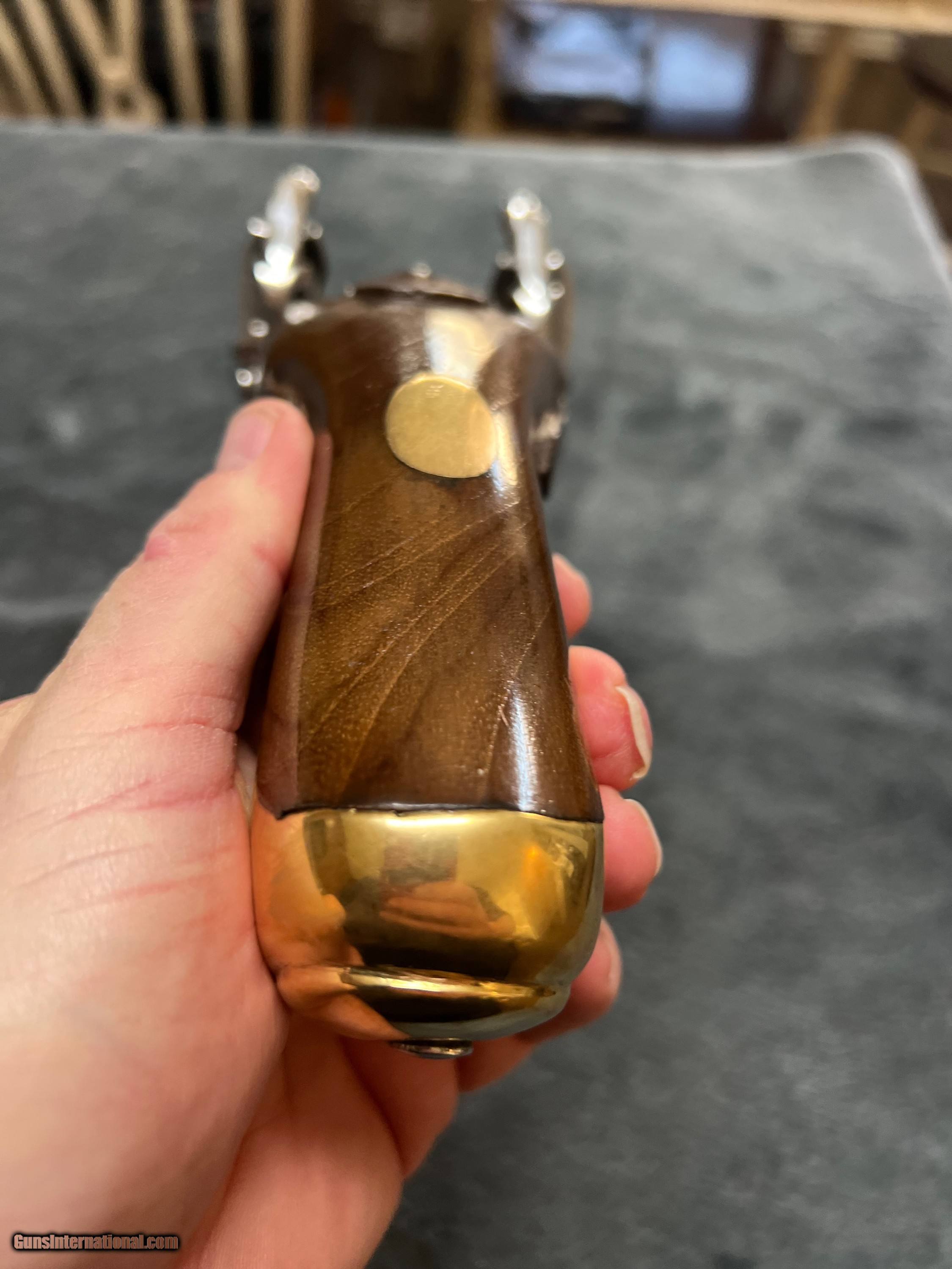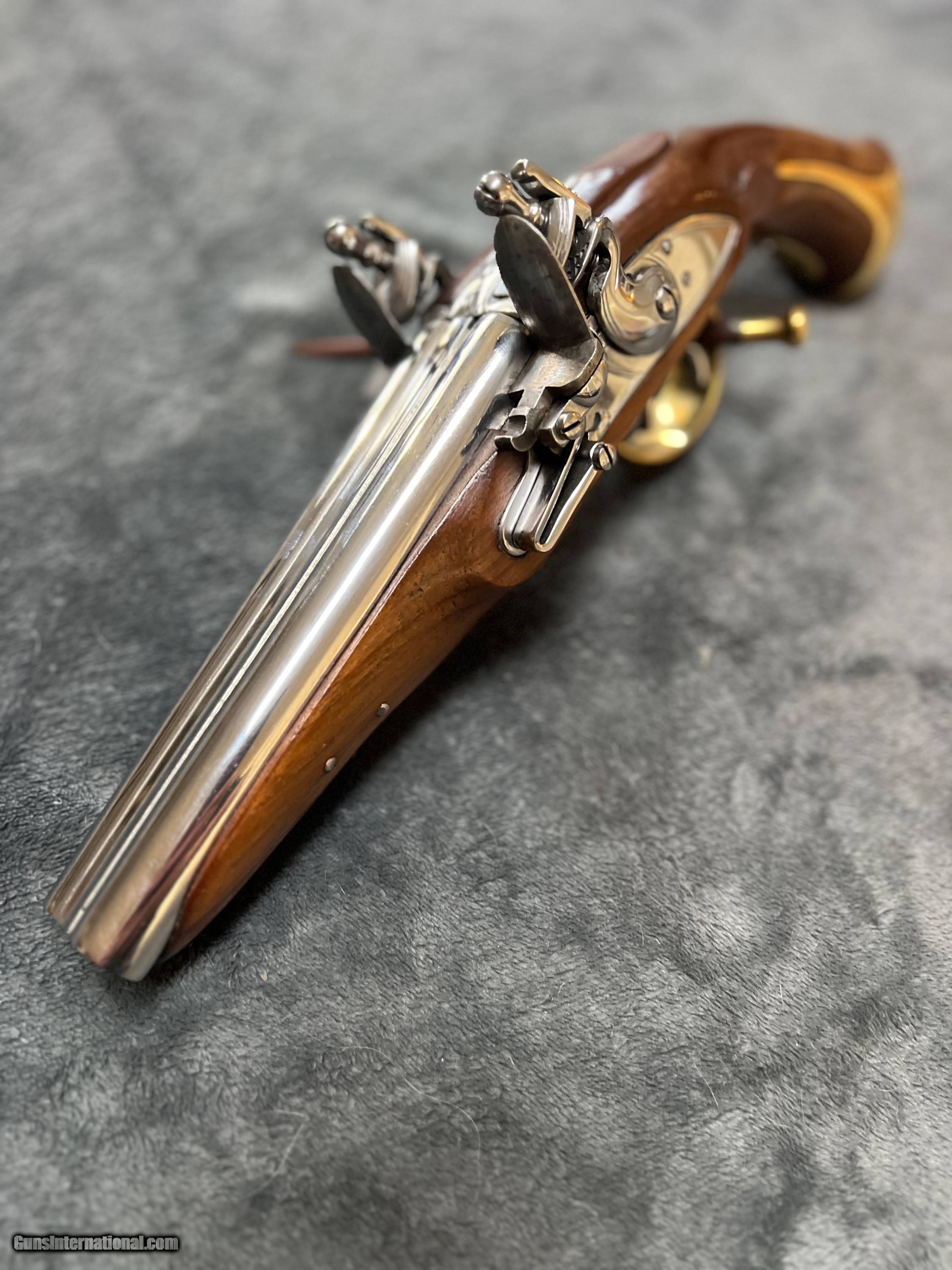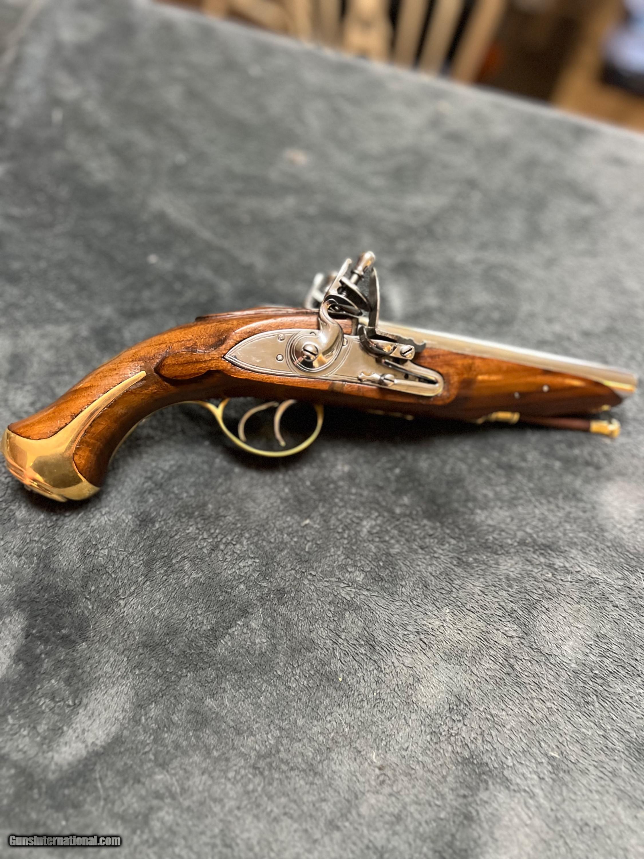 Description: FLINTLOCK DOUBLE BARREL PISTOL: MINT BOUGHT IT ON SITE AND REALIZED…ITS NOT MY CUP OF TEA MIDDLESEX VILLAGE TRADING COMPANY DOUBLE BARREL FLINTLOCK PISTOL 1990’s 6 3/4" SIDE-BY-SIDE BARRELS...SMOOTHBORES EARLY VERSION...APPROX. .58 CALIBER AT MUZZLE. NICELY FIGURED, HARDWOOD STOCK POLISHED BRASS FITTINGS BRASS TIP RAMROD BRAND NEW OLD STOCK: ORIGINAL OWNER SOLD TO ME AND I HAVE NOT SHOT IT EITHER. NEVER FIRED! Price: $650.00 (shipped CONUSA) Open to offers. And trade for a heavy flintlock bench gun. No bore photo as it has never been shot. Handgun Caliber: .58 Manufacturer: Middlesex Model: Double Barrel Barrel Length: 6 3/4 Bore Info: Smooth Condition: Mint Metal Condition: Mint Wood Condition: Mint Bore Condition: Mint Price: $650.00 Shipping: $65.00 Buy Now Contact Seller |